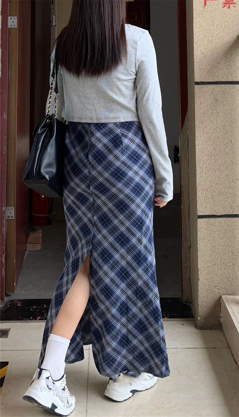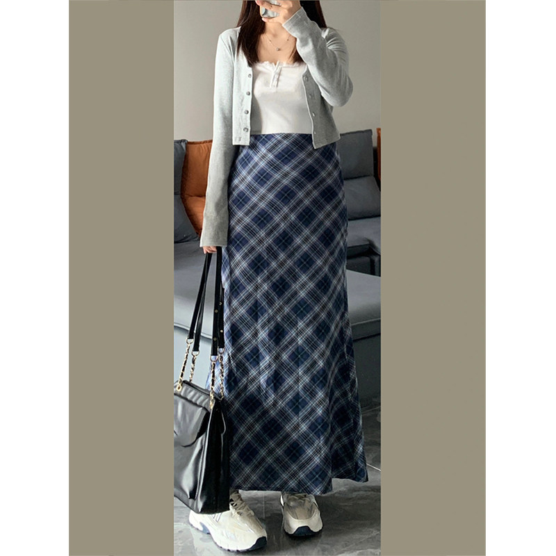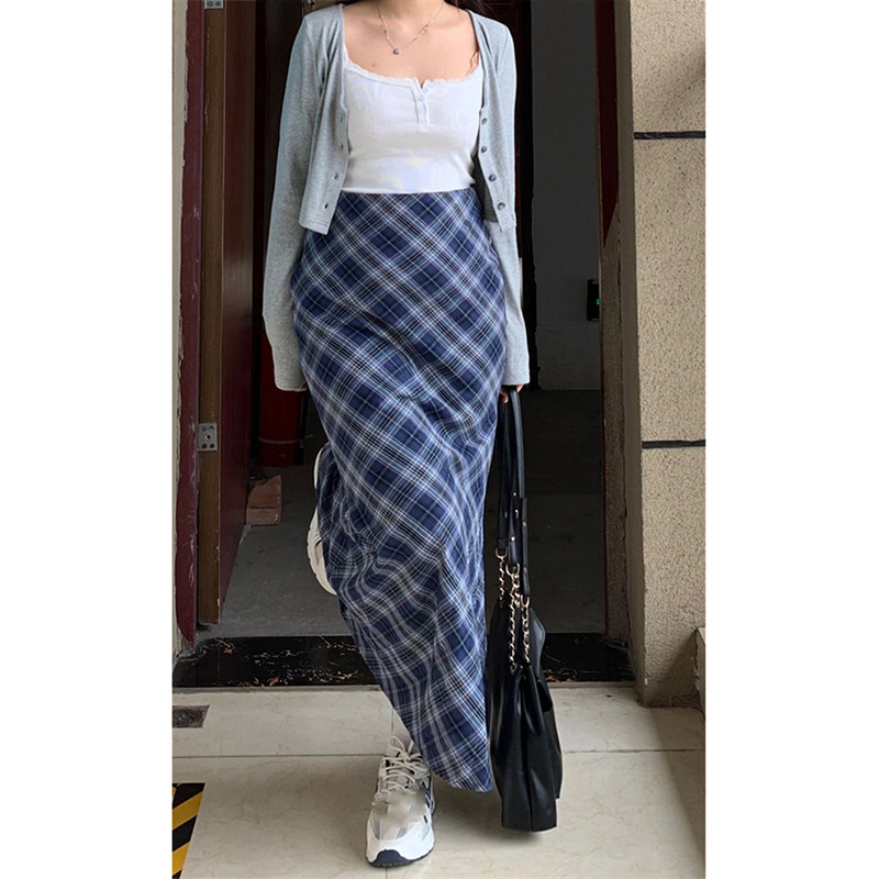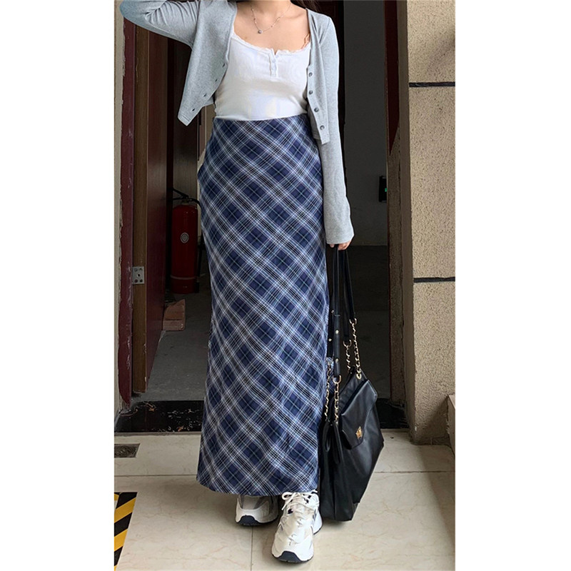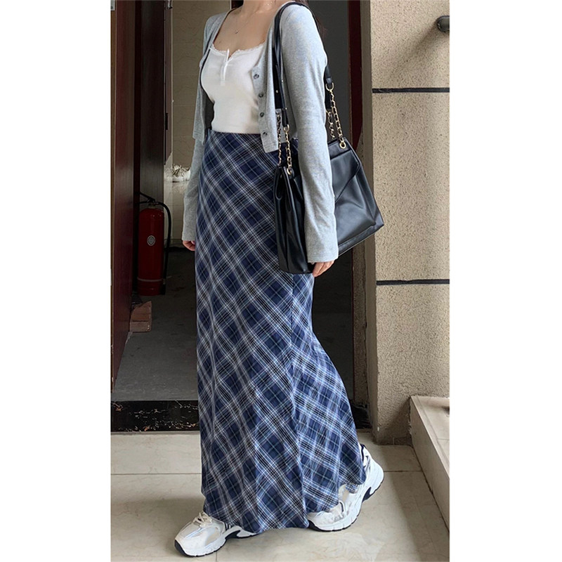 Синяя цветная клетчатая осенняя длинная юбка, 2024 года, большой размер, с акцентом на бедрах, А-силуэт