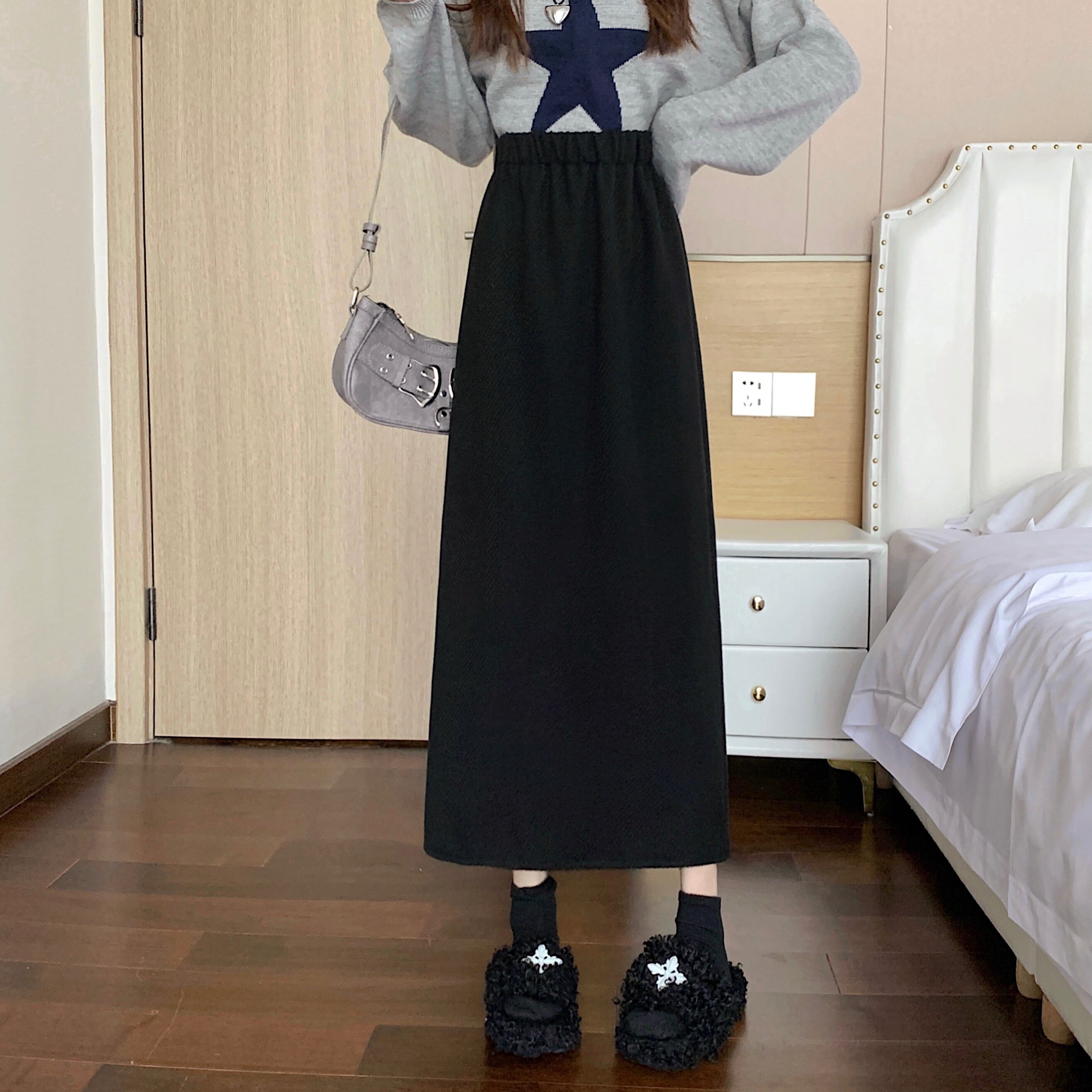 Черная демисезонная шерстяная длинная юбка, большой размер, высокая талия, с акцентом на бедрах, свободный прямой крой