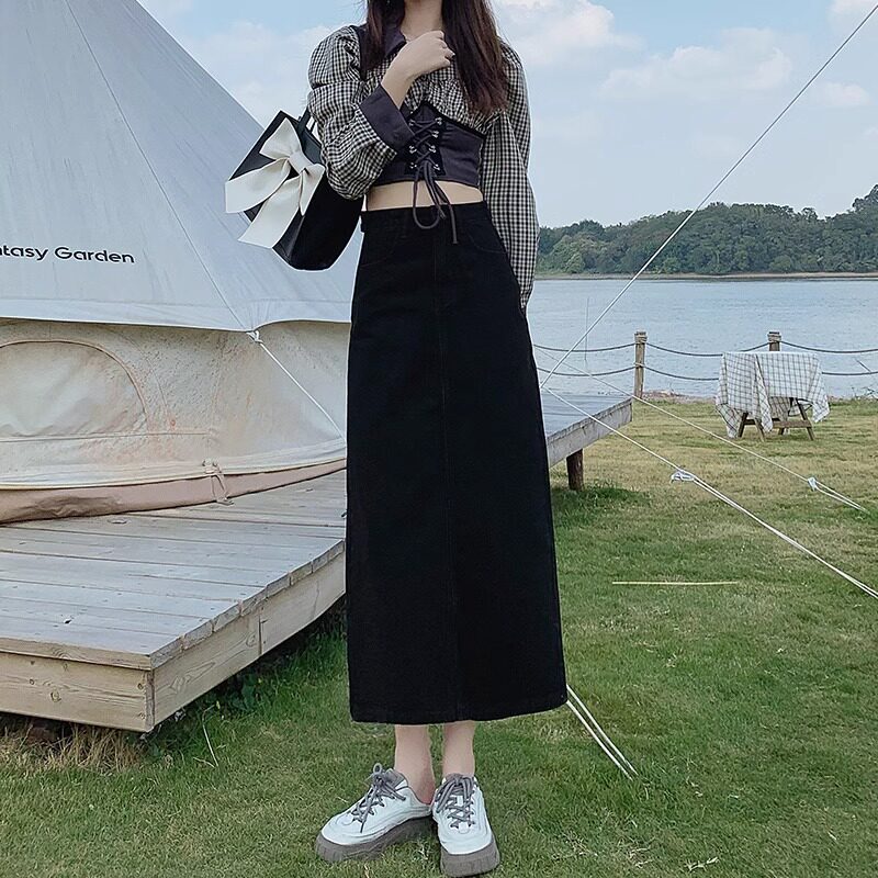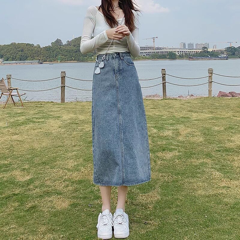 Осенняя дизайнерская длинная джинсовая юбка, высокая талия, тренд сезона, А-силуэт, длина миди, средней длины, с акцентом на бедрах
