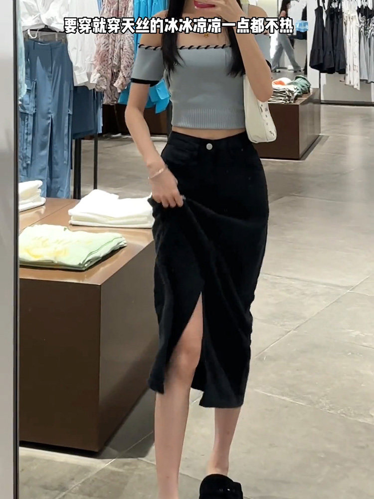 Черная летняя тонкая длинная шелковая джинсовая юбка, для формы тела «груша», средней длины