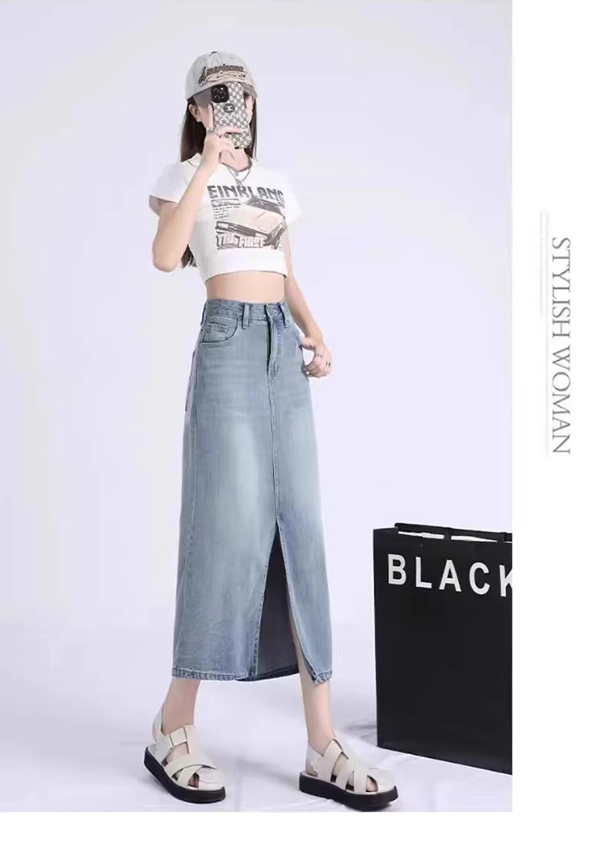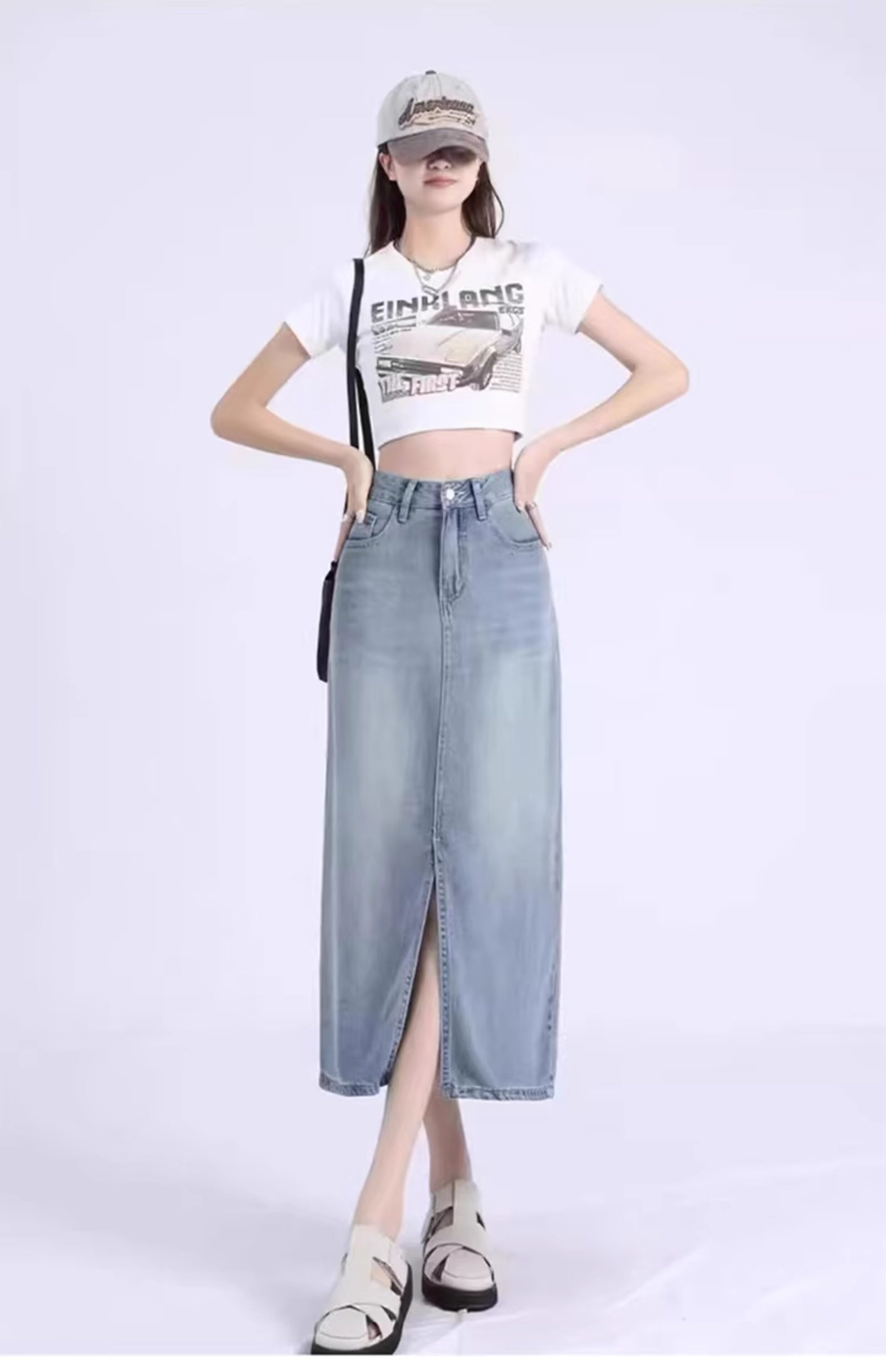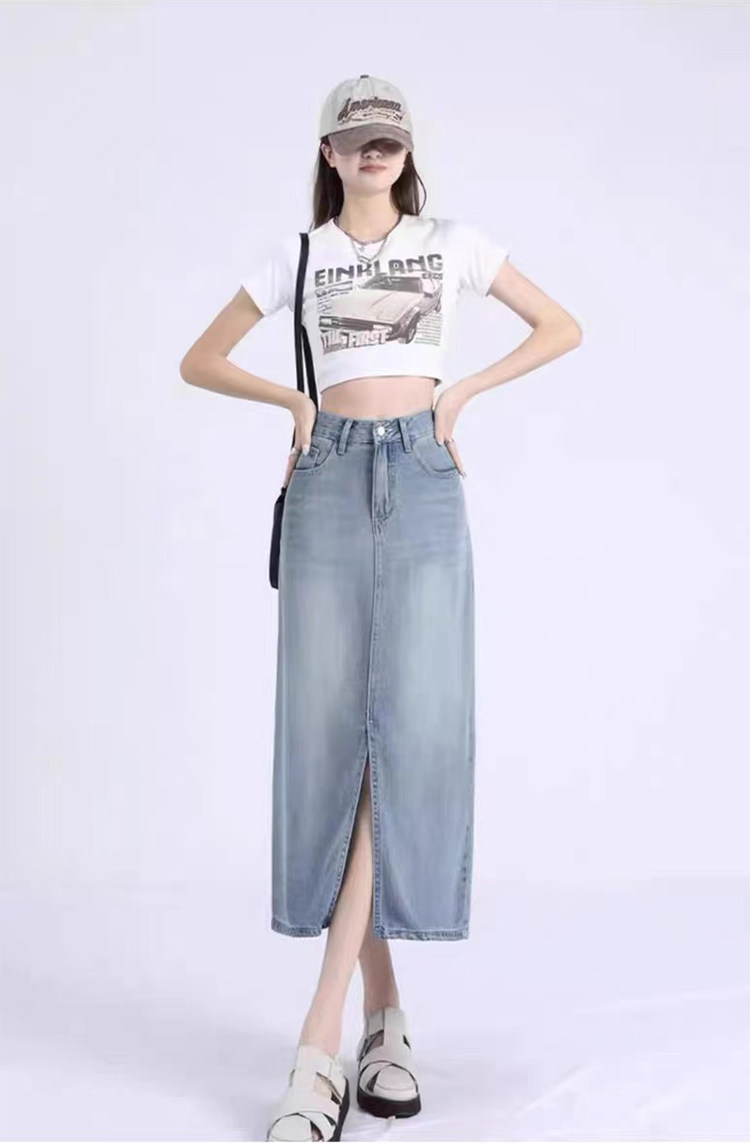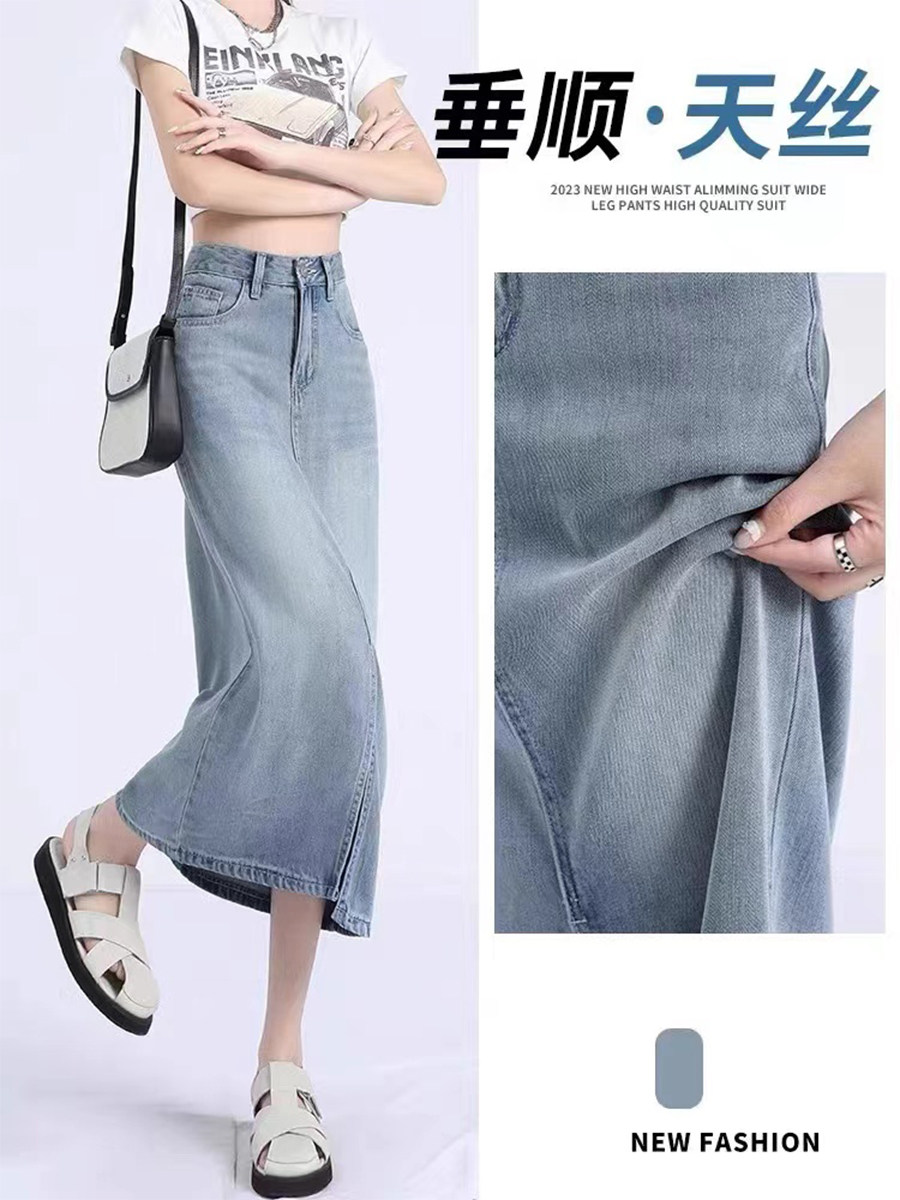 Летняя приталенная джинсовая юбка, высокая талия, длина миди, А-силуэт, с акцентом на бедрах