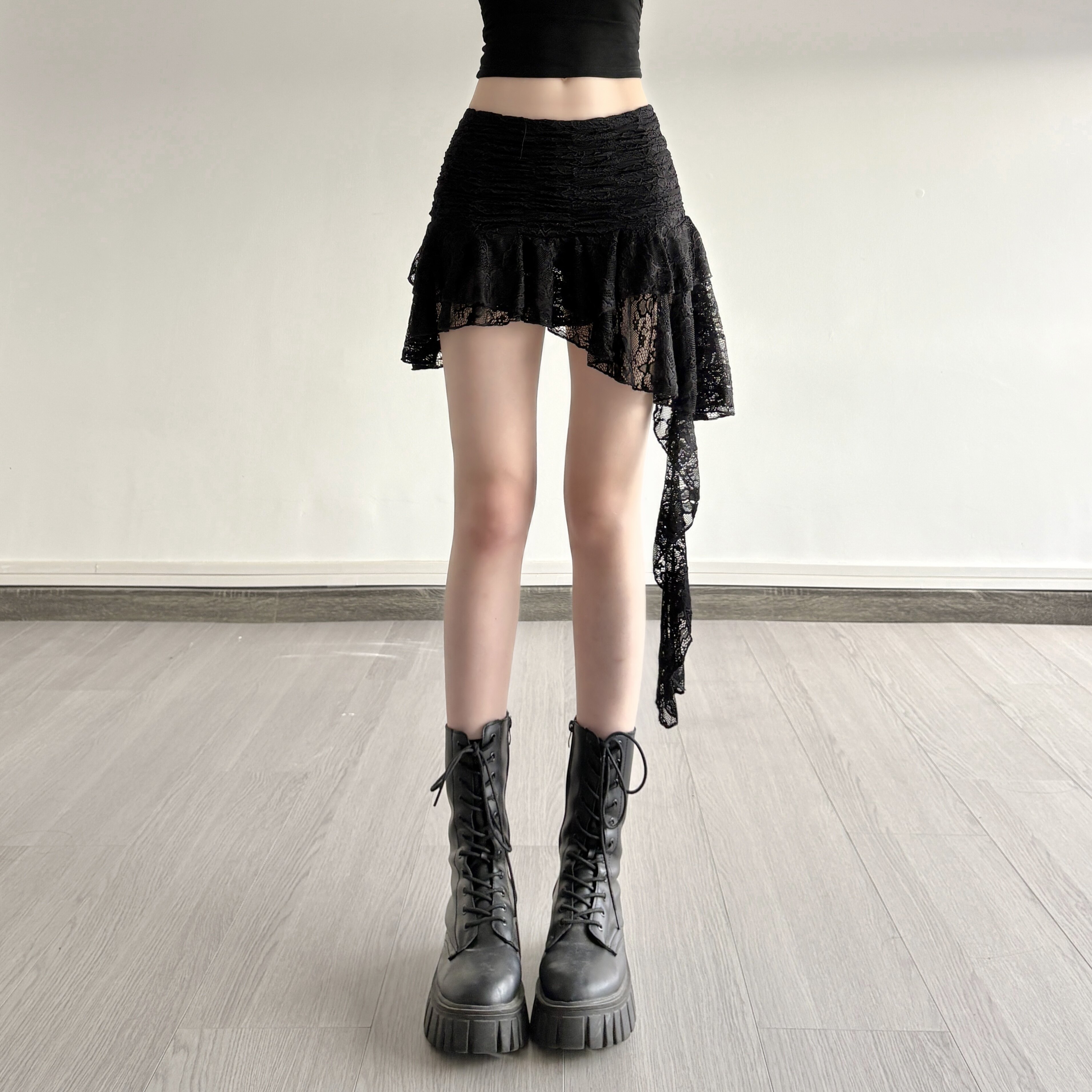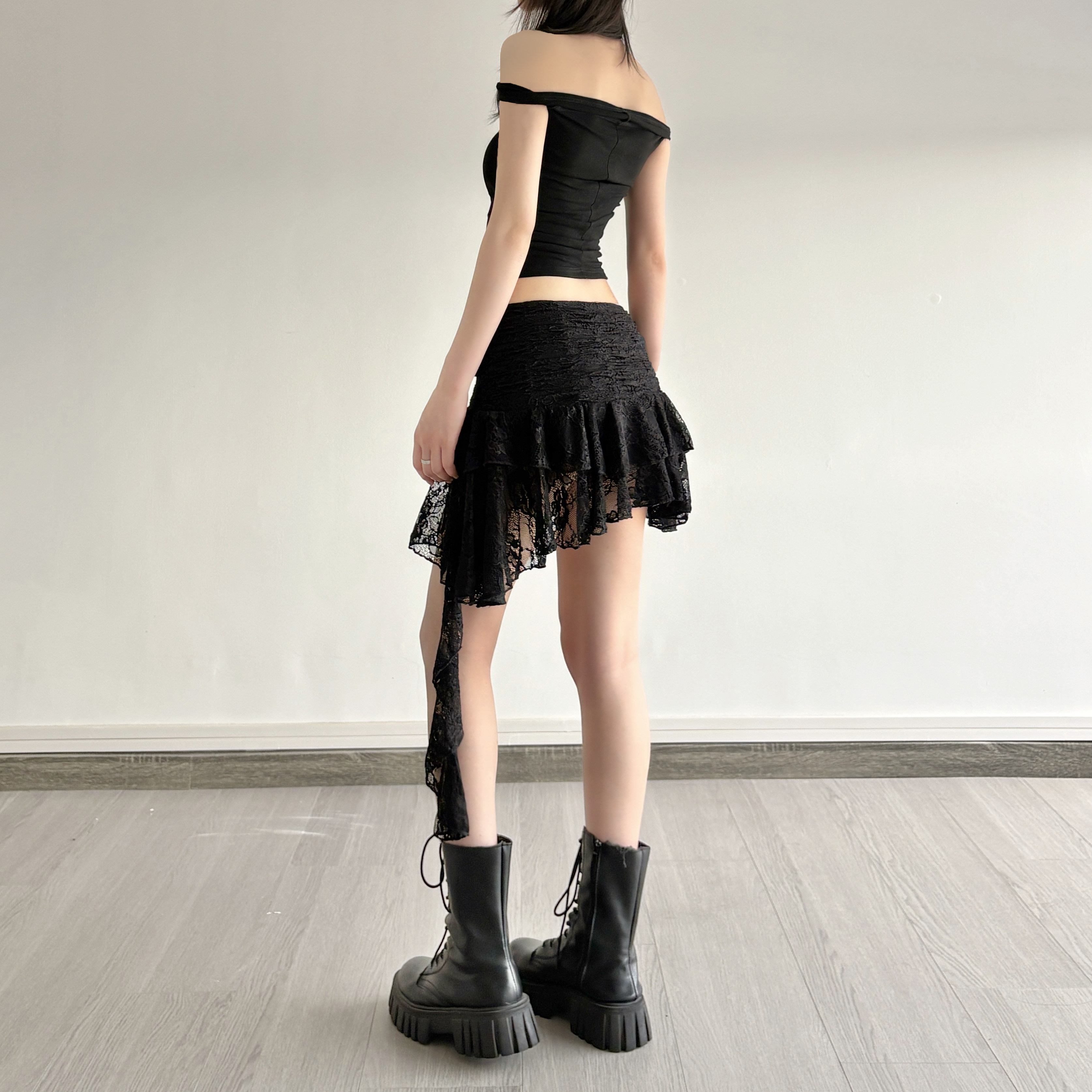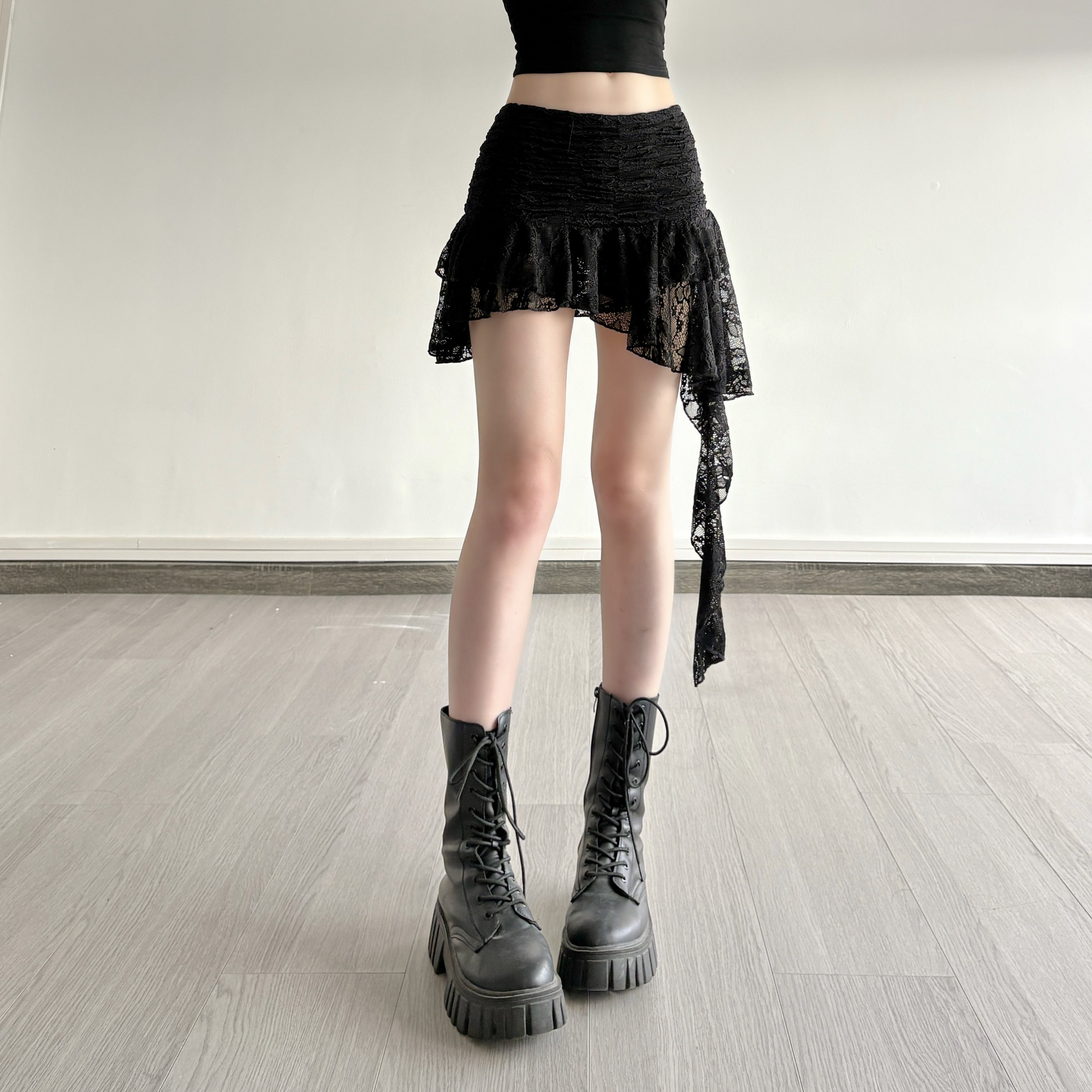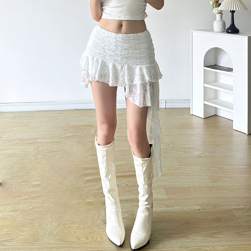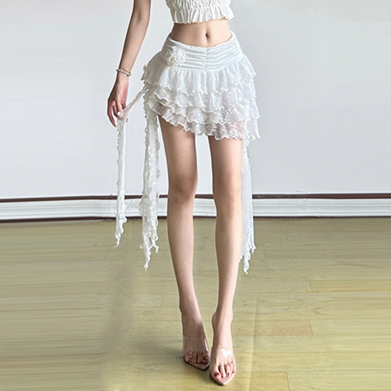 ROCKMORE [Pure Sexy] Юбка с рюшами и лентой нерегулярного края, узкая юбка трапециевидной формы с заниженной талией