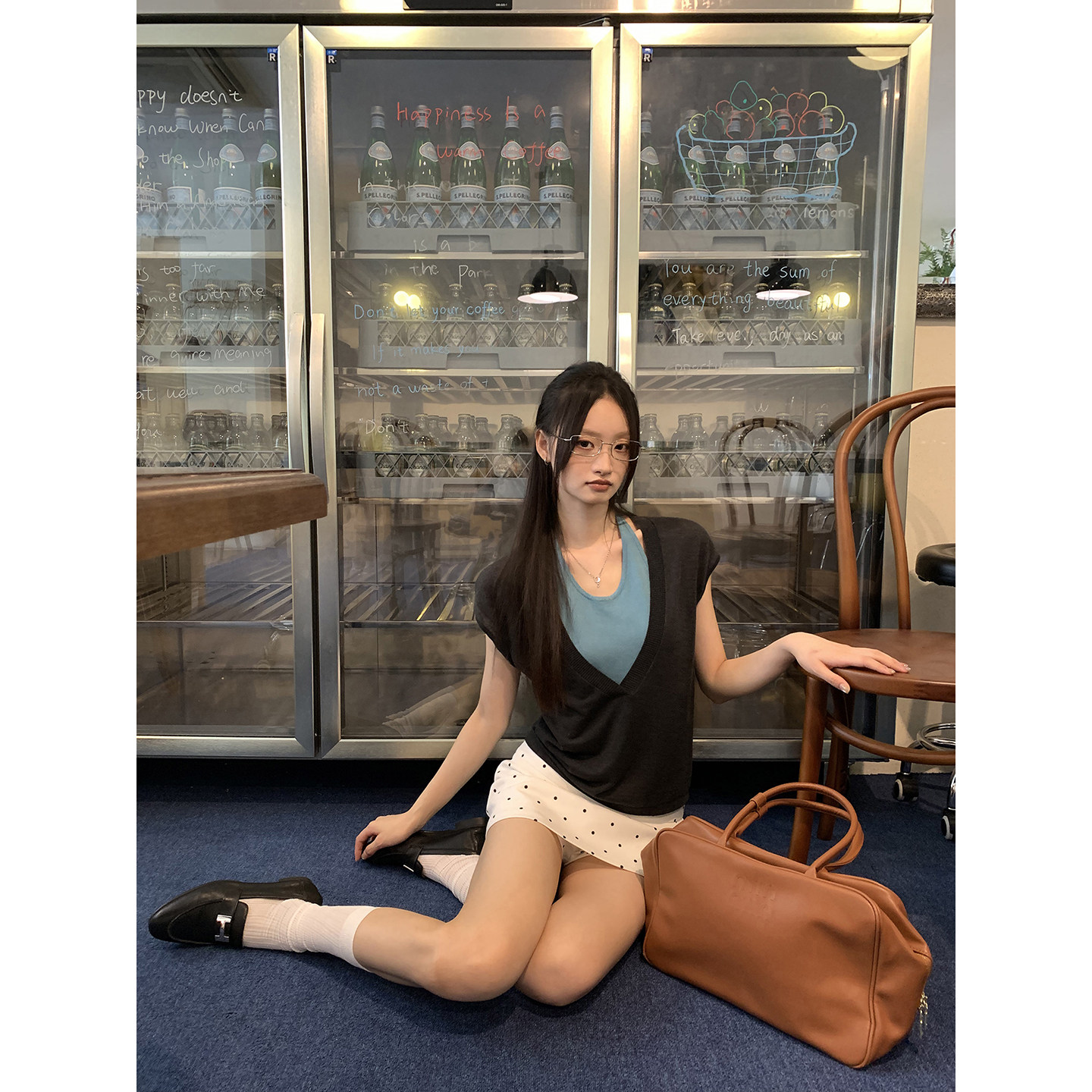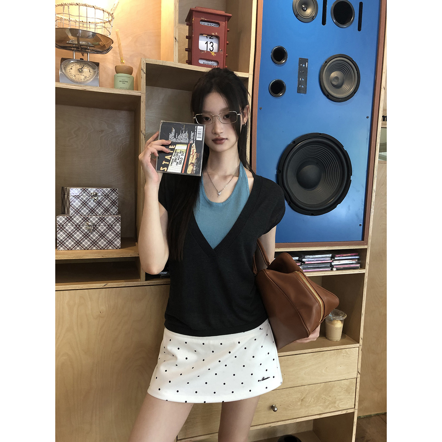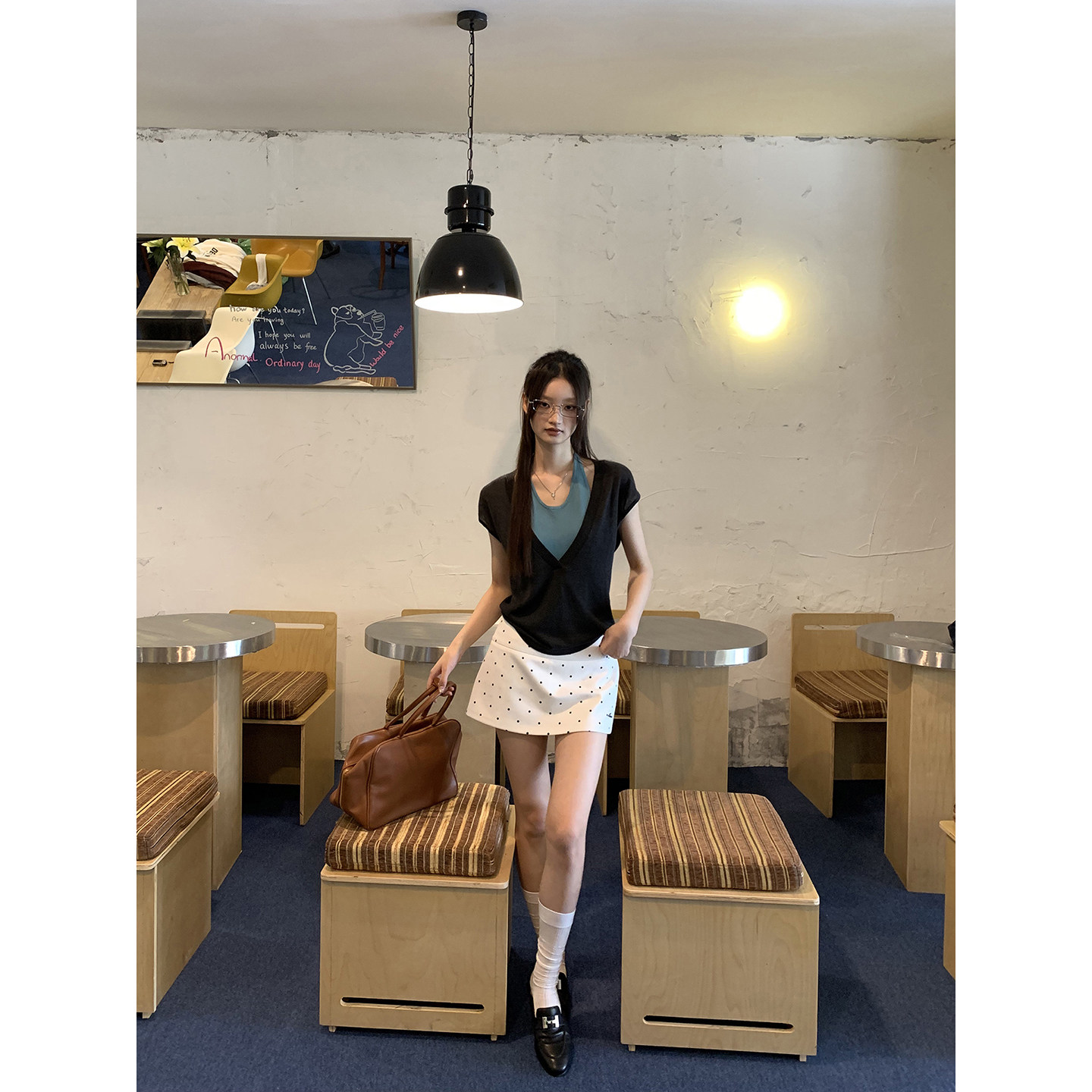 Высокая талия подчеркивает линию талии, а металлическая буква придает изделию изысканность.
