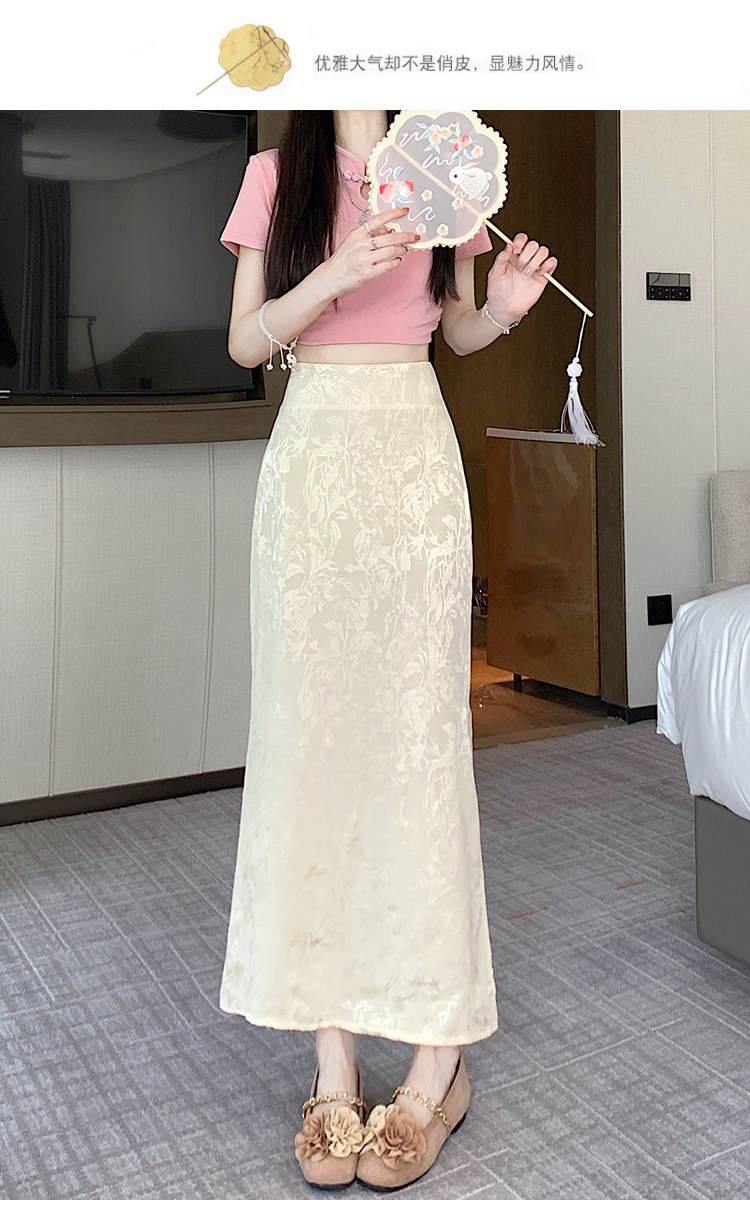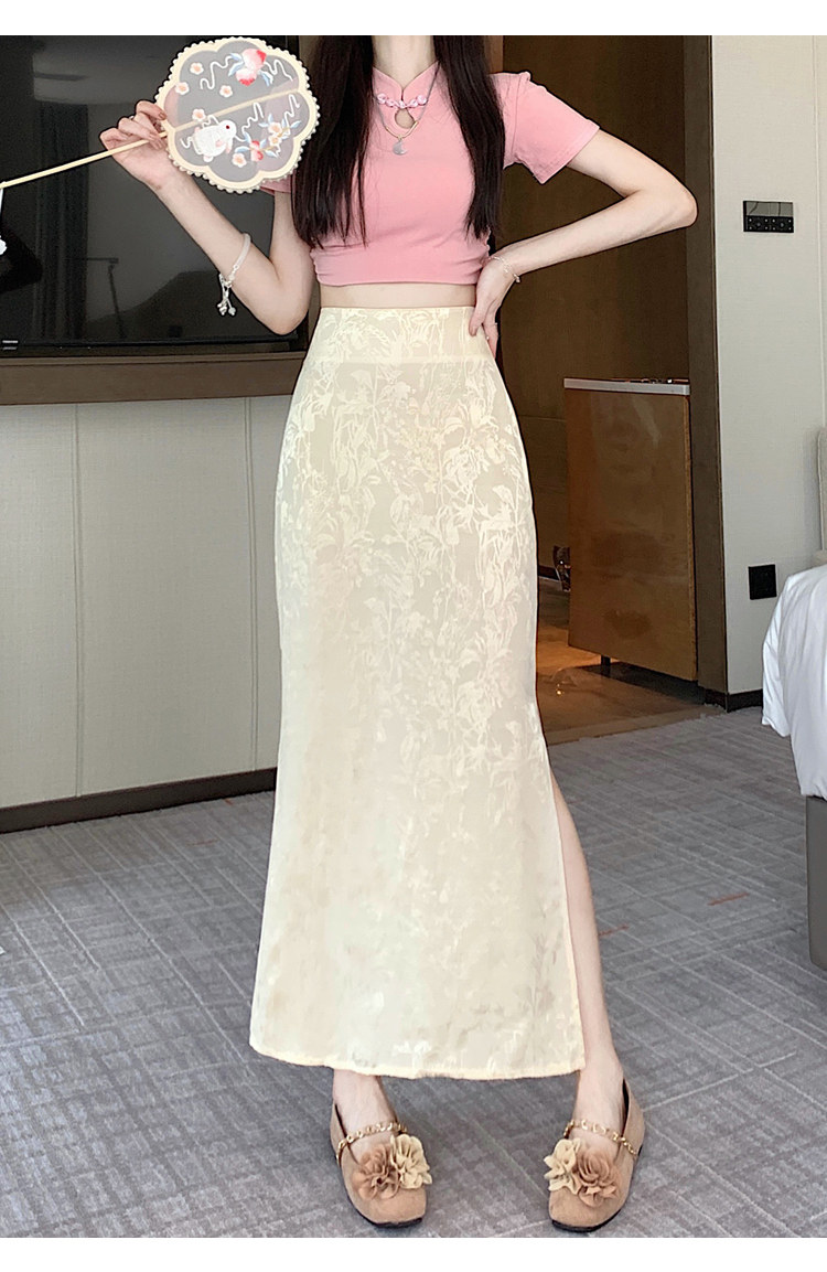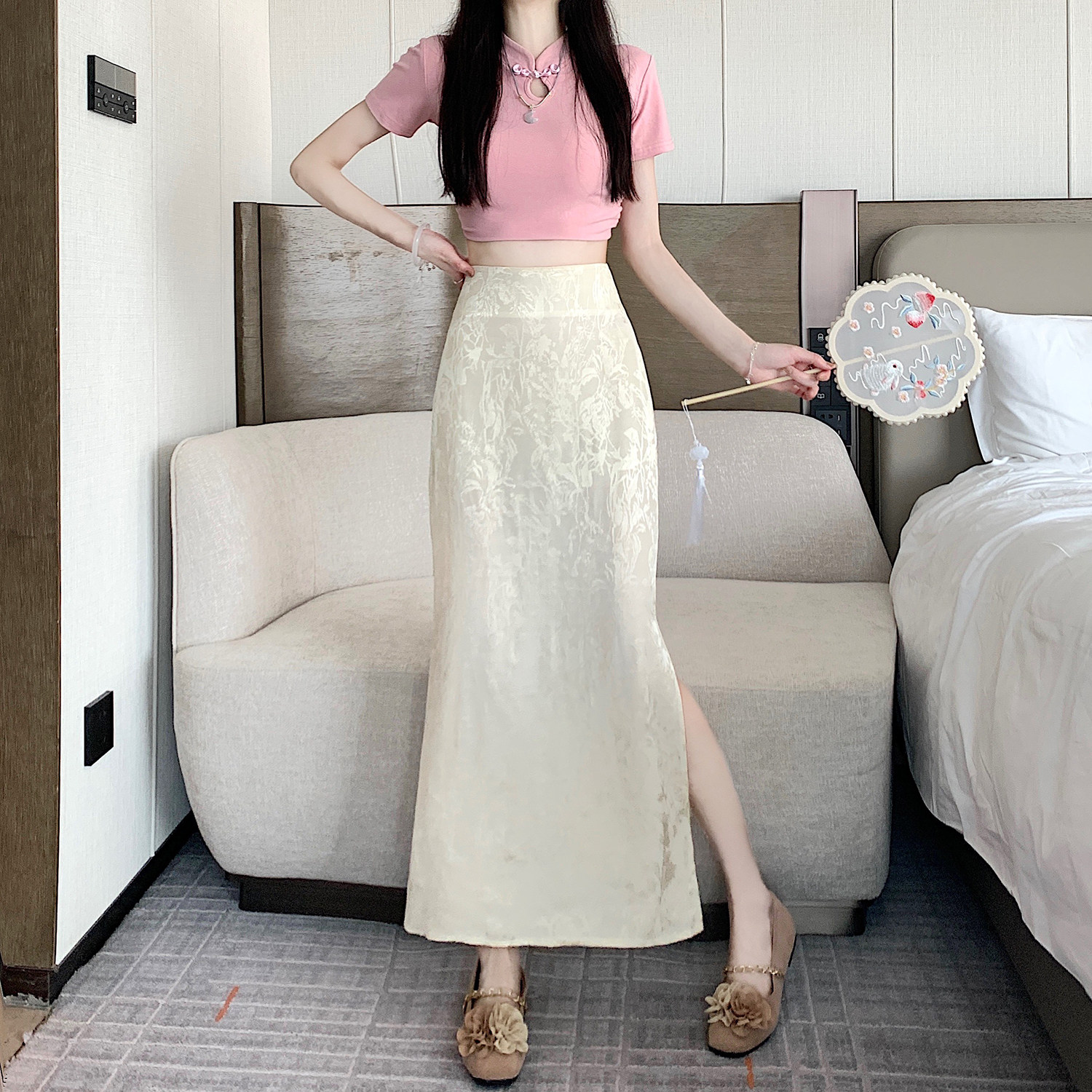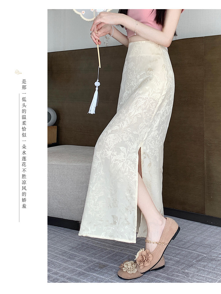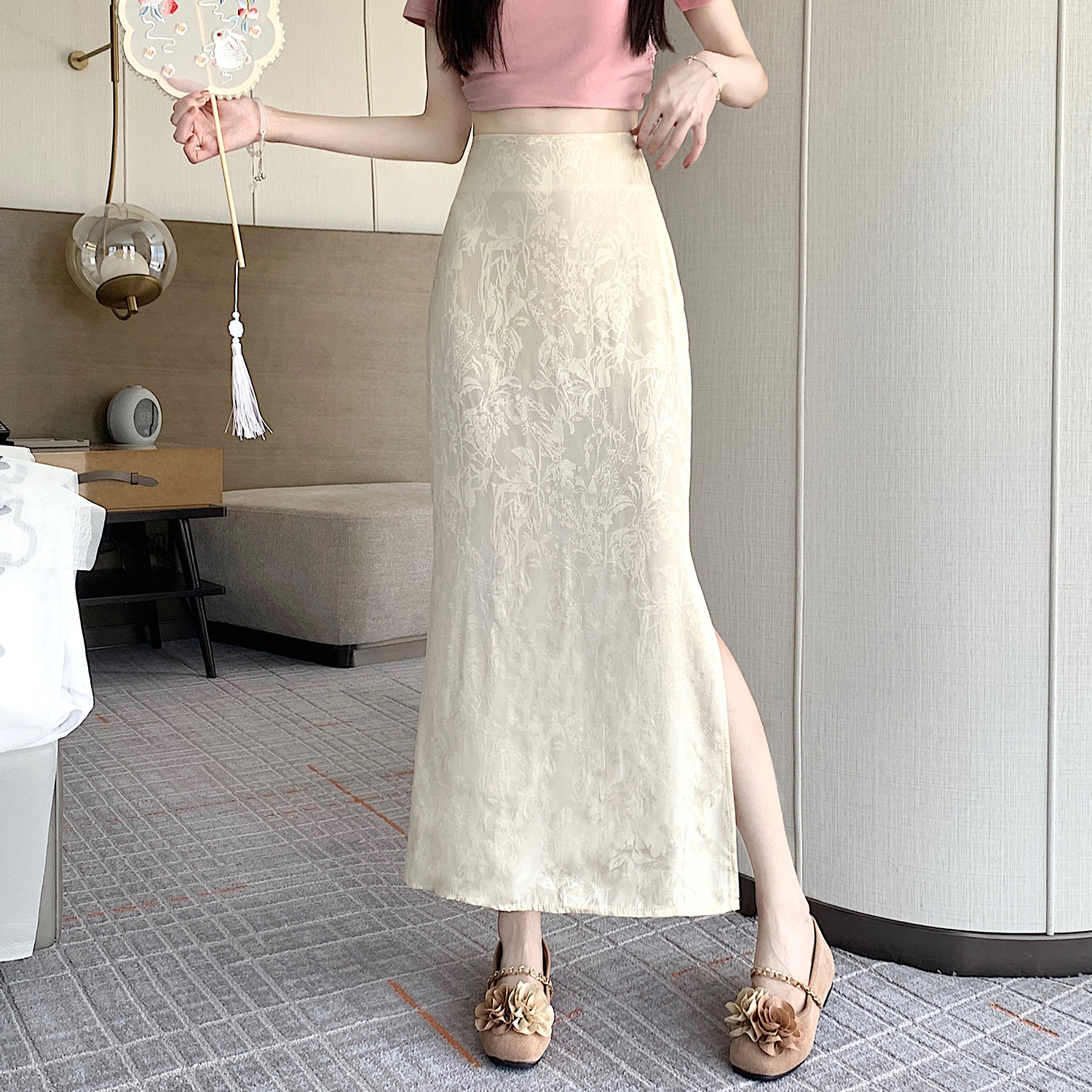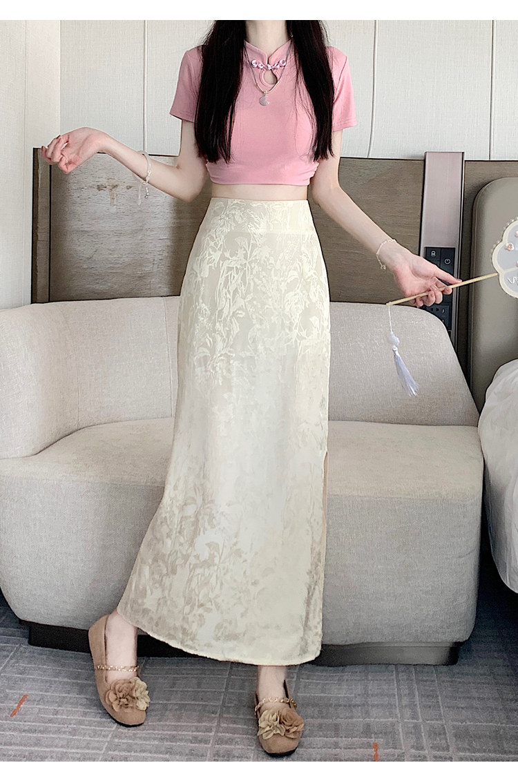 Бежевая летняя юбка, с акцентом на бедрах, китайский стиль, длина миди