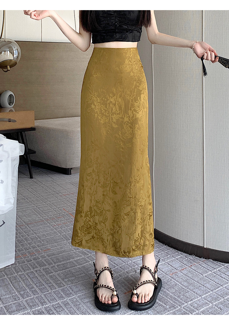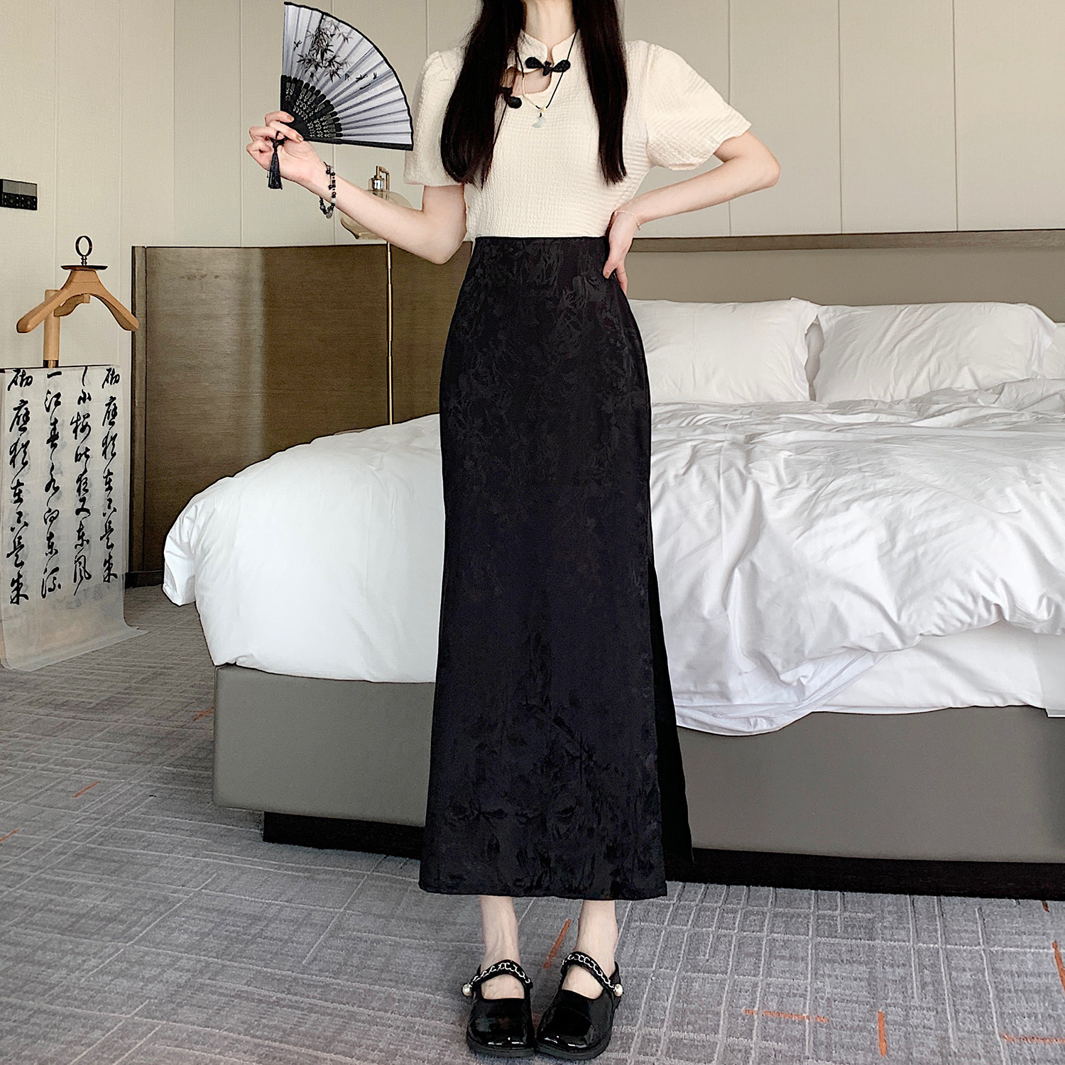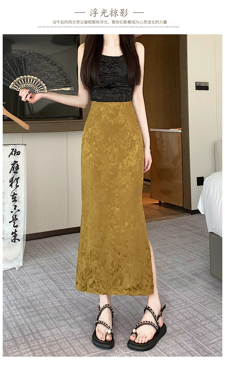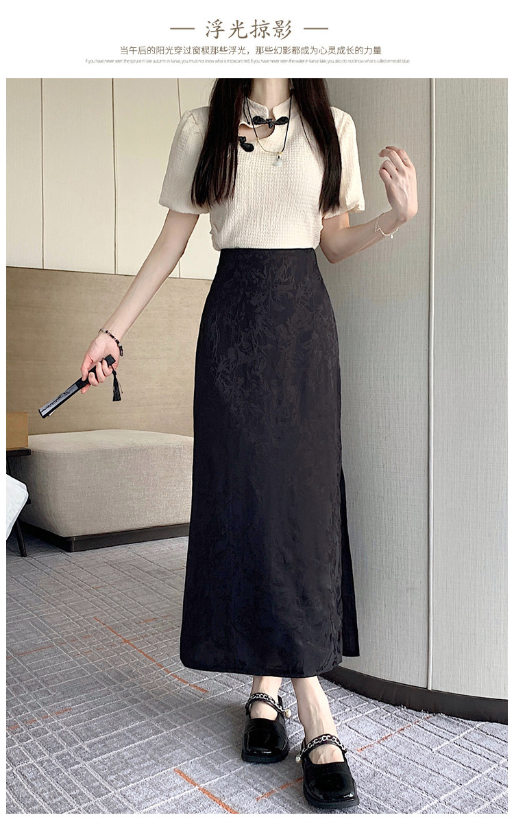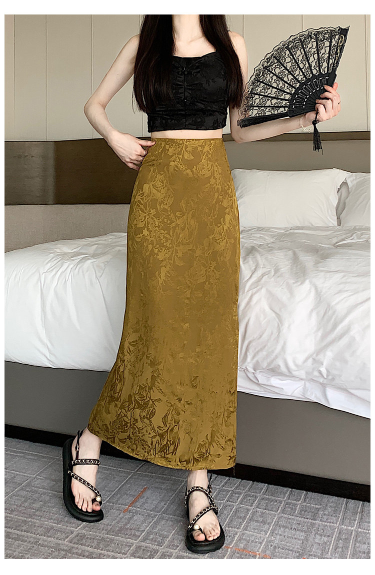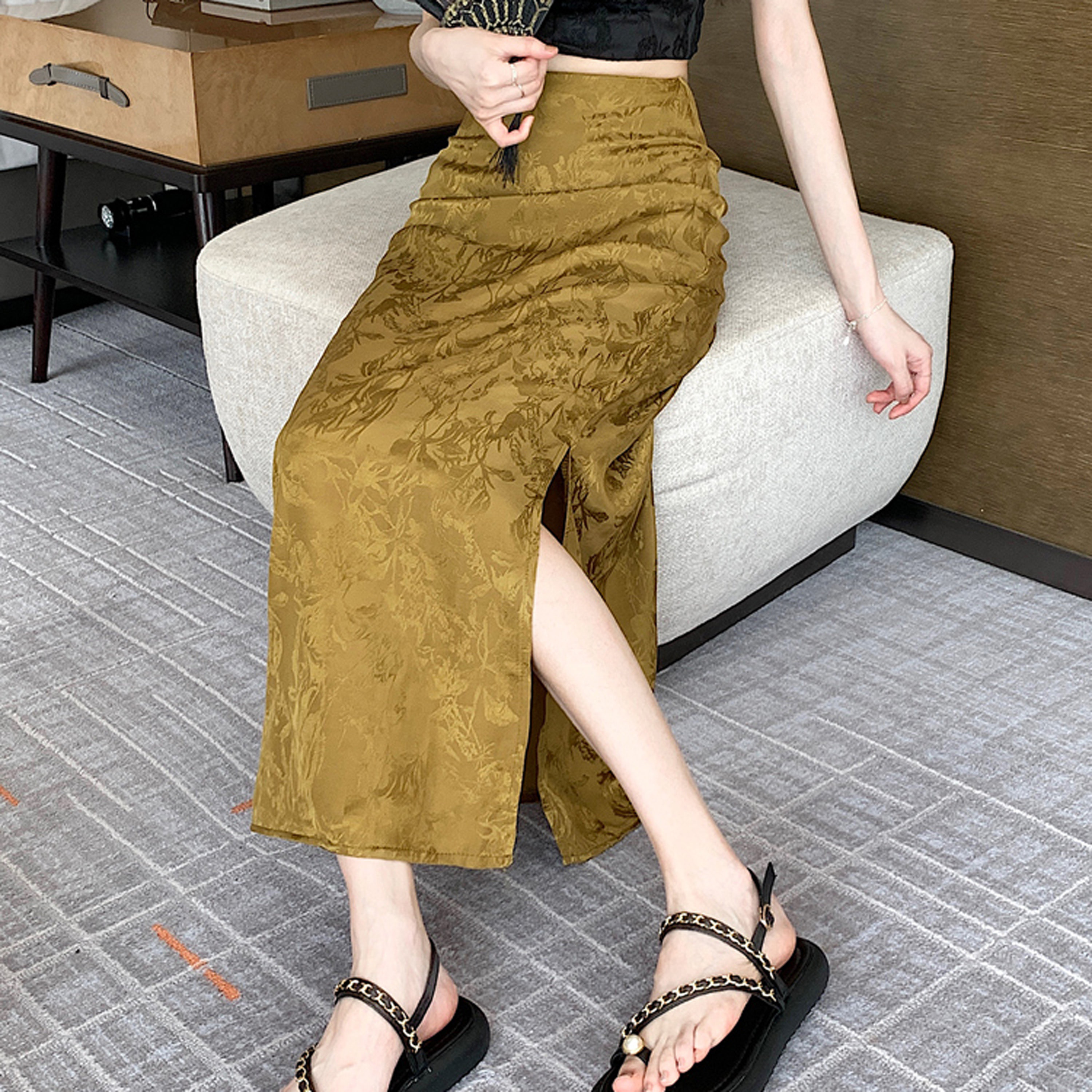 Бежевая летняя юбка, с акцентом на бедрах, китайский стиль, длина миди