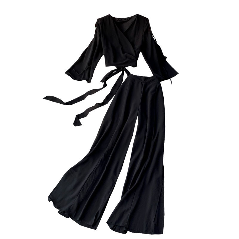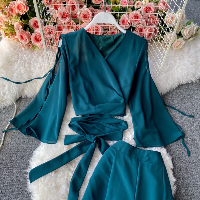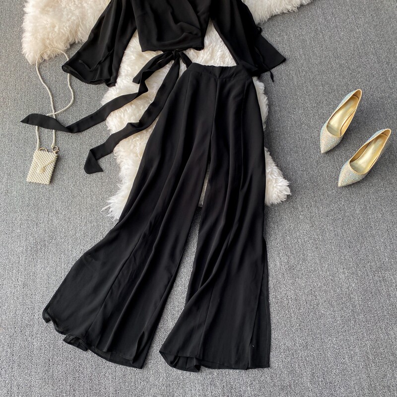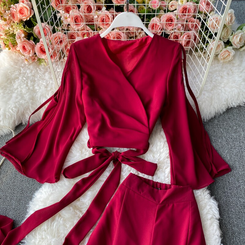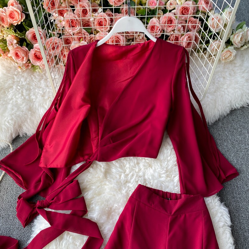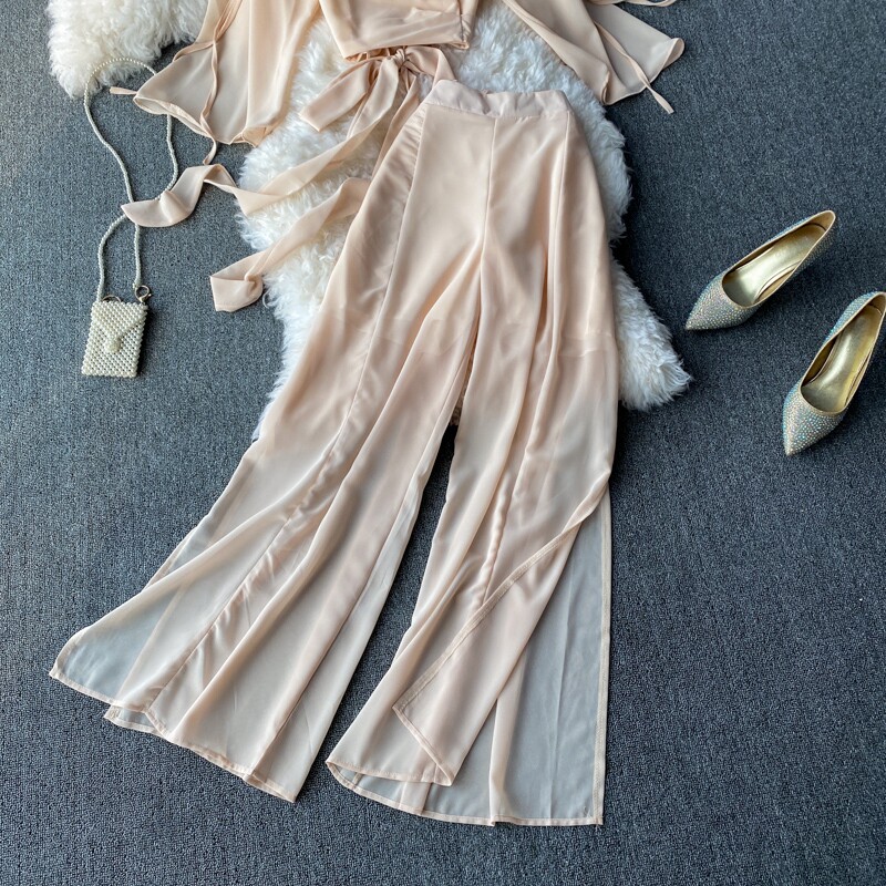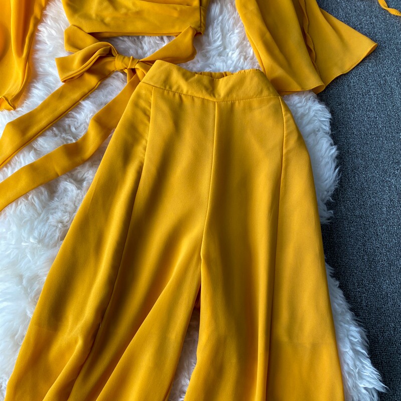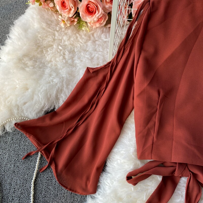 Ремень с бантиком, короткий шифоновый корсет, мегафон, комплект, штаны, V-образный вырез, высокая талия