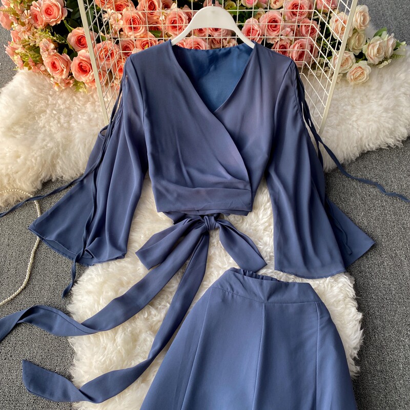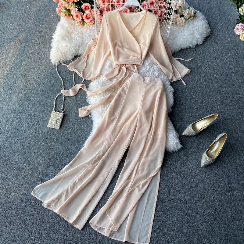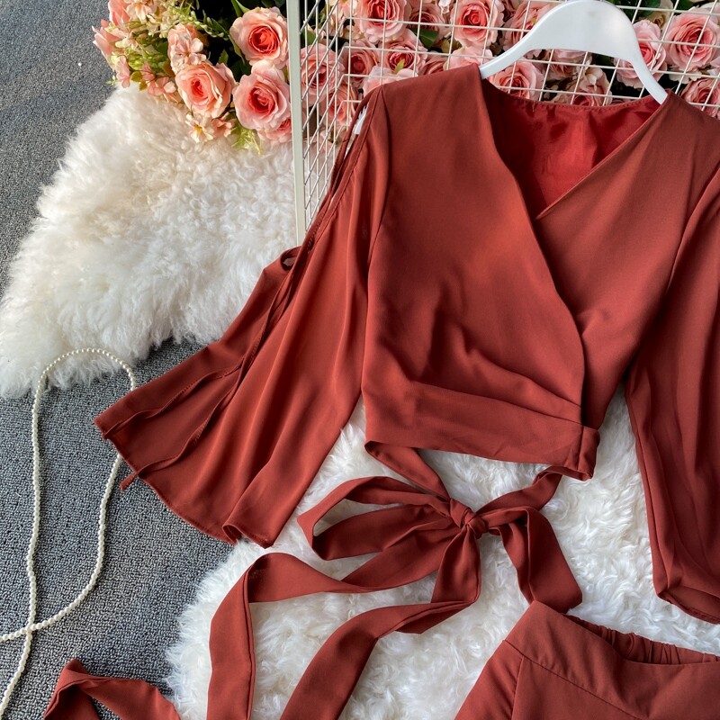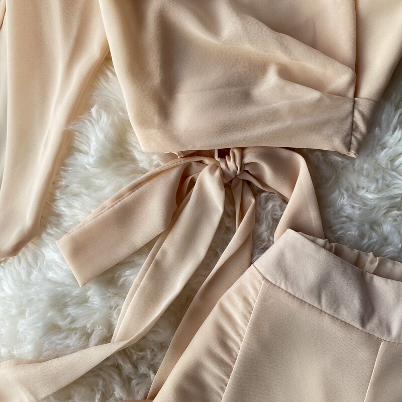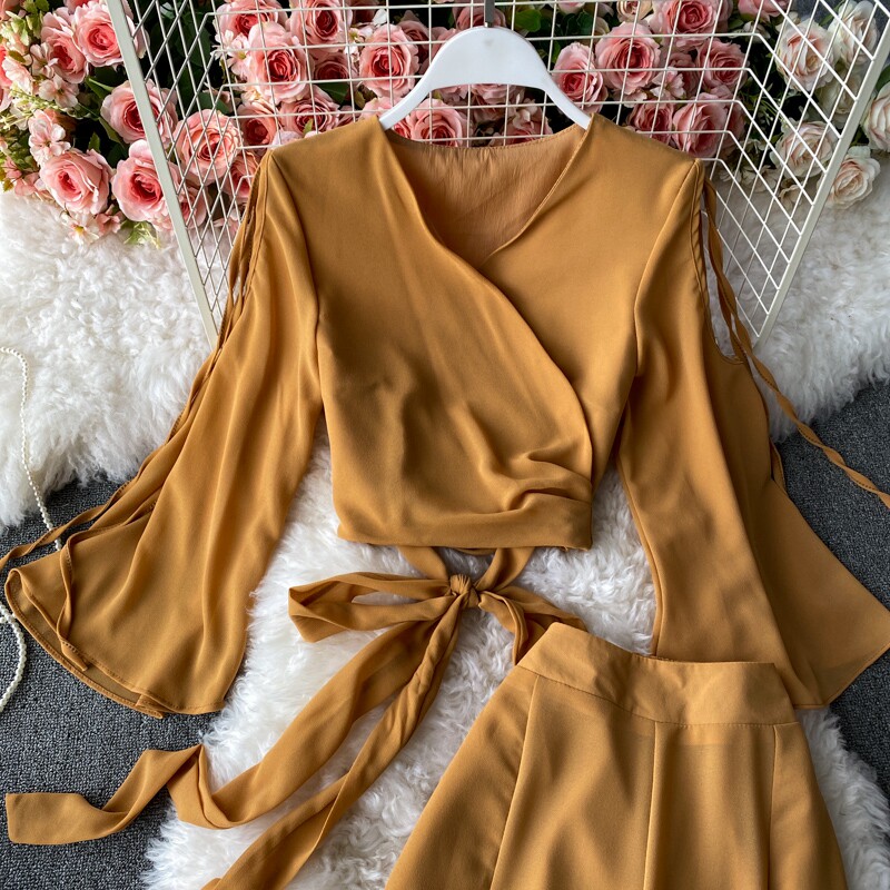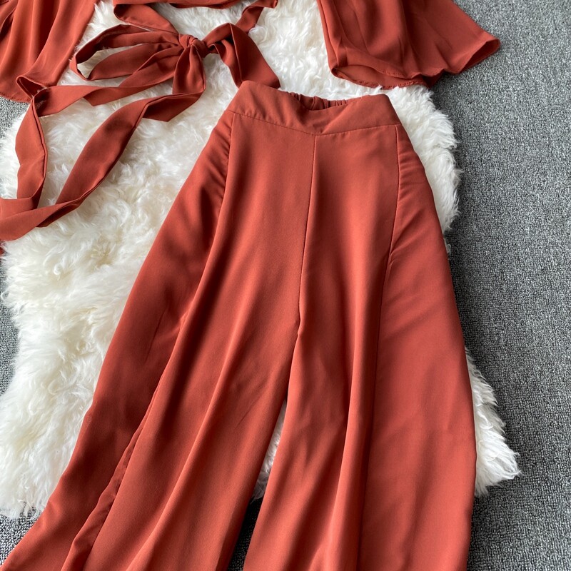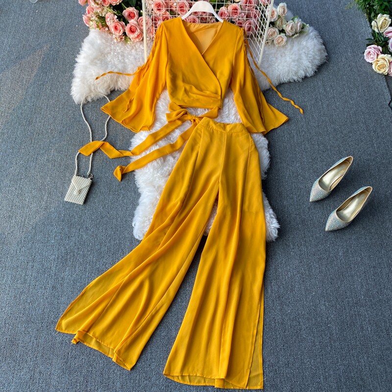 Ремень с бантиком, короткий шифоновый корсет, мегафон, комплект, штаны, V-образный вырез, высокая талия