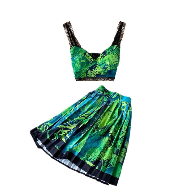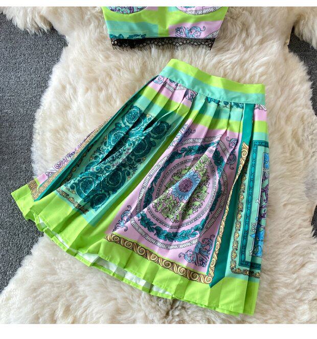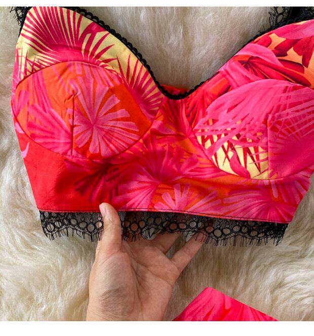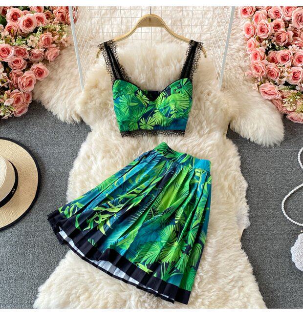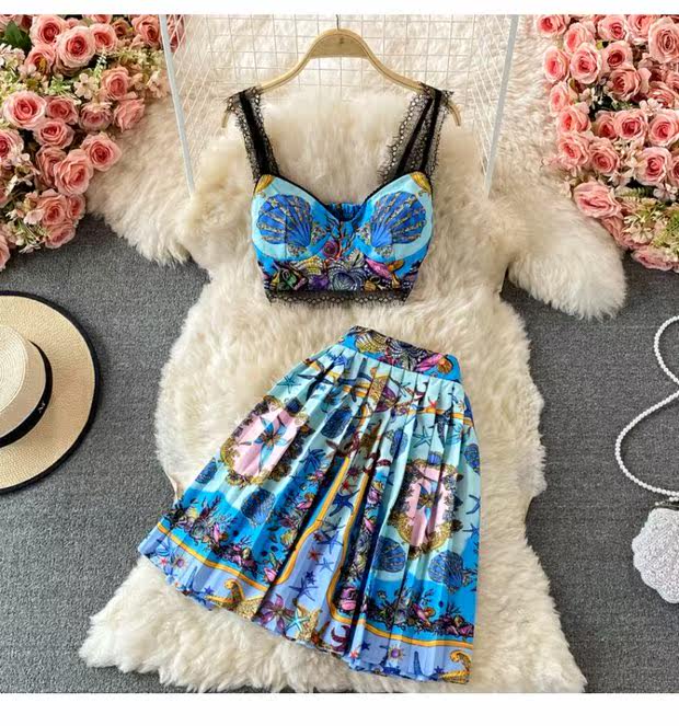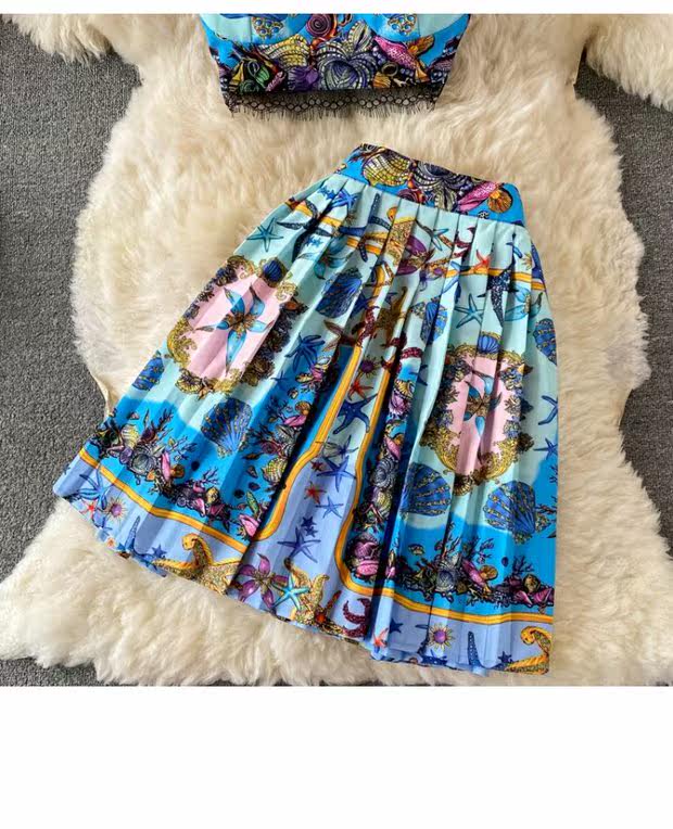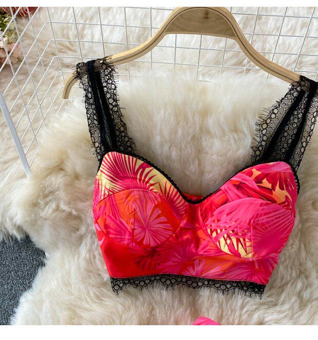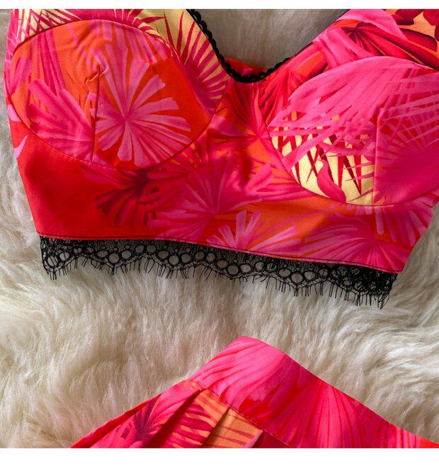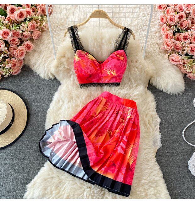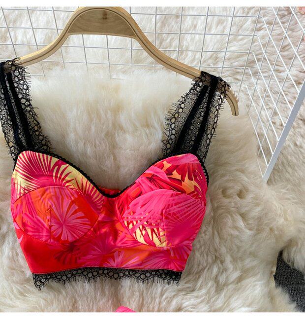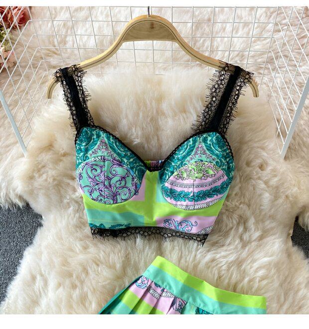 Кружевной комплект, топ с чашечками, бюстгальтер-топ, юбка в складку, в западном стиле, высокая талия