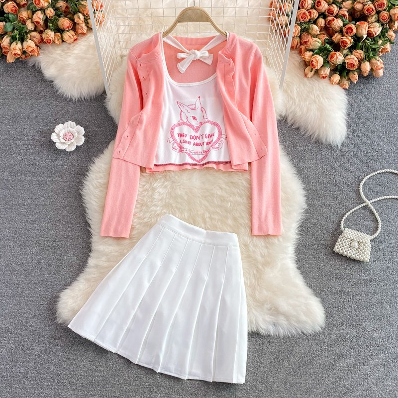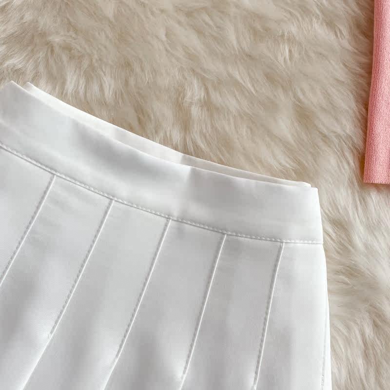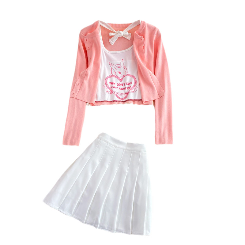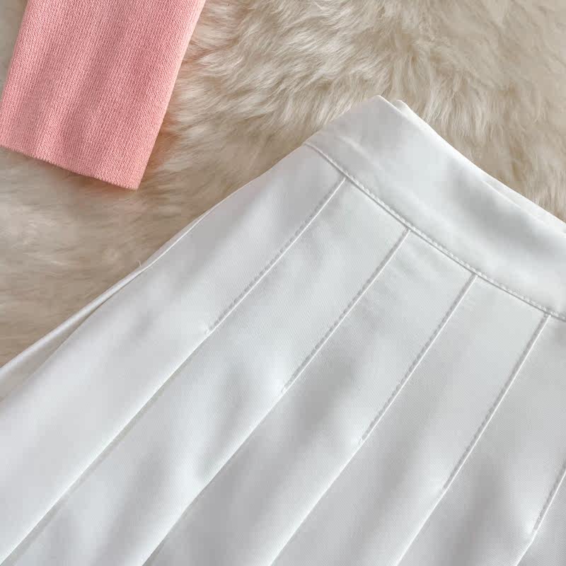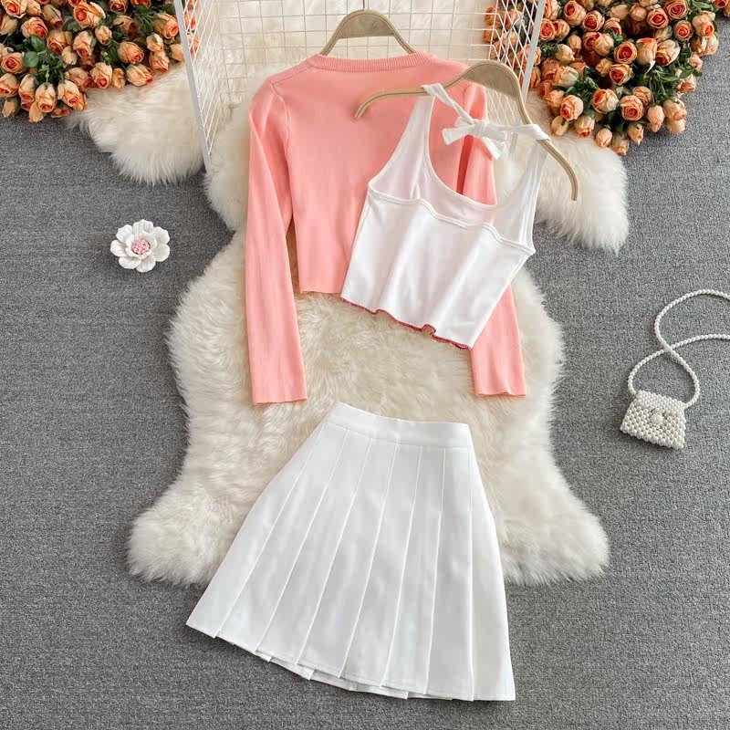 Розовая майка, топ с чашечками, комплект, юбка в складку, защита от солнца, открытые плечи, 3 предмета, высокая талия