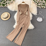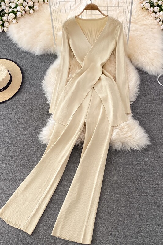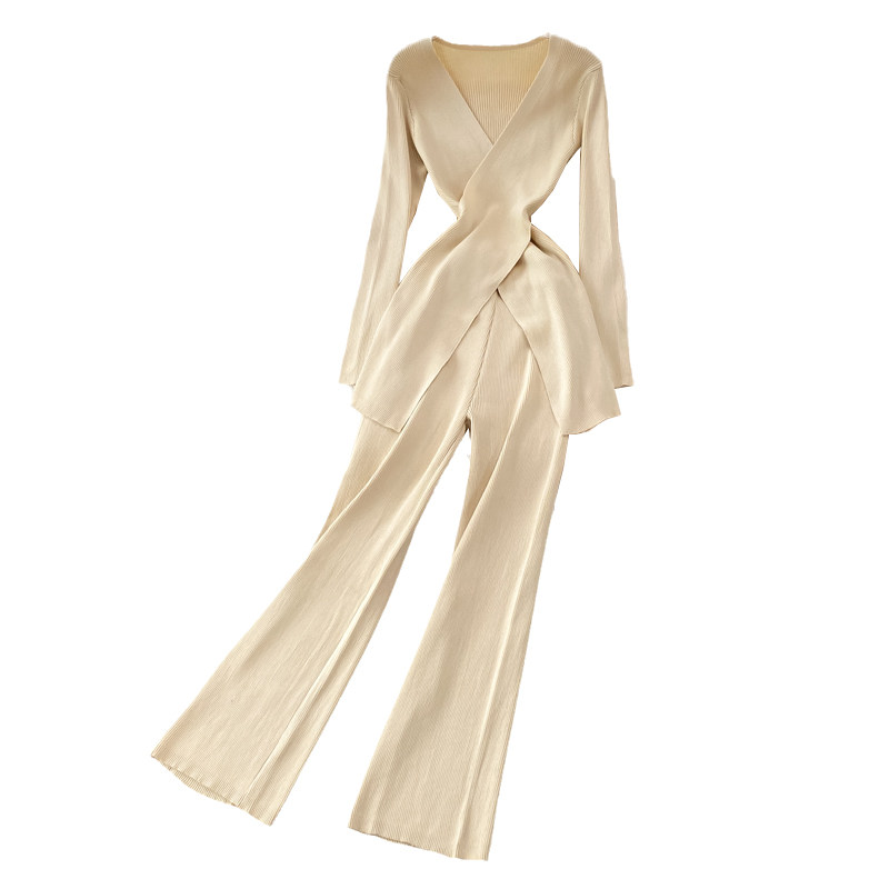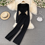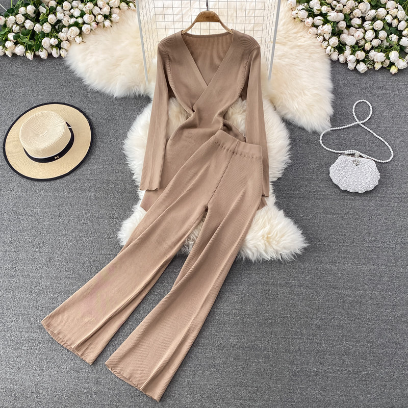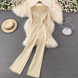 Трикотажные штаны, длинный комплект, эластичная талия, высокая талия, свободный прямой крой, V-образный вырез, средней длины