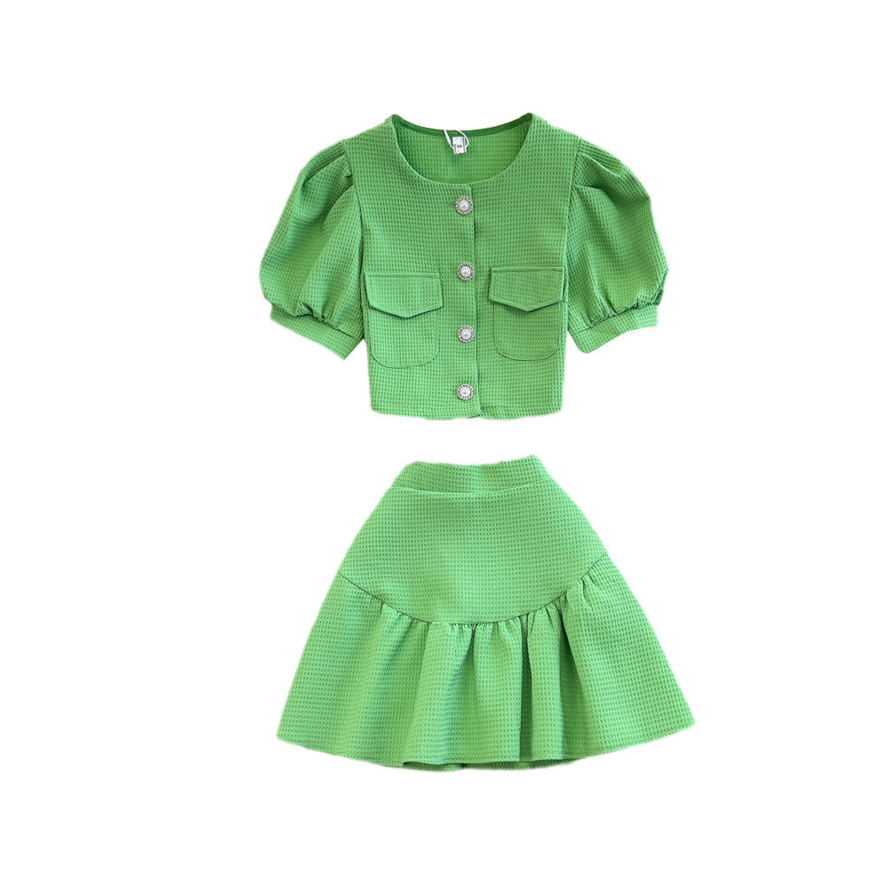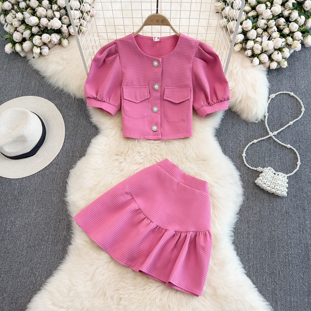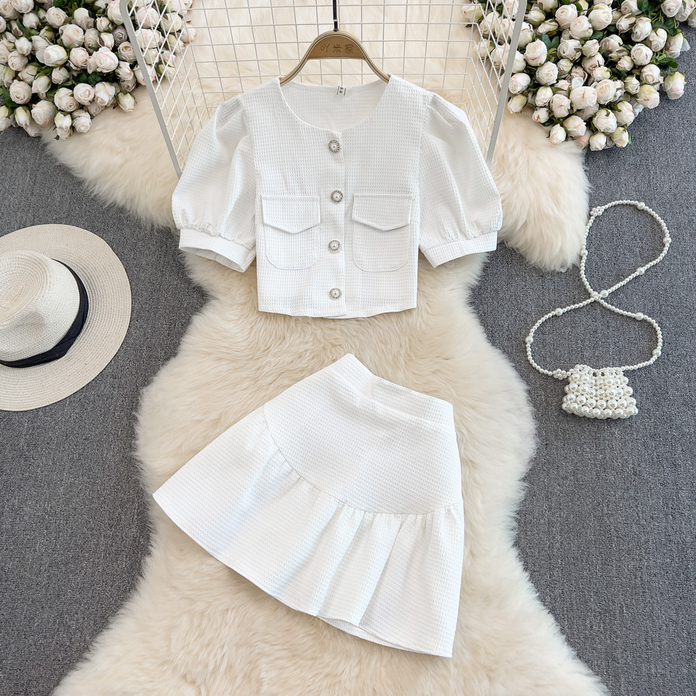 Комплект с круглым воротником, юбка из жемчуга, в стиле Шанель, рукава фонарики, высокая талия