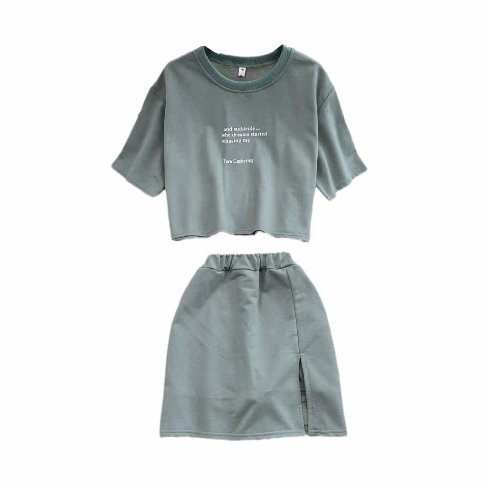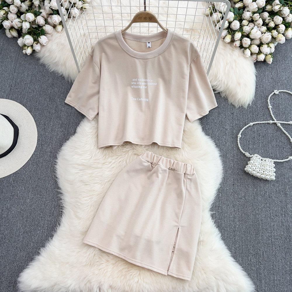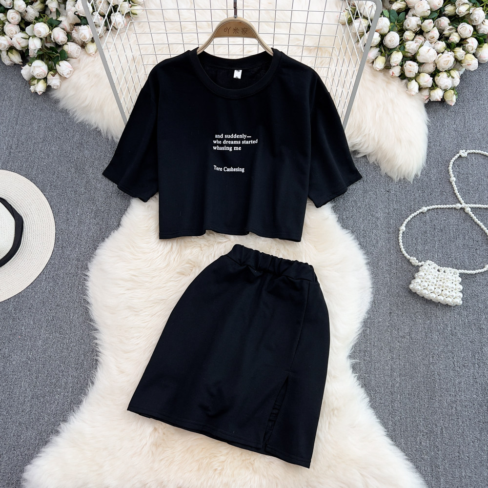 Комплект с круглым воротником, футболка с буквами, юбка, высокая талия, с акцентом на бедрах