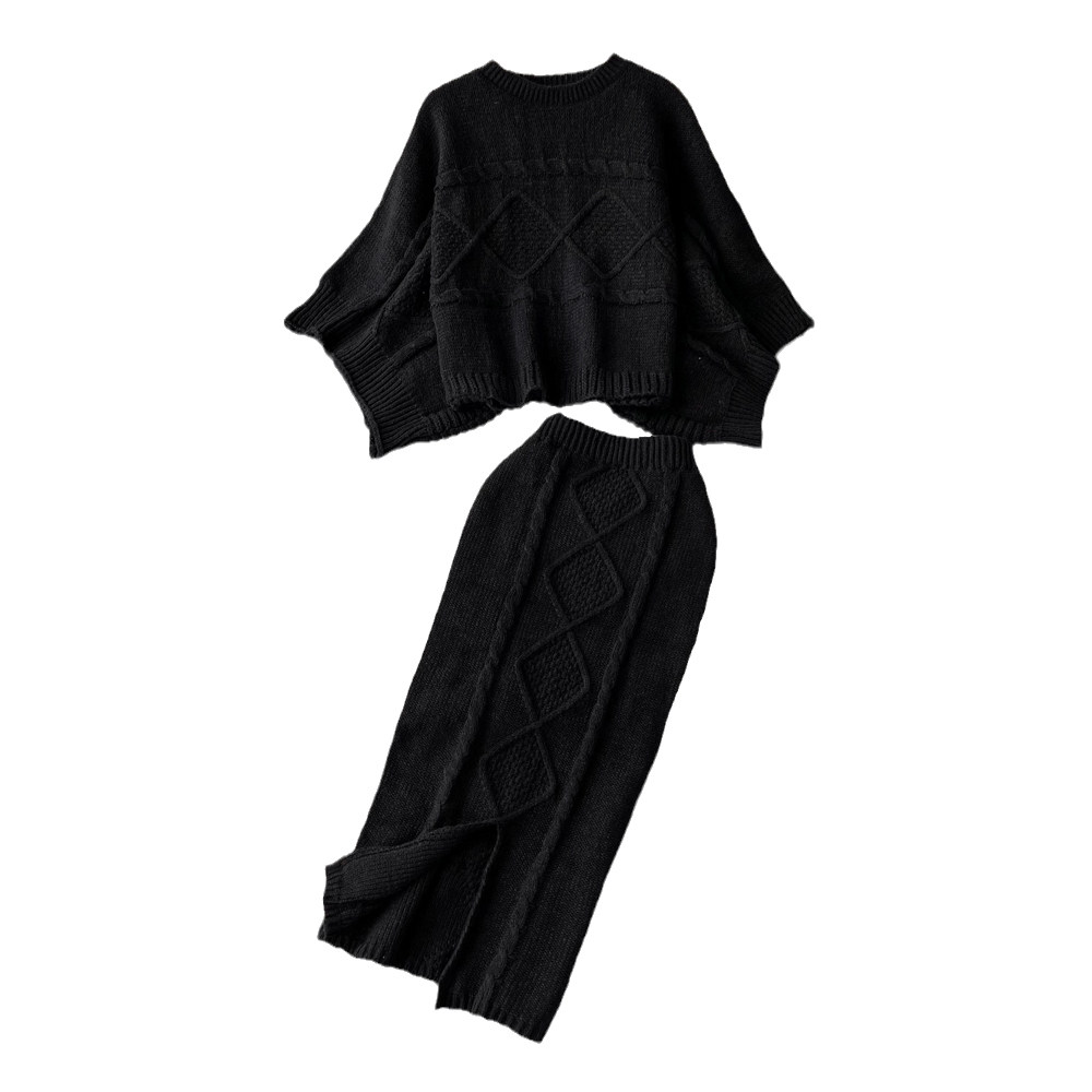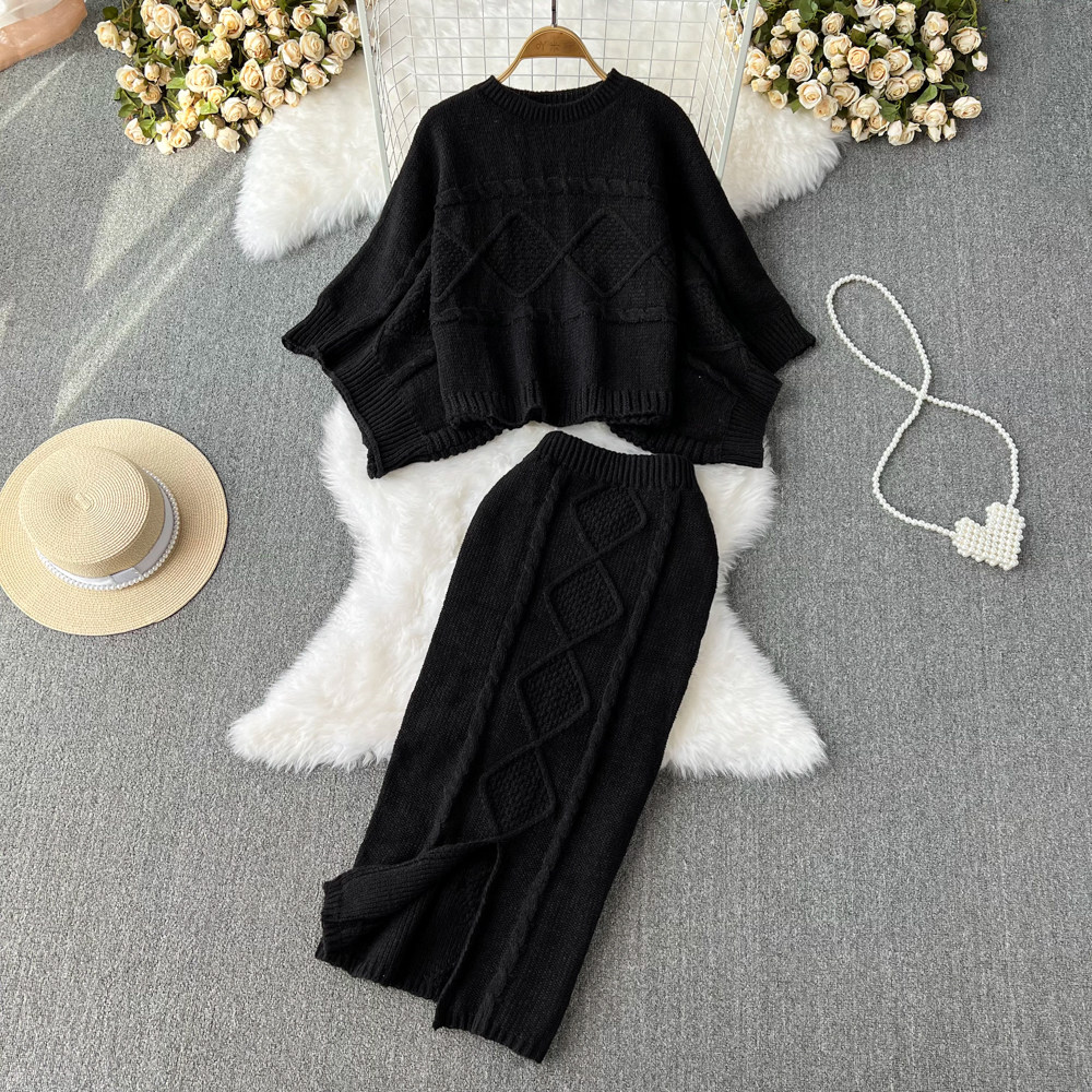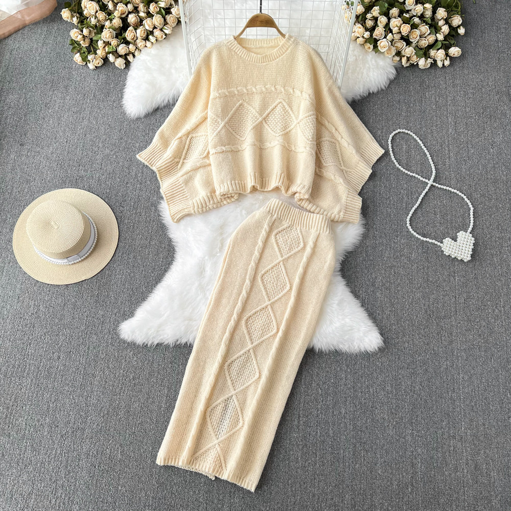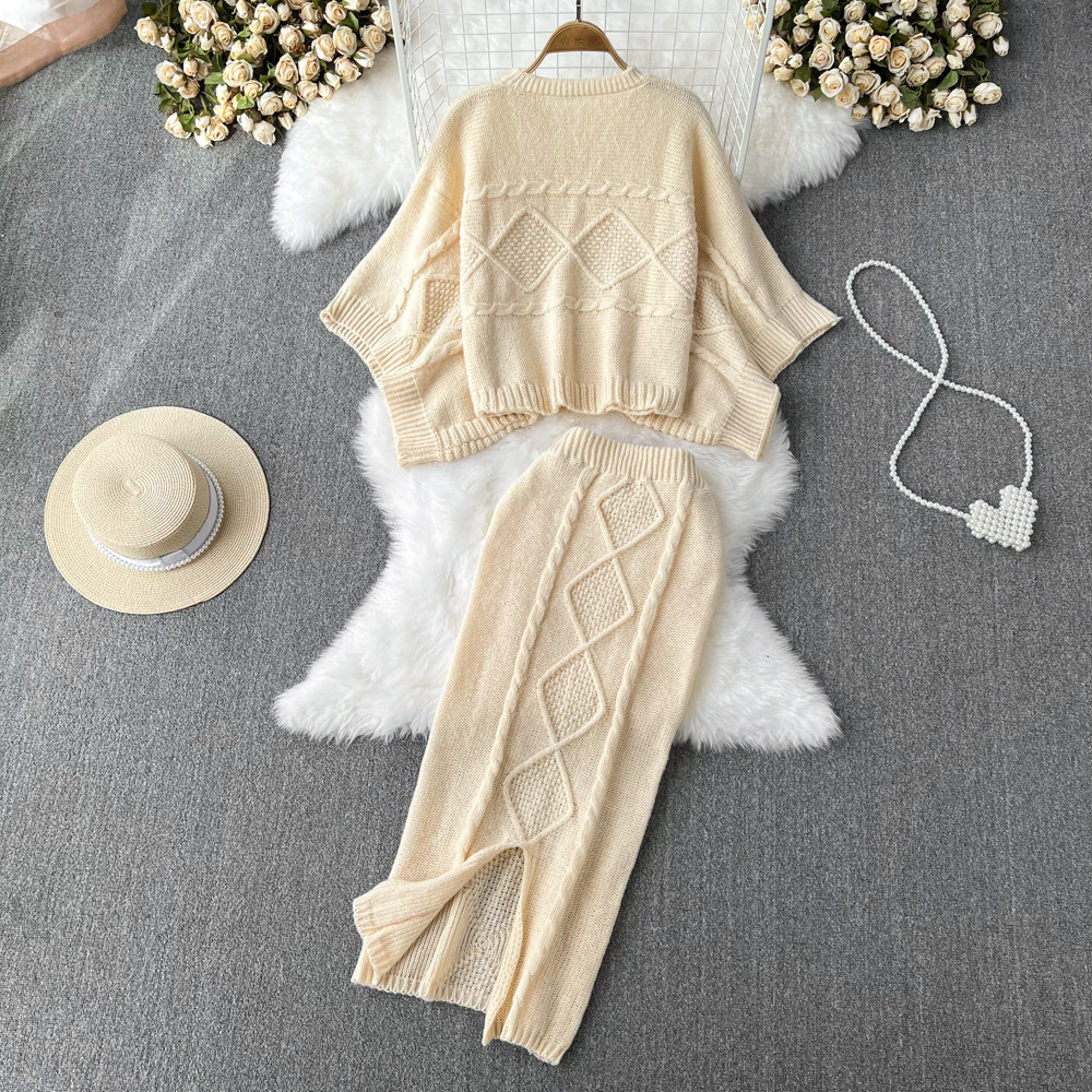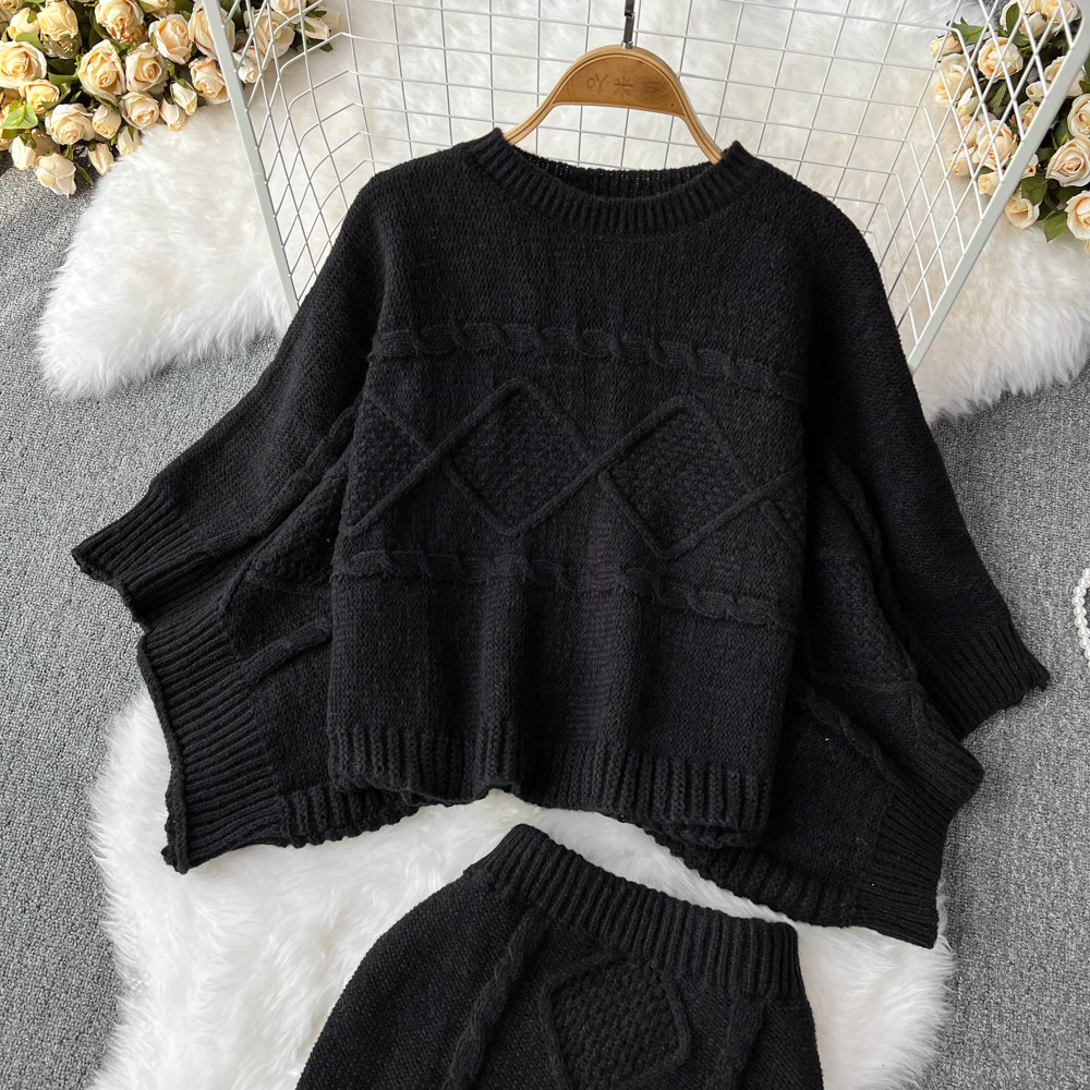Комплект с круглым воротником, свитер с косичкой, трикотажная юбка, высокая талия