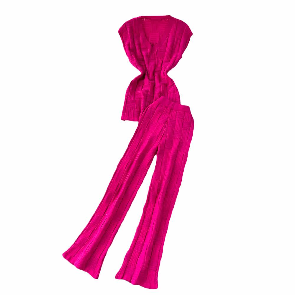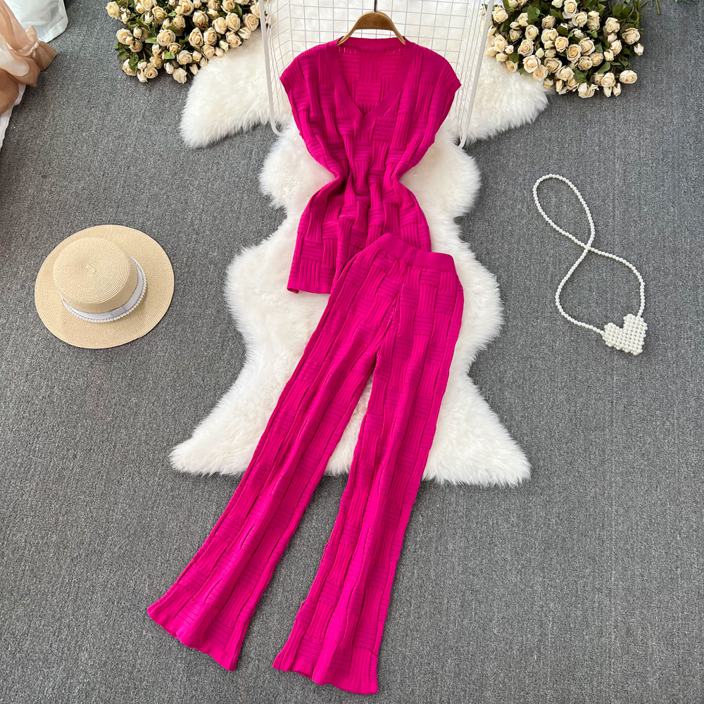 Комплект без рукавов, приталенные трикотажные штаны, V-образный вырез, высокая талия