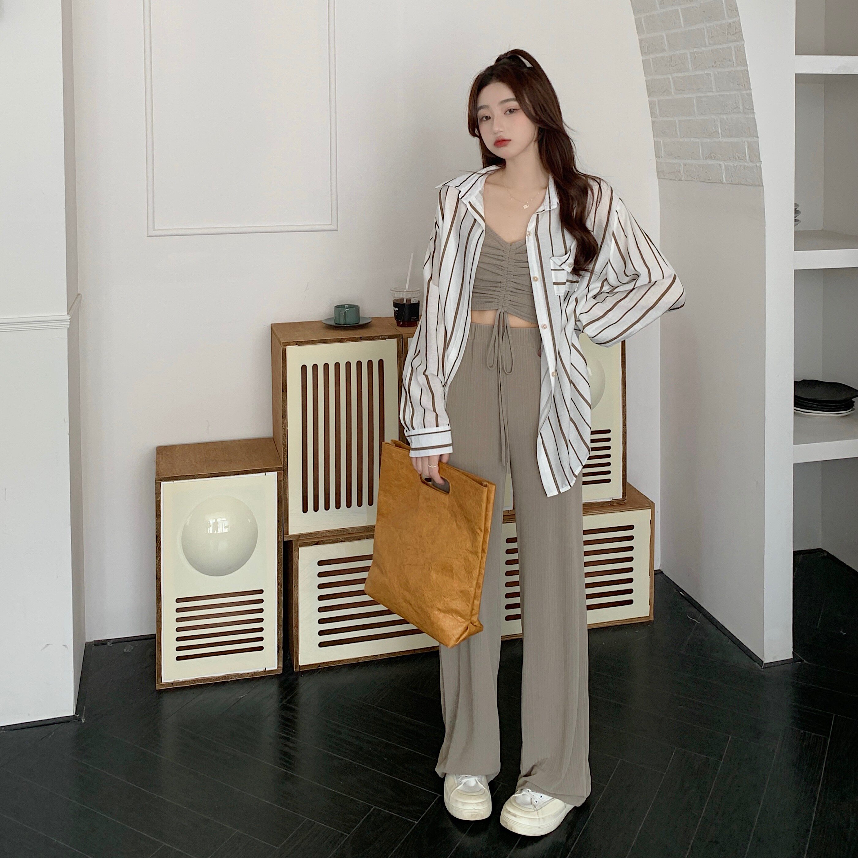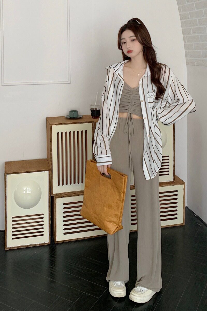 Рубашка, жилет, повседневные брюки, комплект, большой размер, подходит для полных девушек, в корейском стиле, защита от солнца, эффект подтяжки, на шнурках, 3 предмета