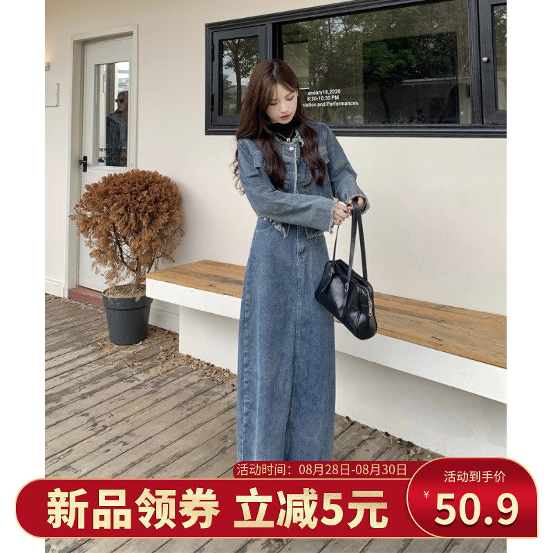Короткая джинсовая демисезонная осенняя куртка, юбка, комплект, большой размер, высокая талия