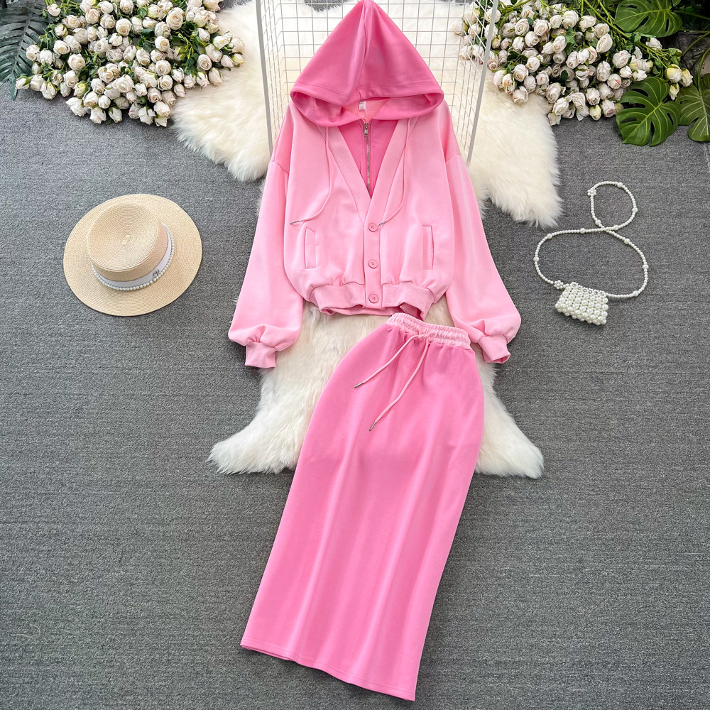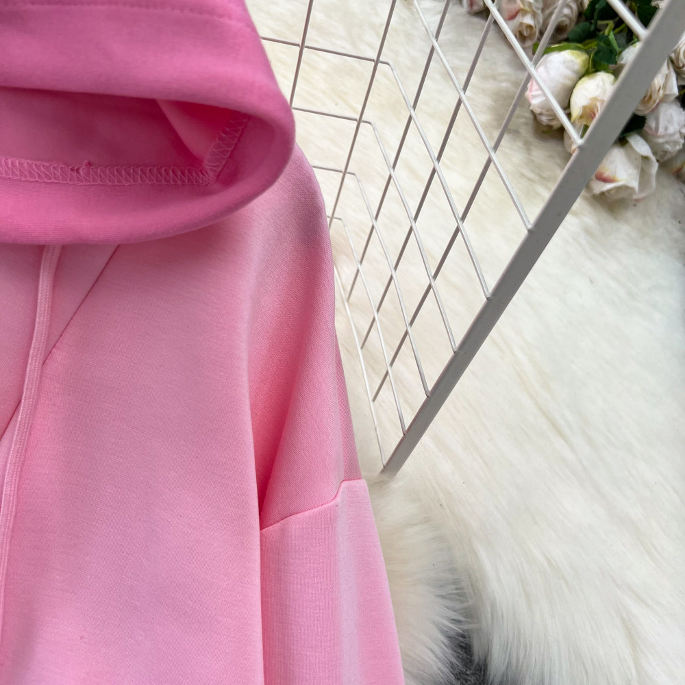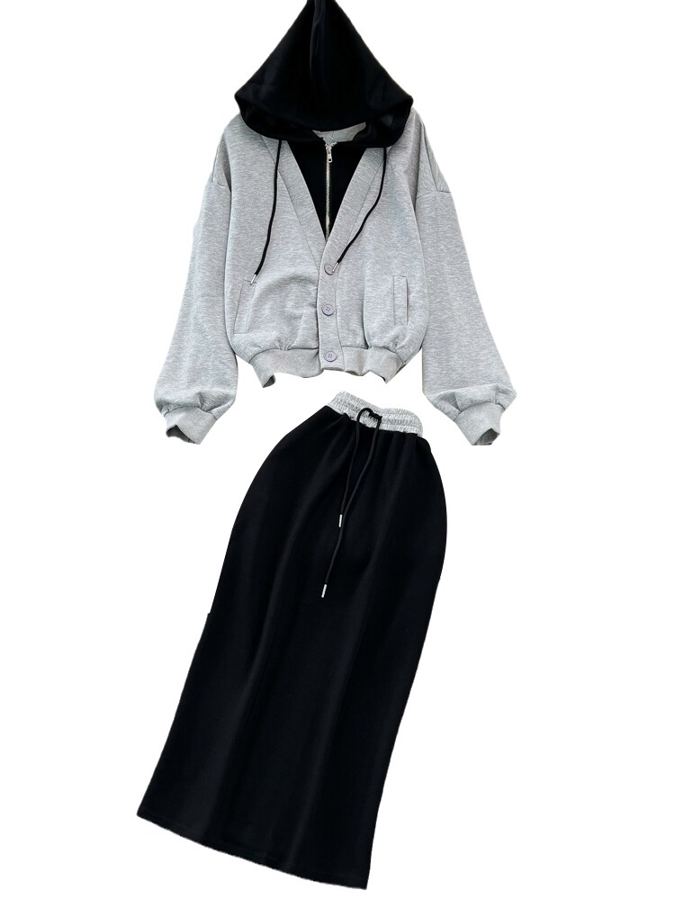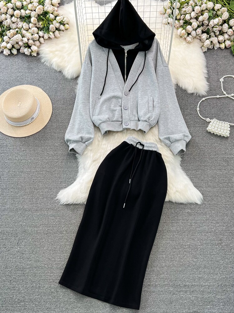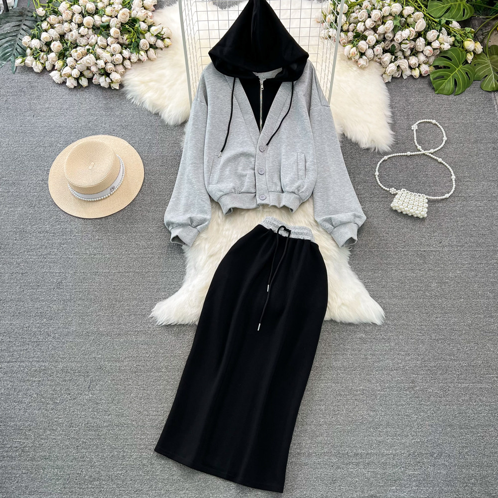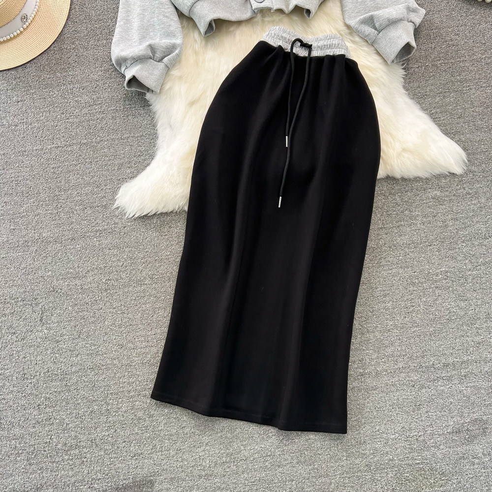 Комплект, лонгслив, толстовка с капюшоном, поясная сумка, юбка, в корейском стиле, высокая талия
