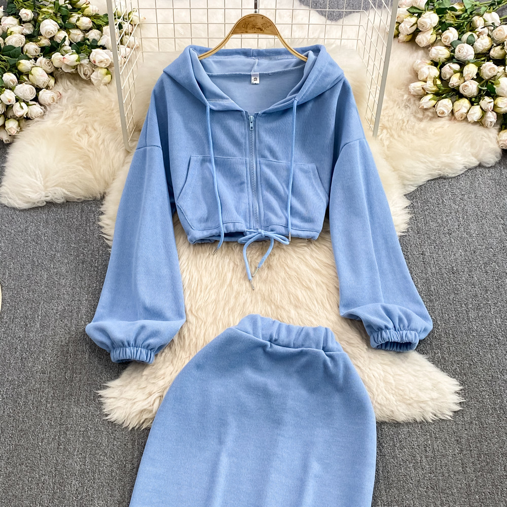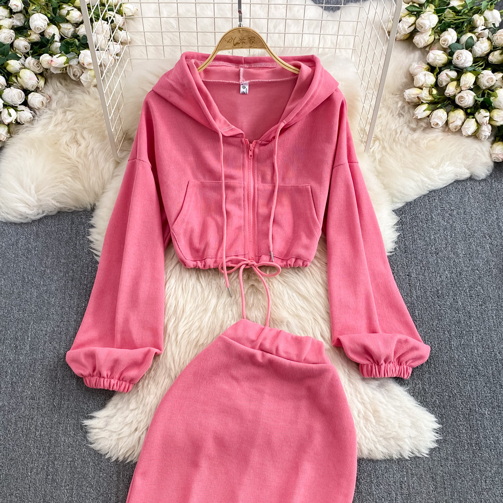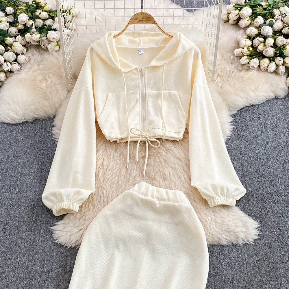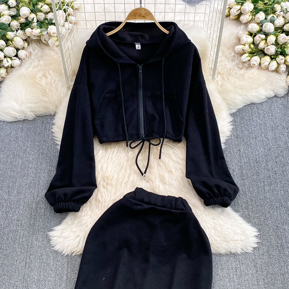 Комплект, приталенная толстовка с капюшоном с молнией, длинная юбка, в корейском стиле, средней длины