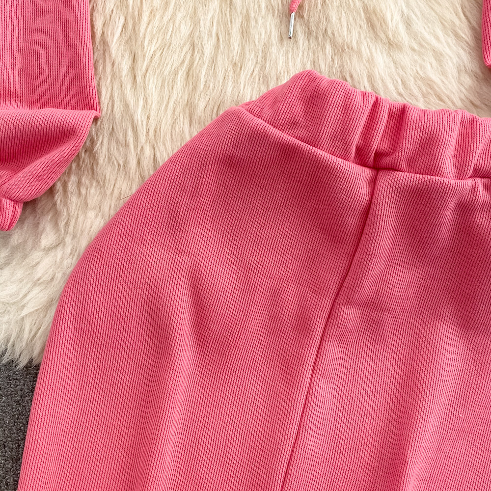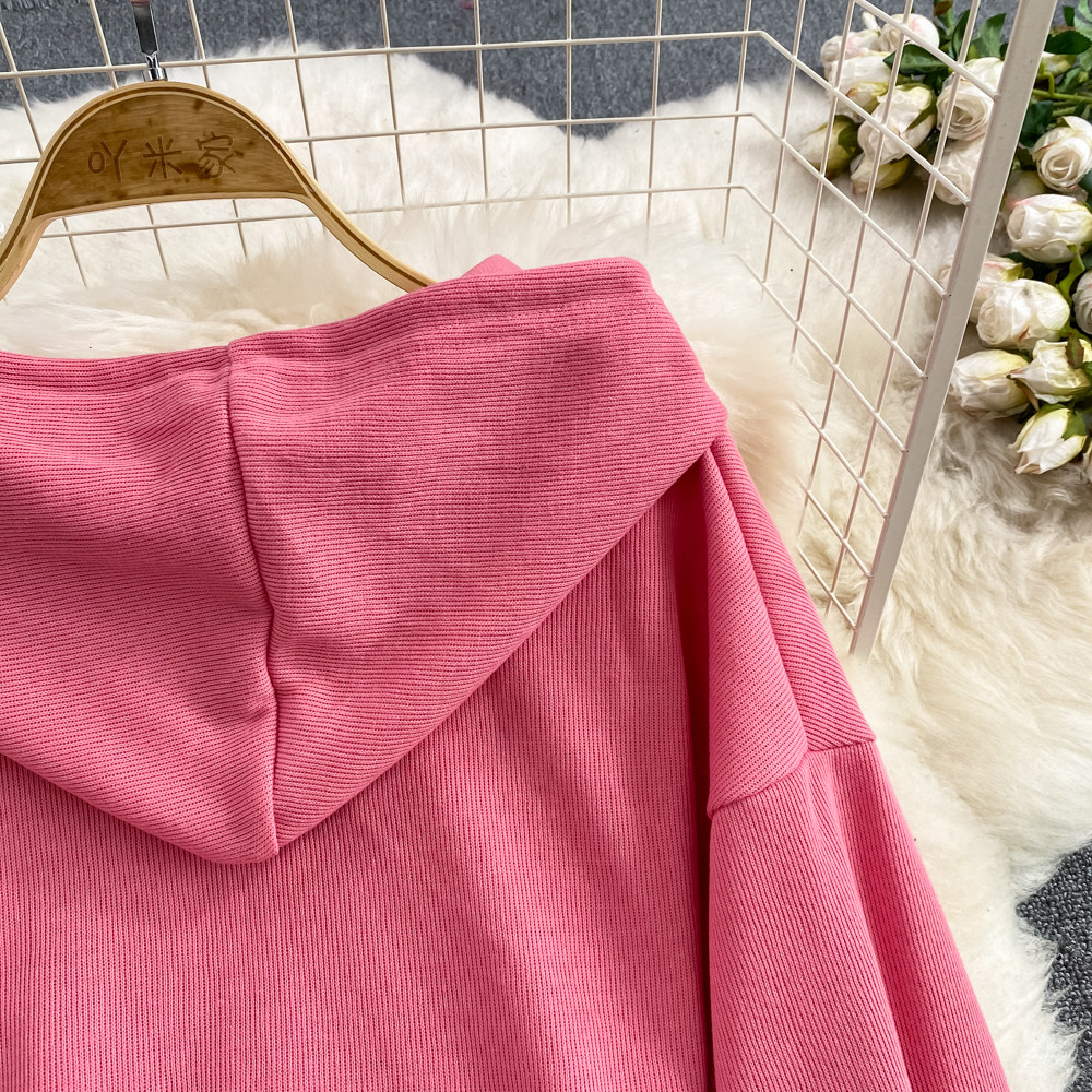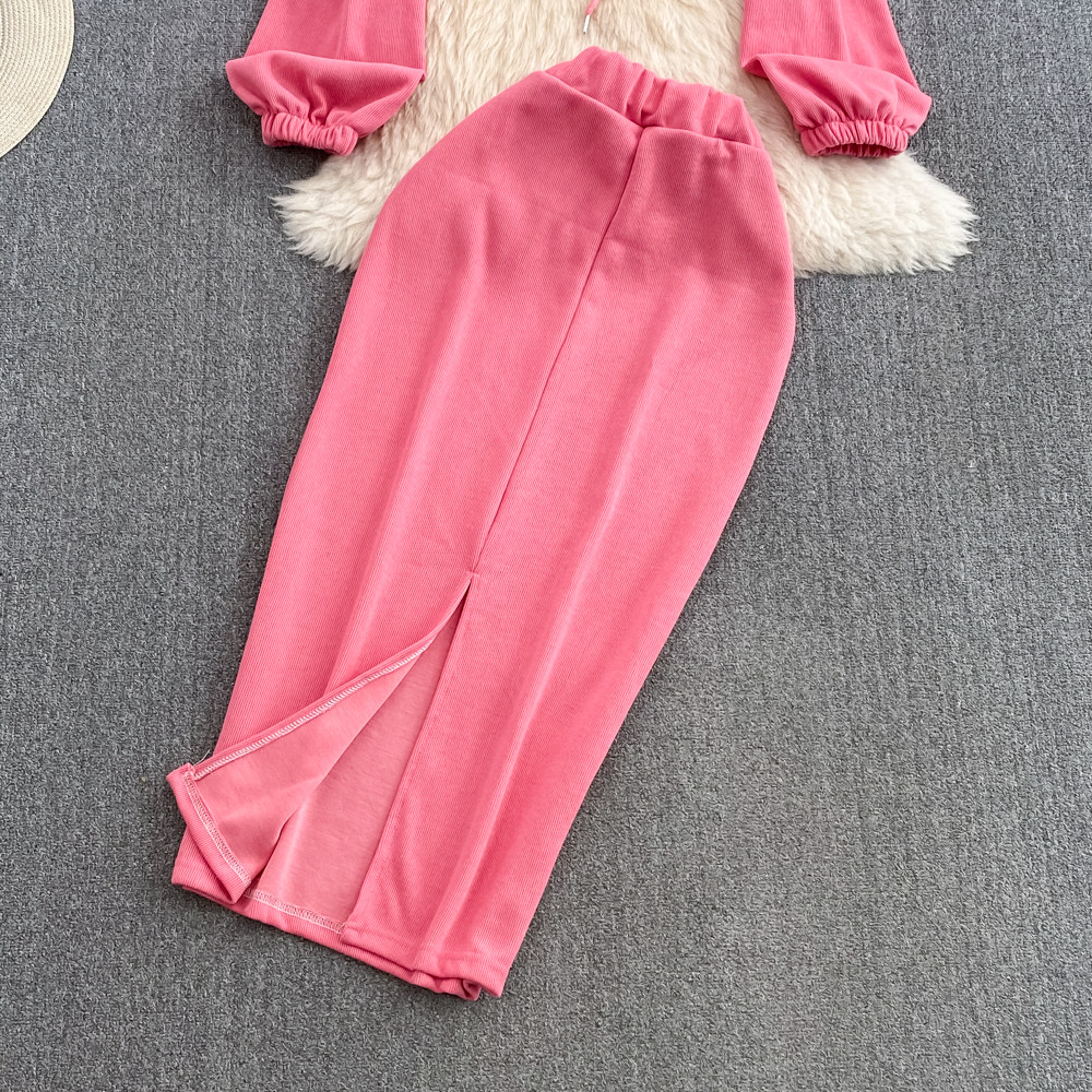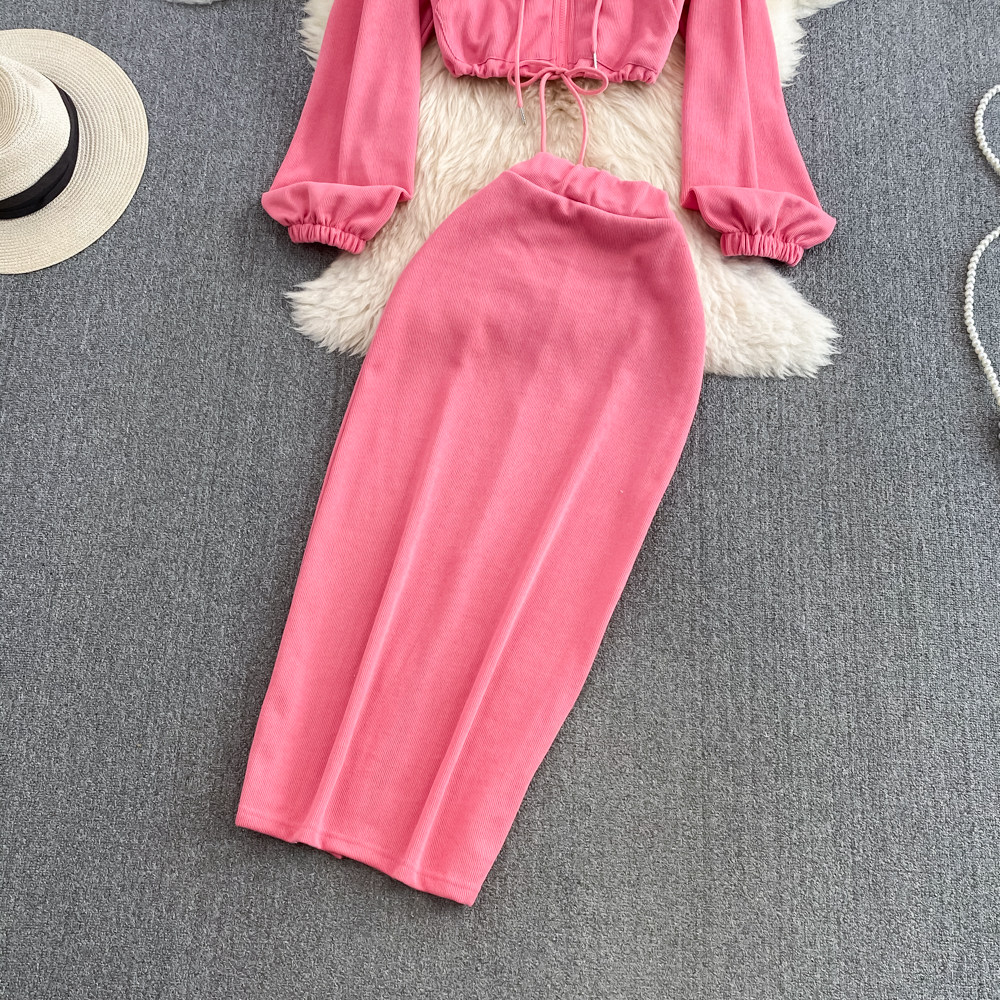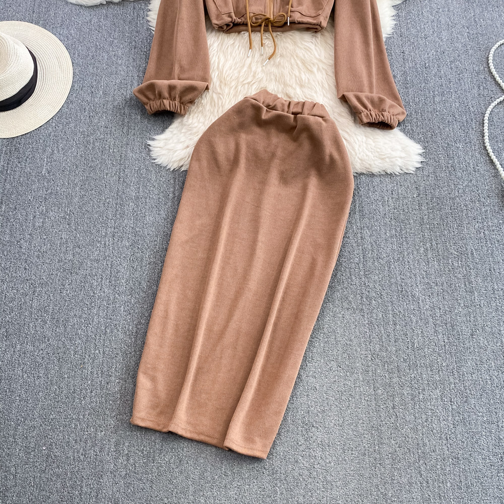 Комплект, приталенная толстовка с капюшоном с молнией, длинная юбка, в корейском стиле, средней длины