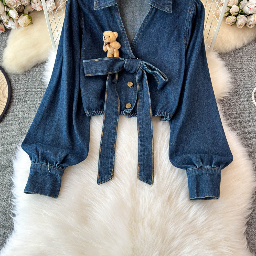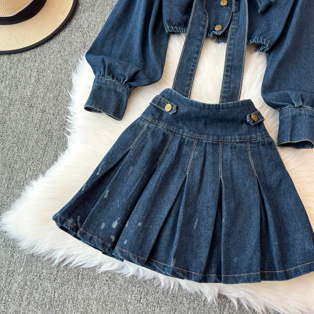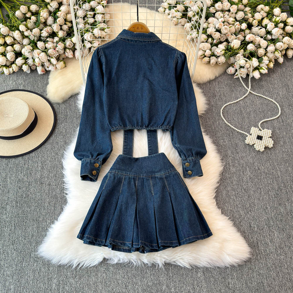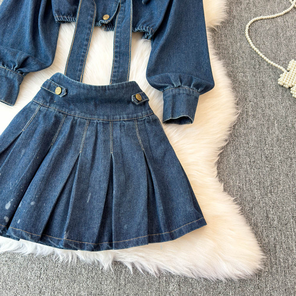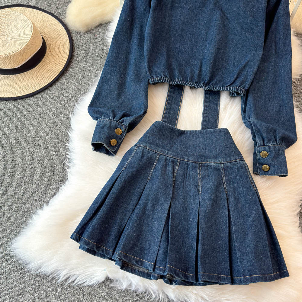 Синий лонгслив, рубашка, юбка, осенний комплект, V-образный вырез, подходит для подростков