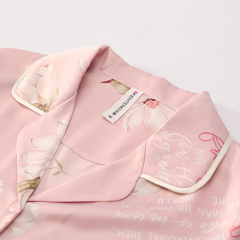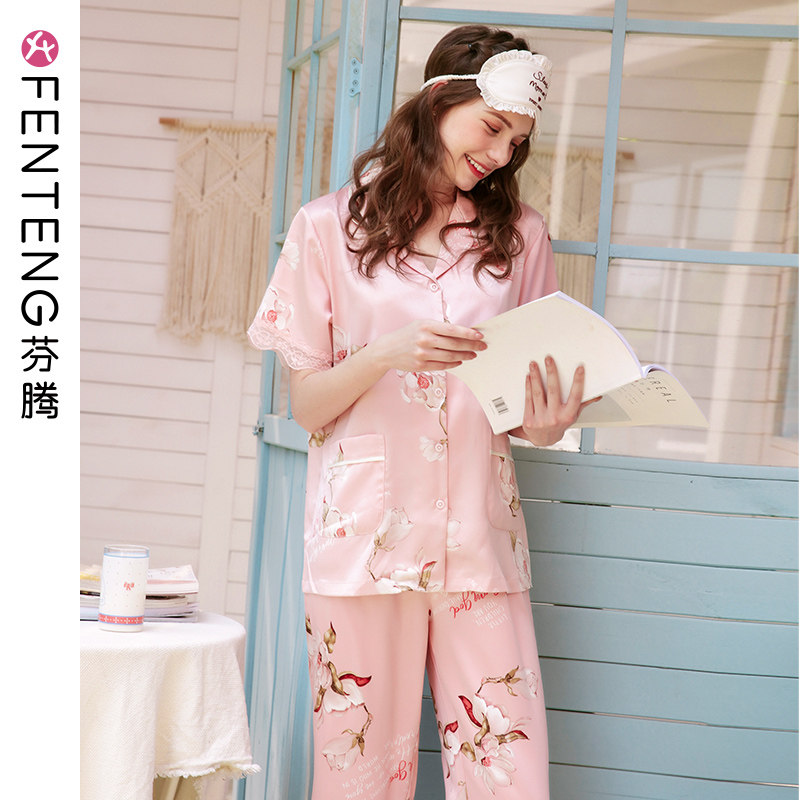 芬腾 Летняя милая шелковая пижама, шелковый кружевной комплект, короткий рукав, в корейском стиле