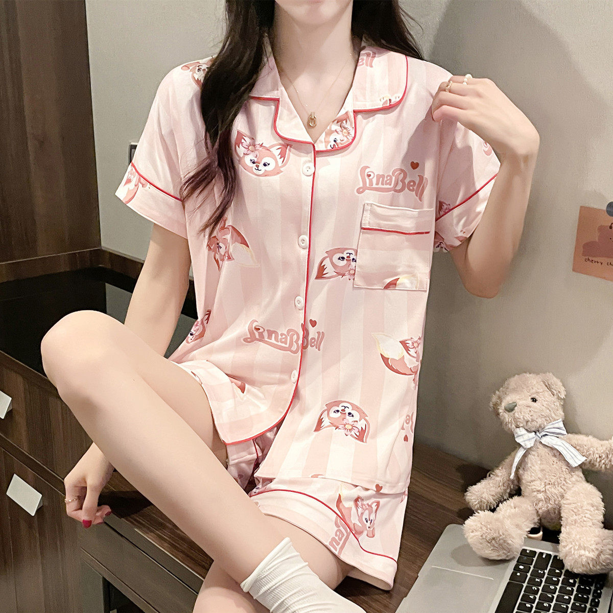 Пижама, хлопковые шорты для школьников и студентов, милый кардиган, комплект, коллекция 2022, в корейском стиле