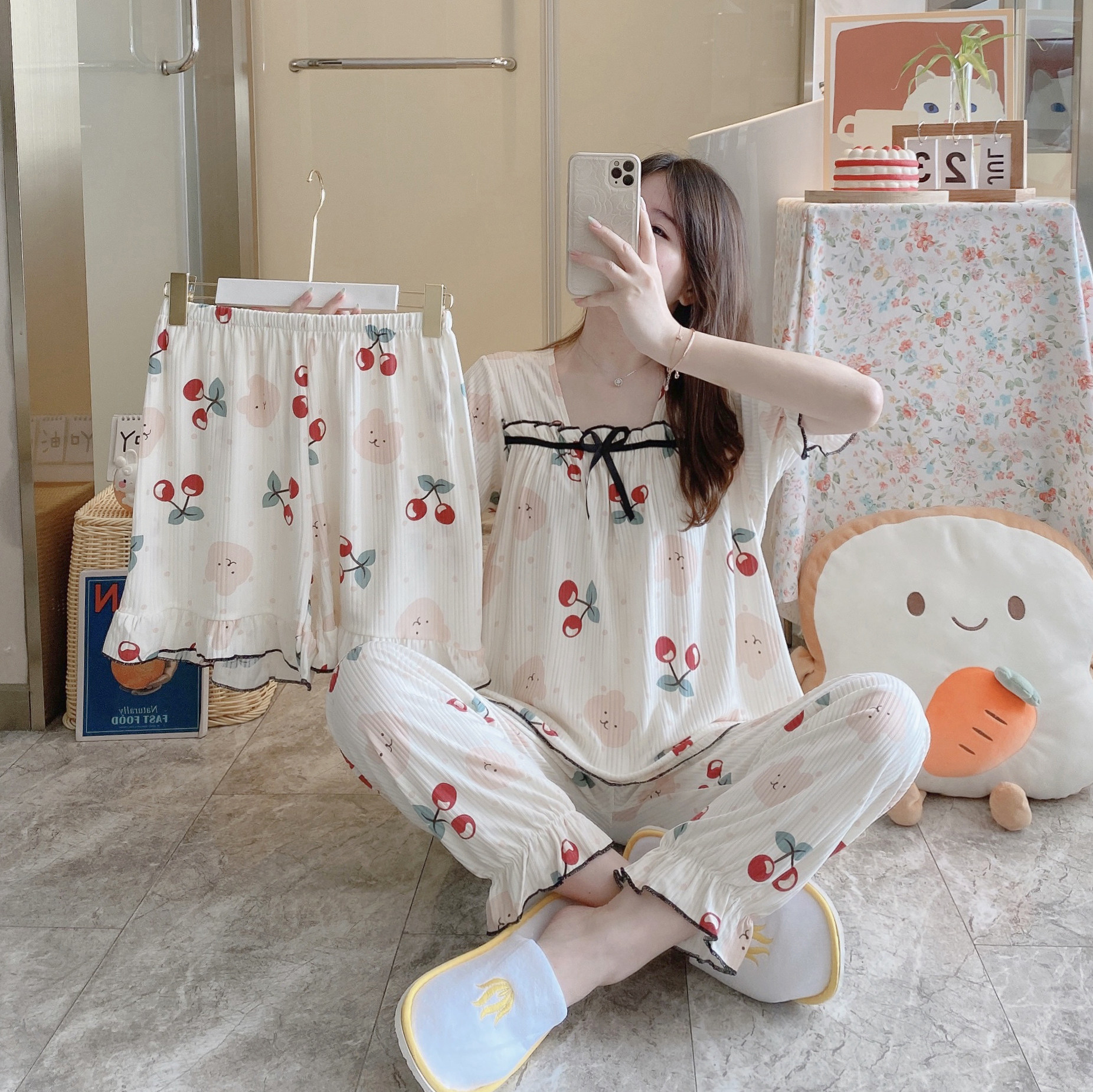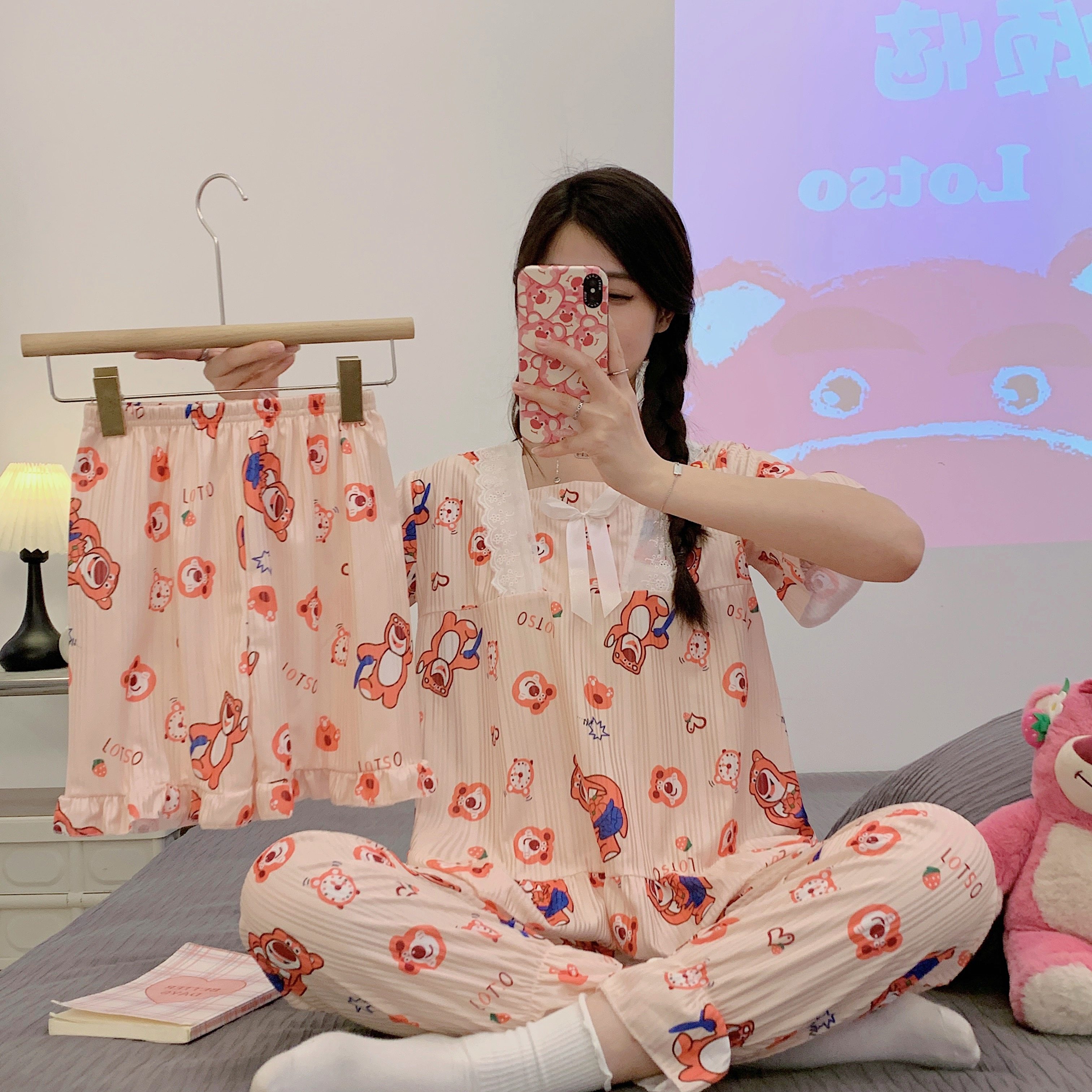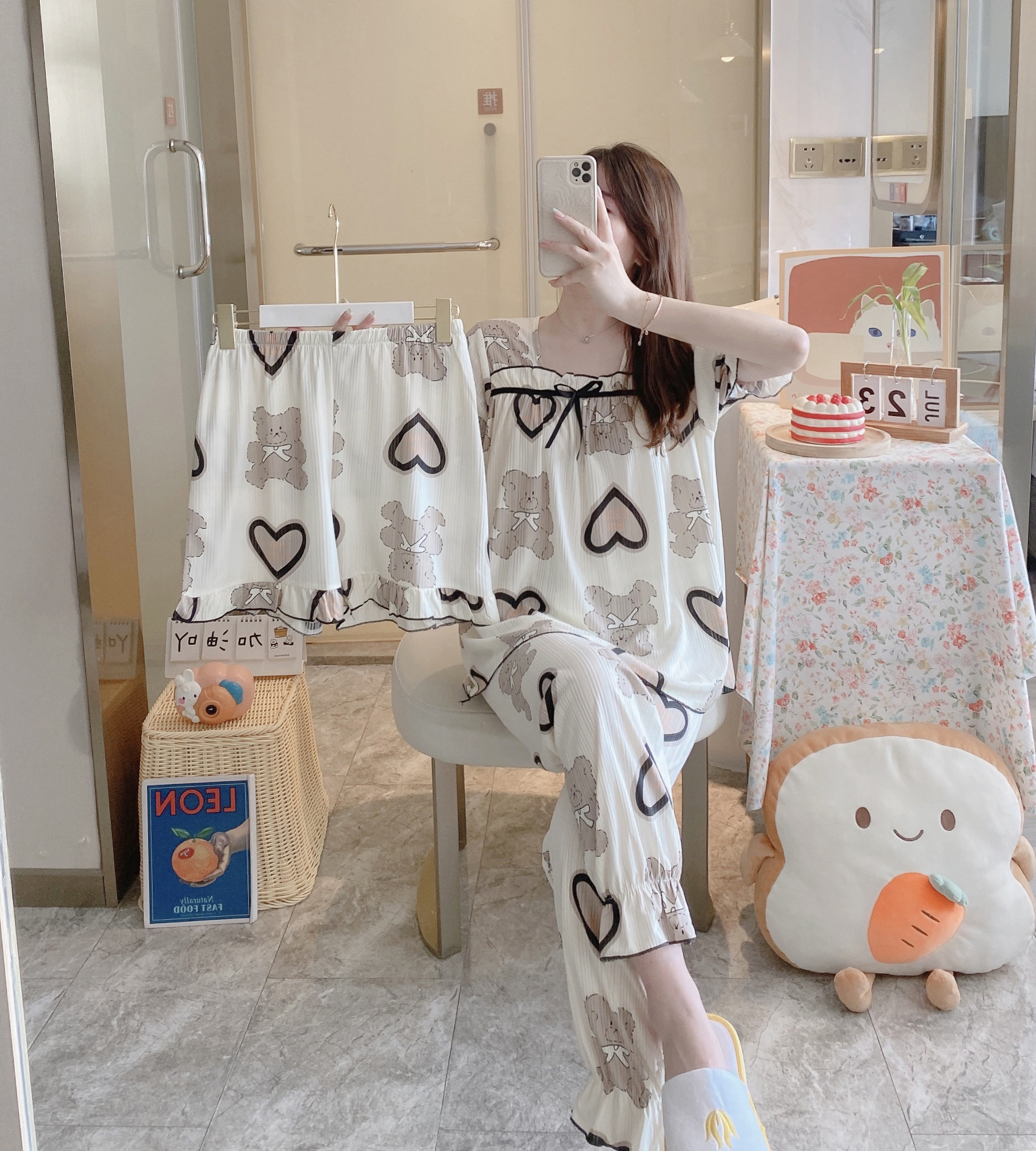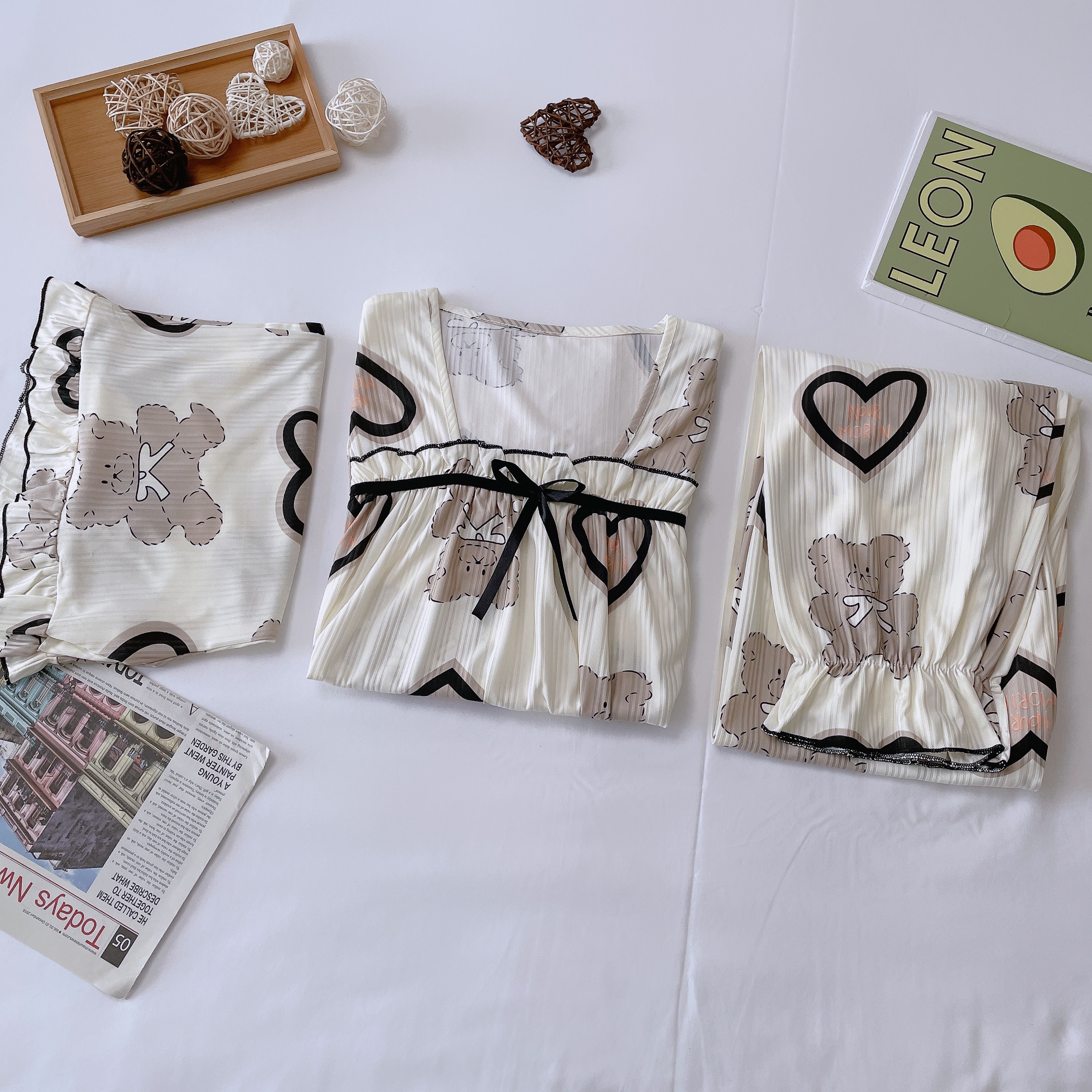 Летняя пижама, хлопковые штаны, милый тонкий комплект, 3 предмета, большой размер
