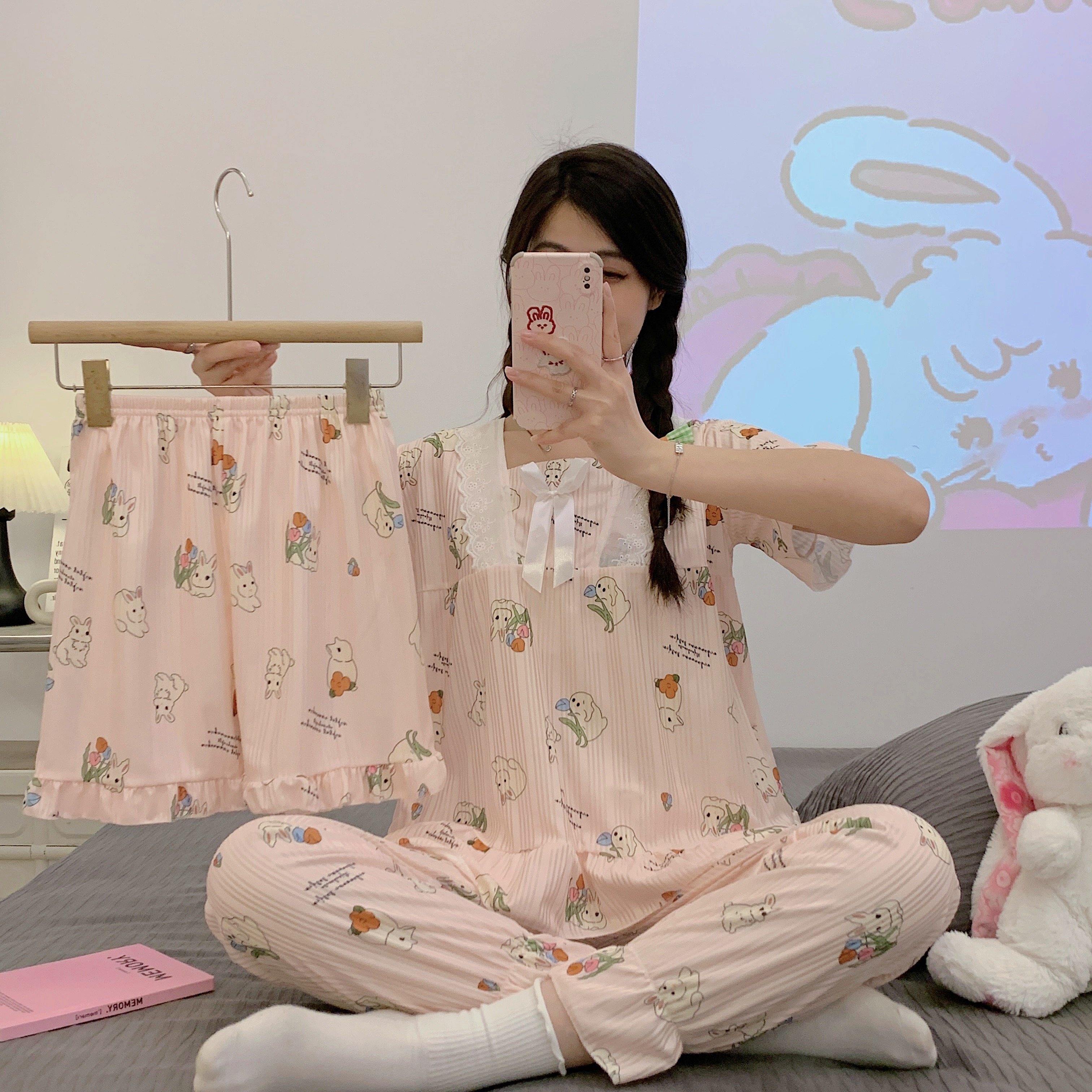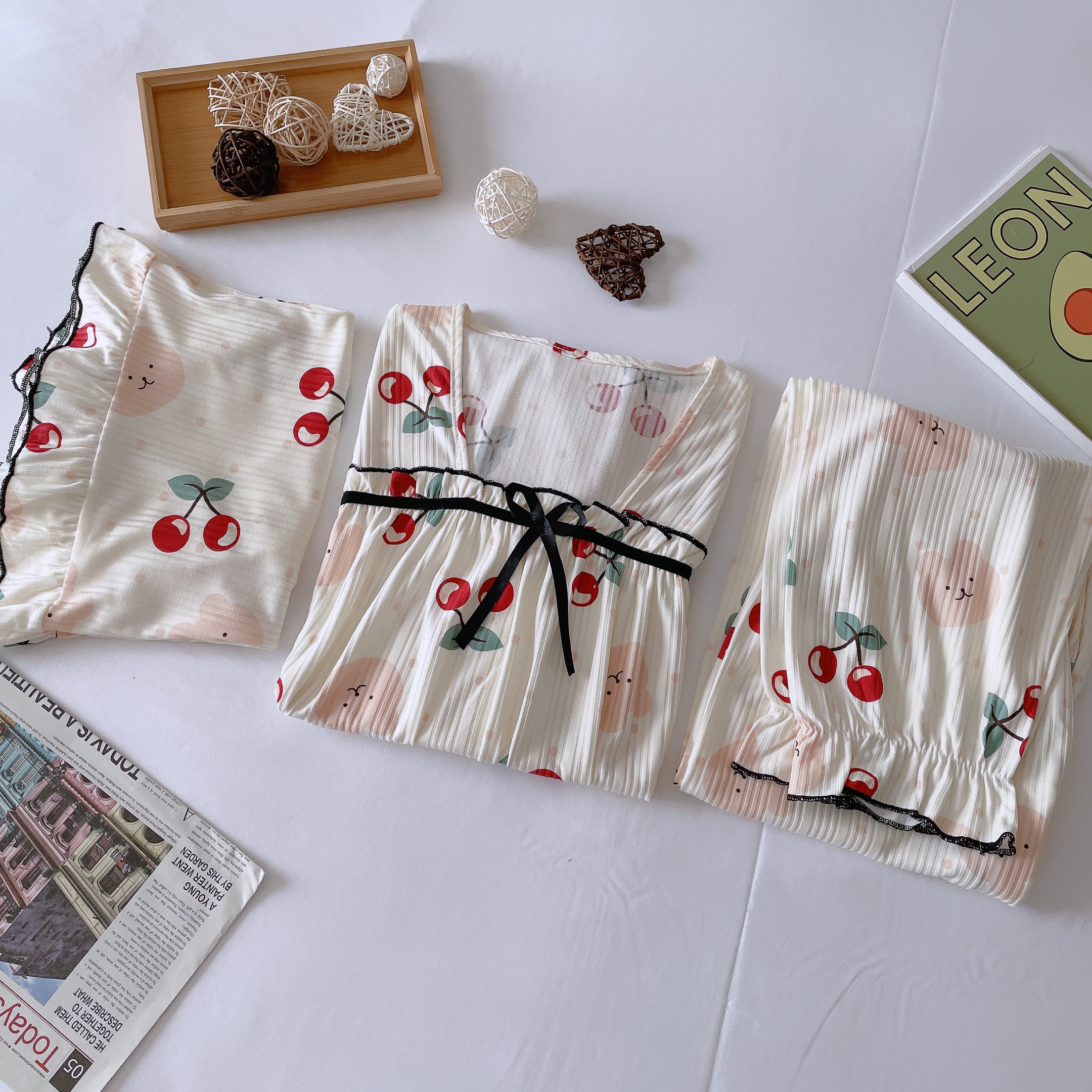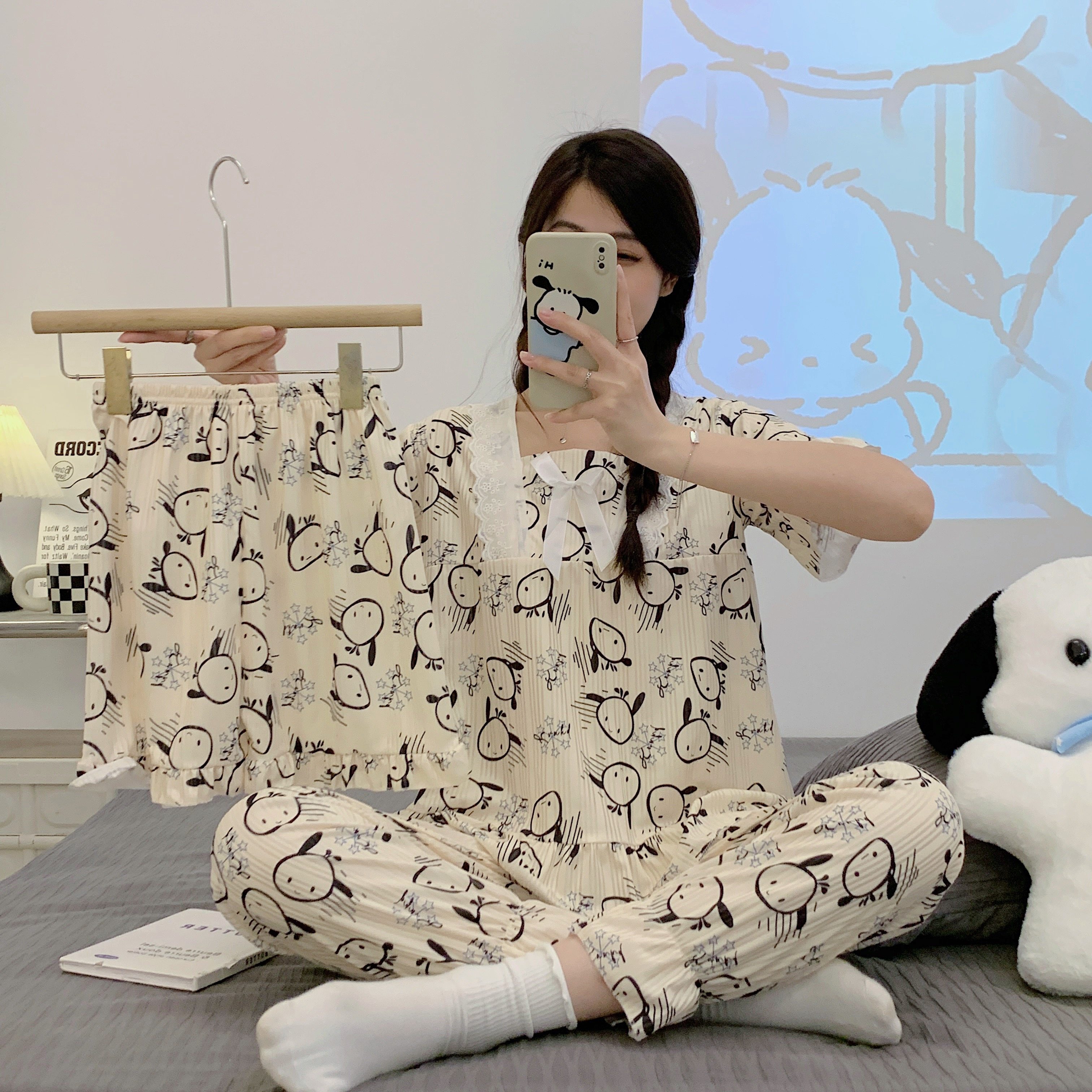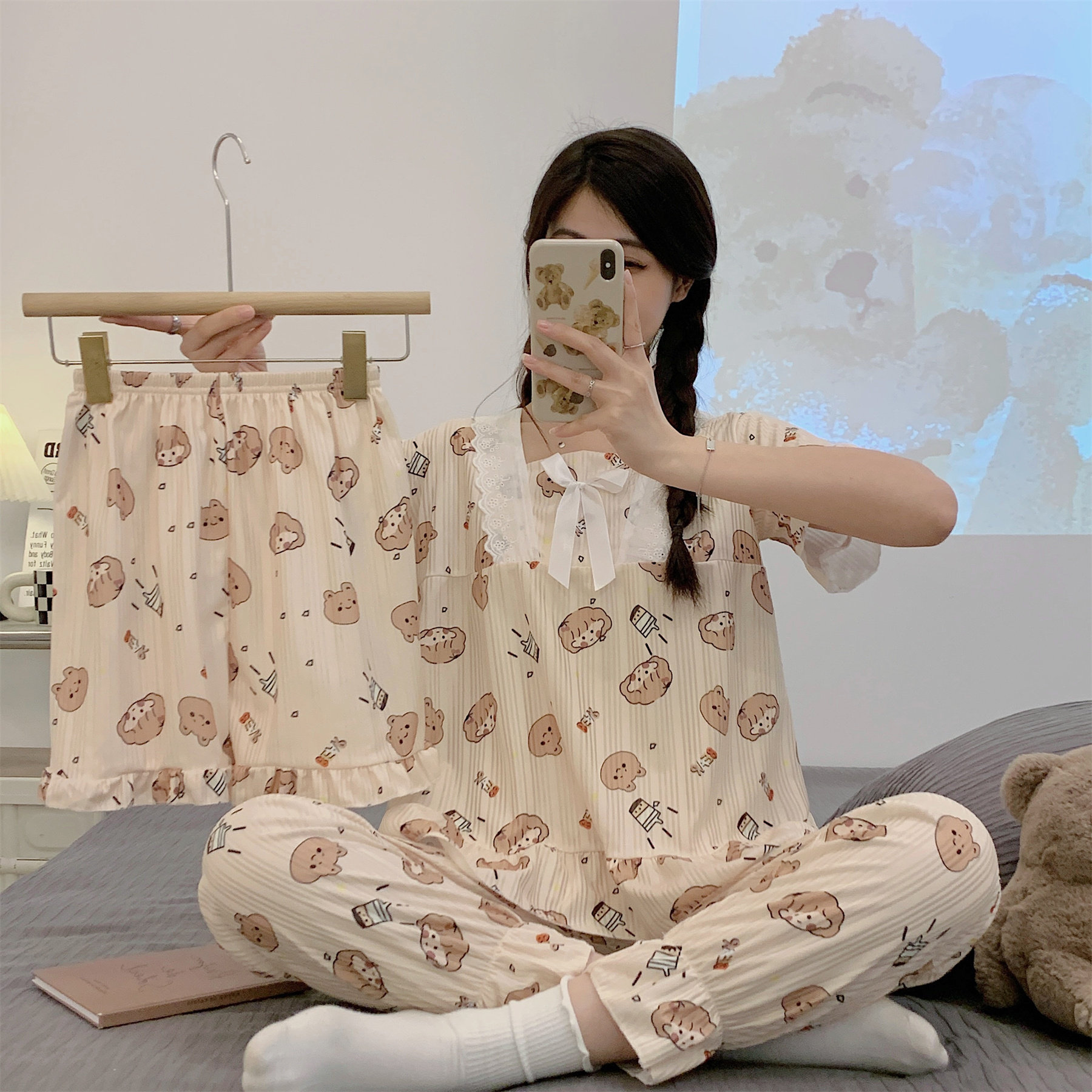 Летняя пижама, хлопковые штаны, милый тонкий комплект, 3 предмета, большой размер