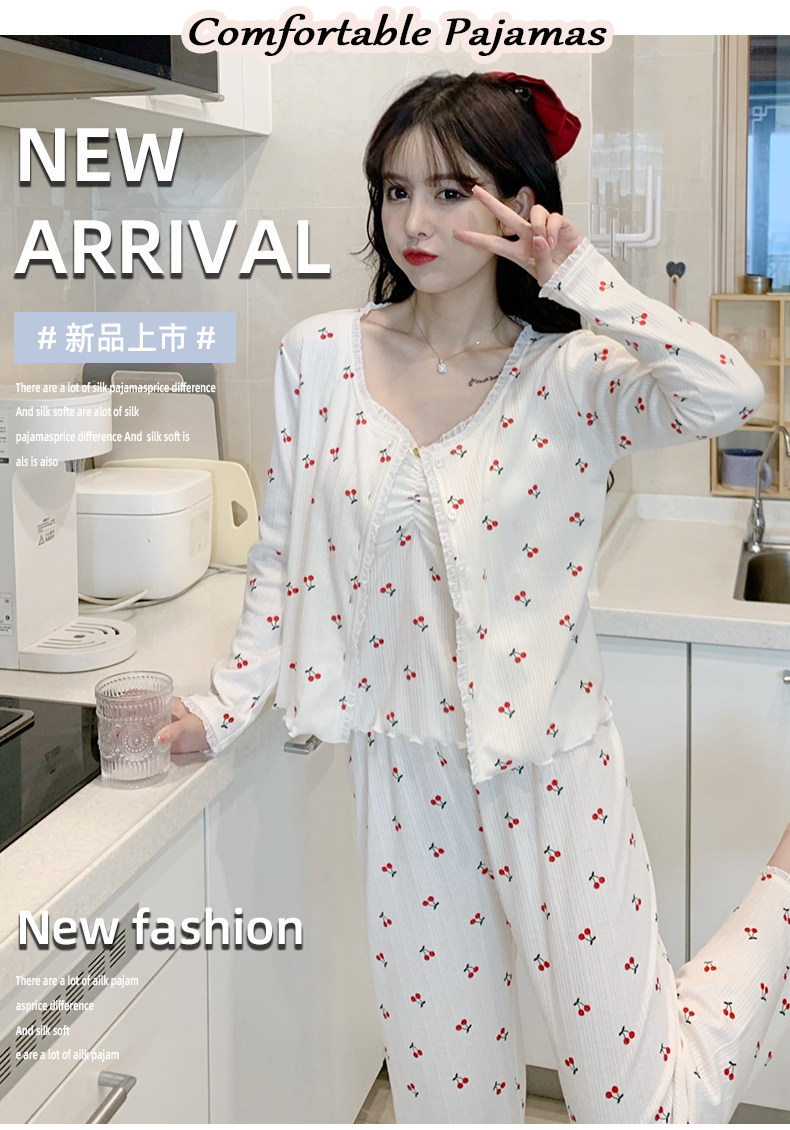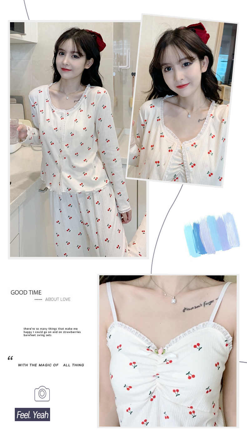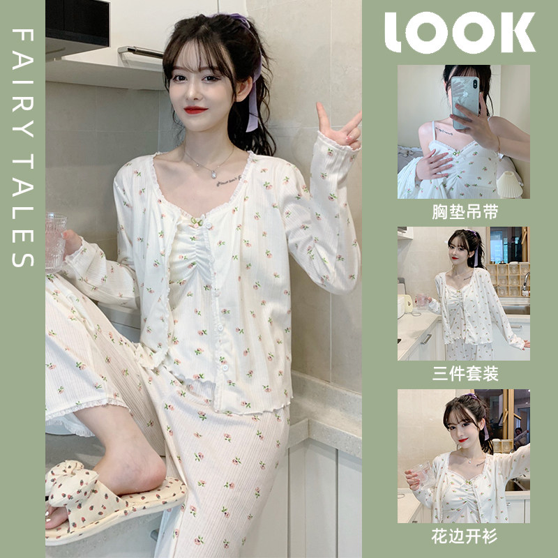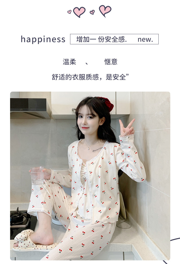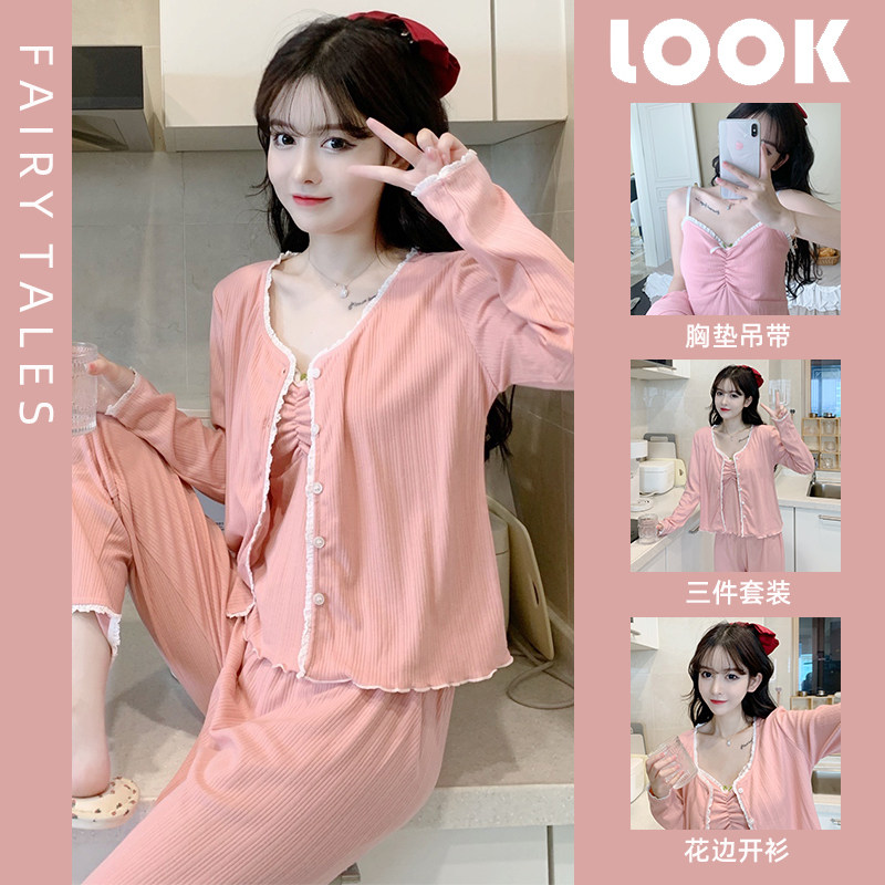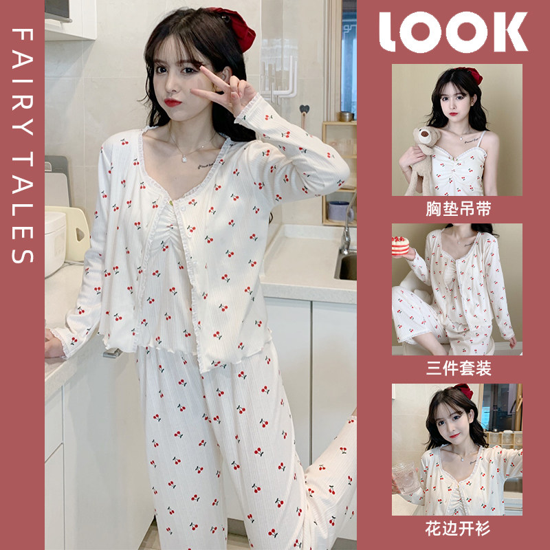 Пижама, хлопковый осенний милый лонгслив, милые сексуальные штаны, комплект, домашняя одежда, эффект подтяжки, 3 предмета