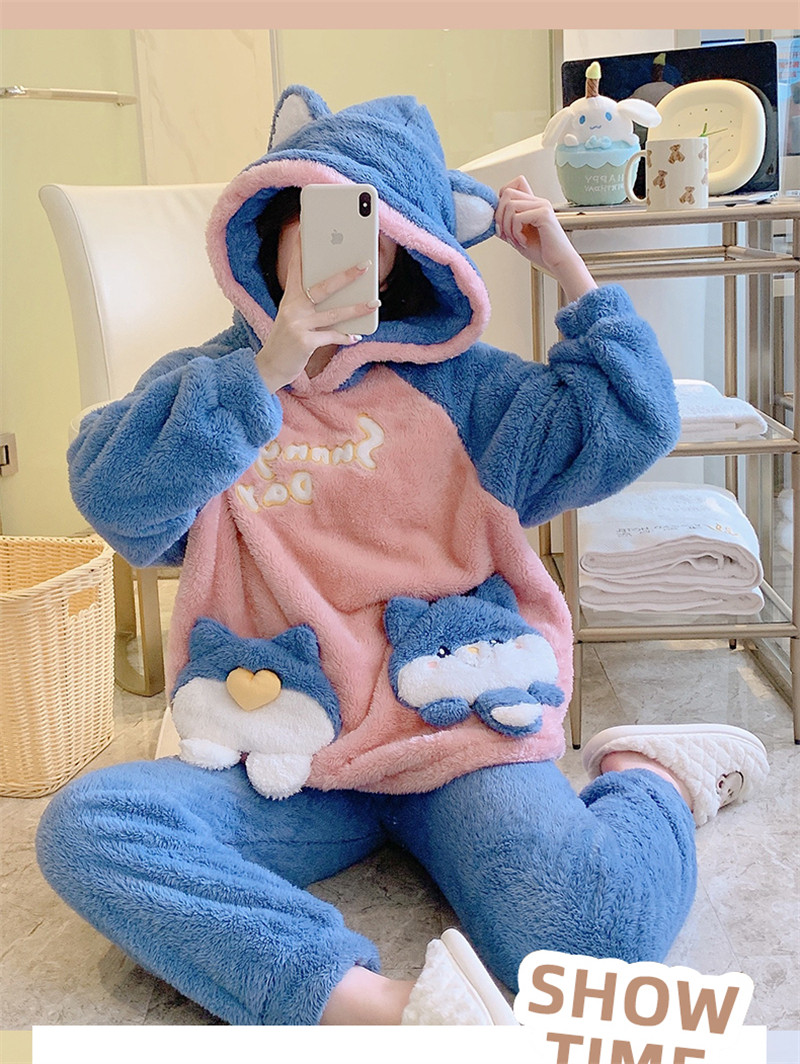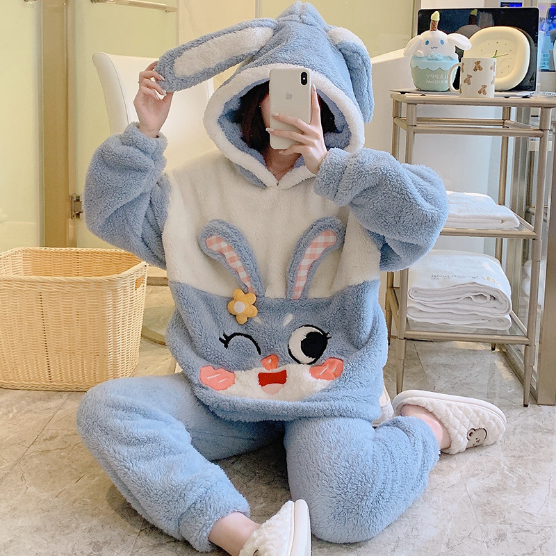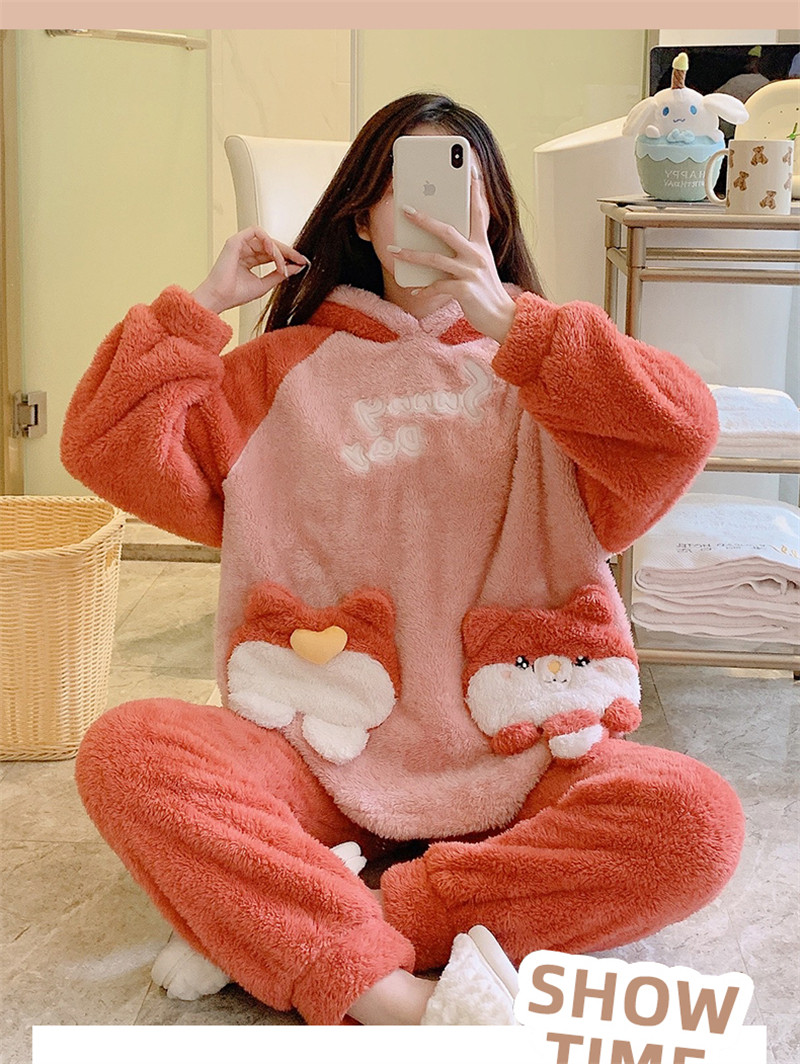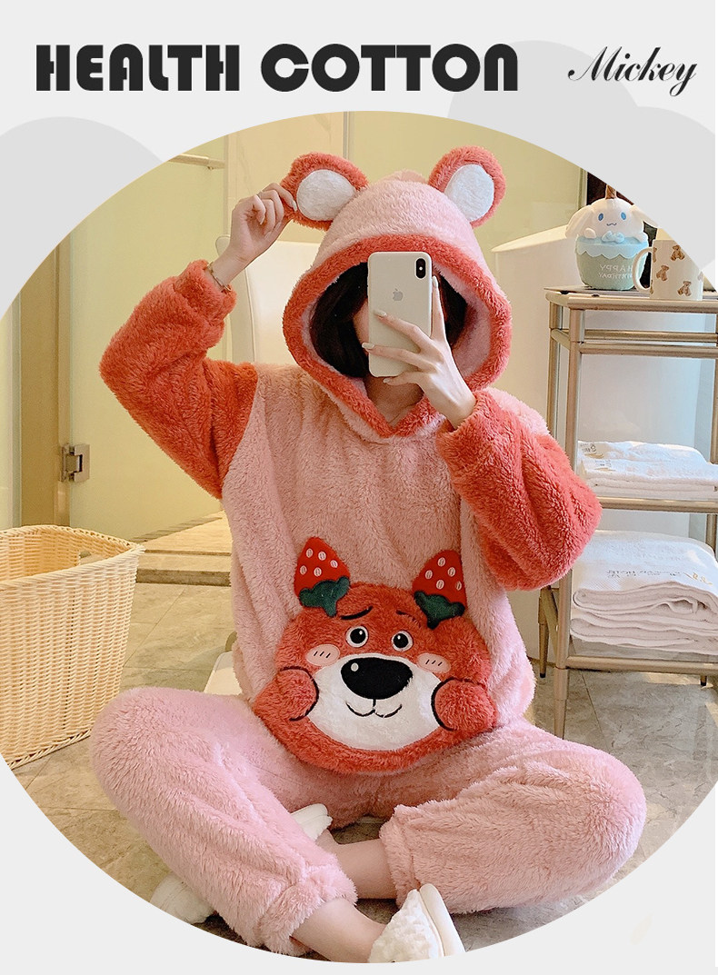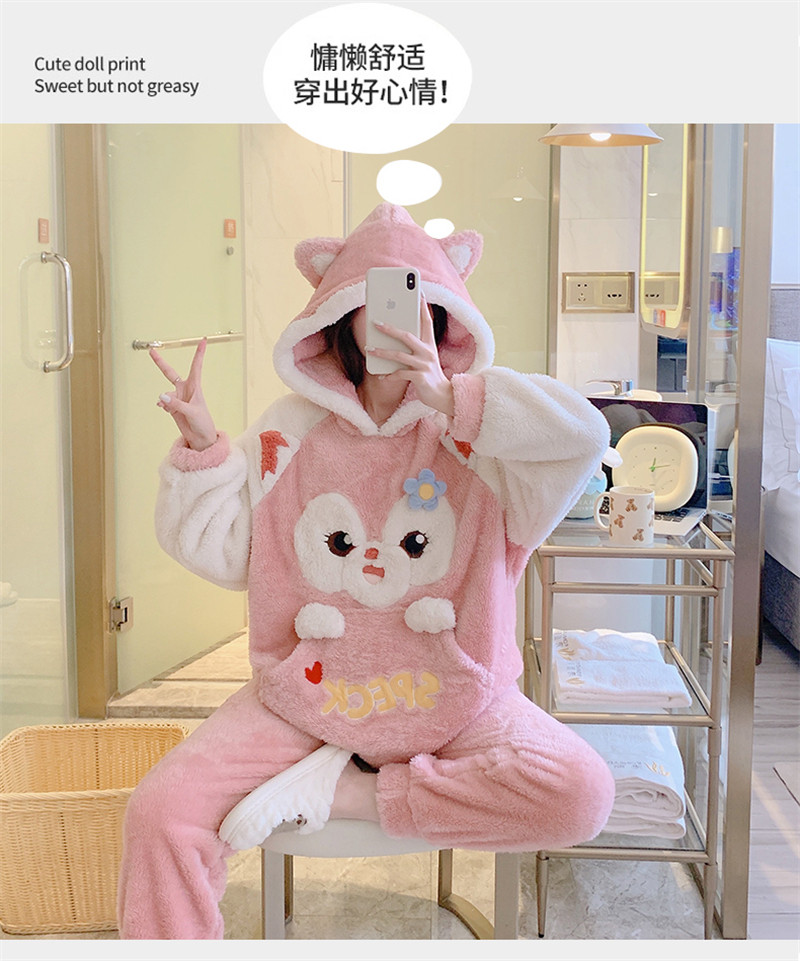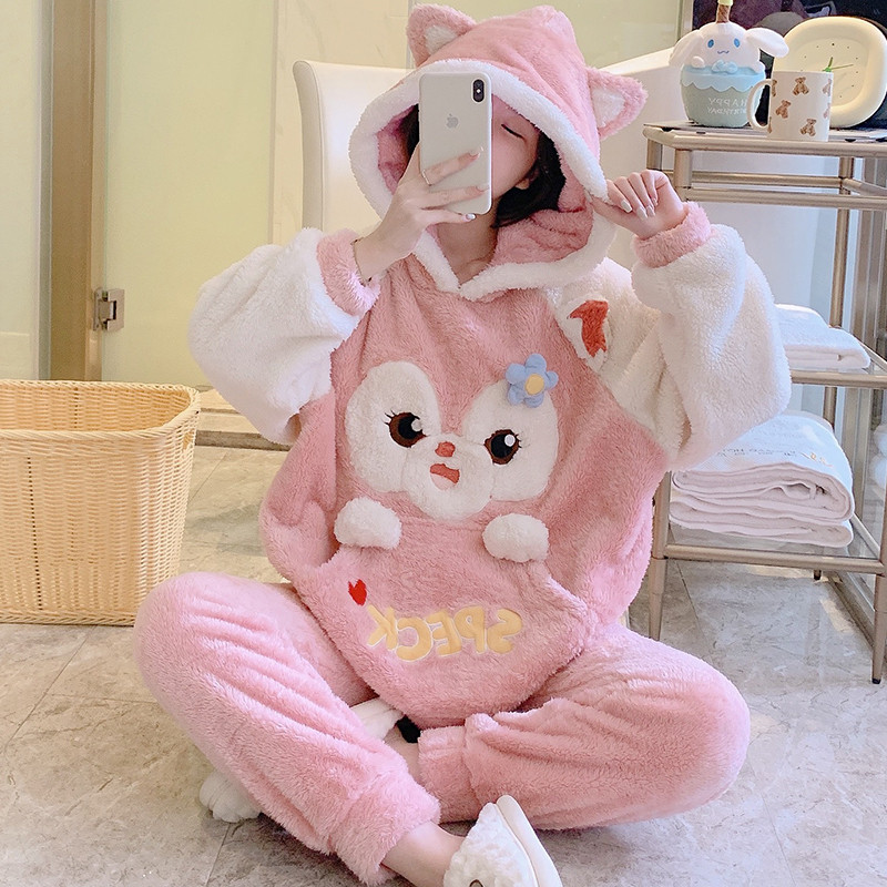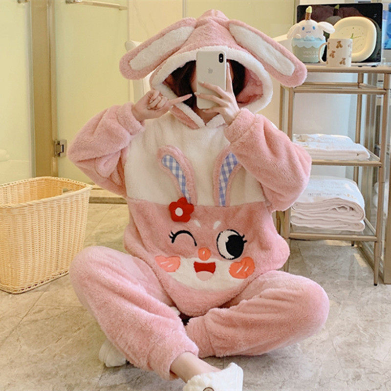 Зимняя коралловая бархатная милая пижама для школьников и студентов с капюшоном, утепленный демисезонный фланелевый комплект