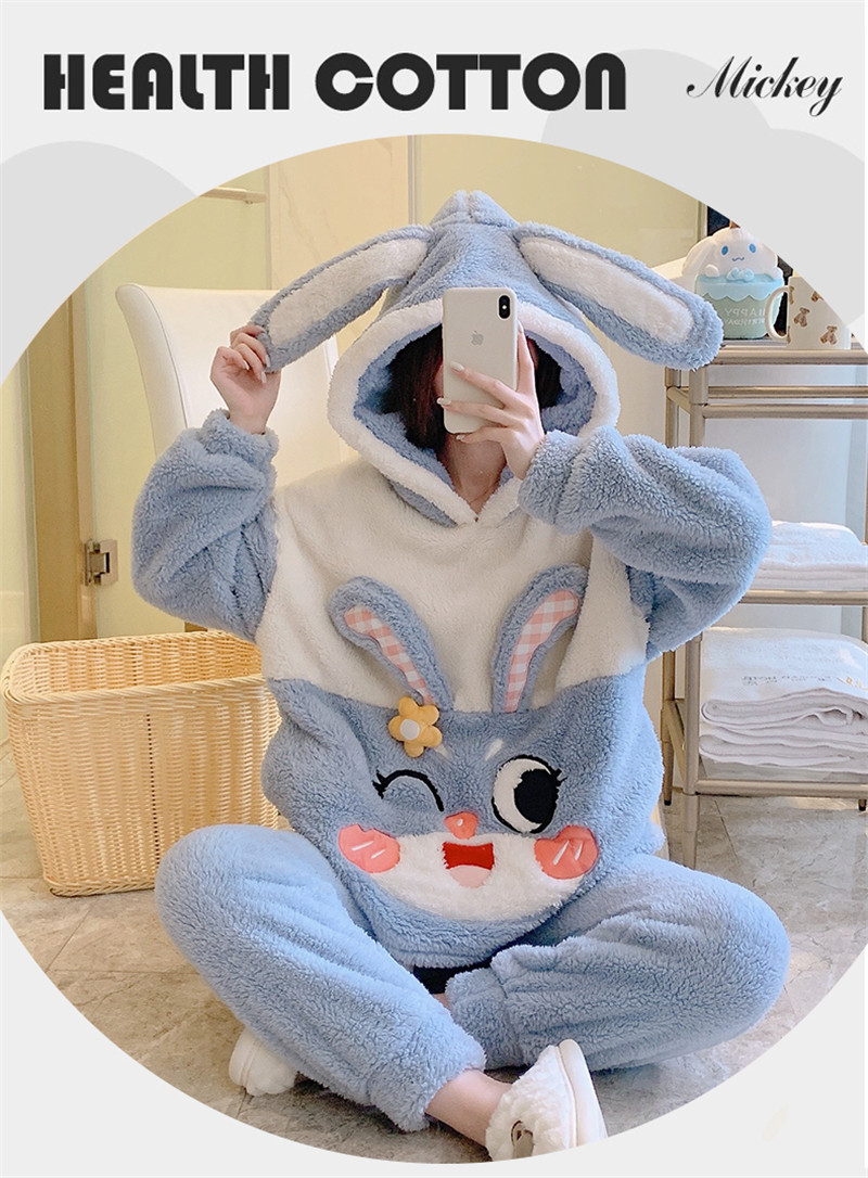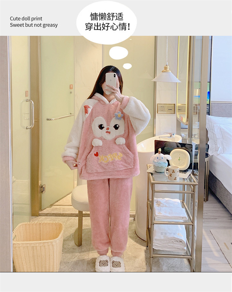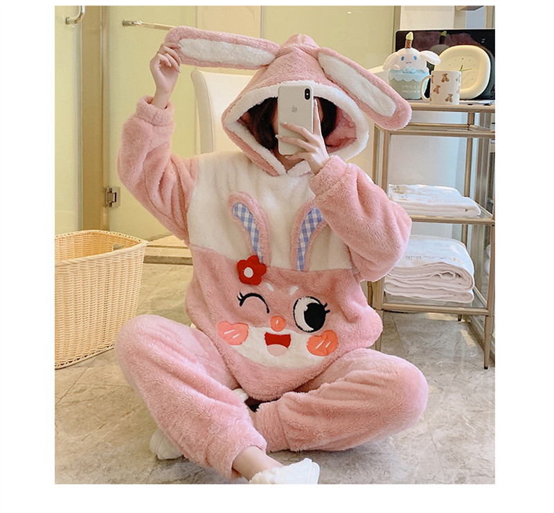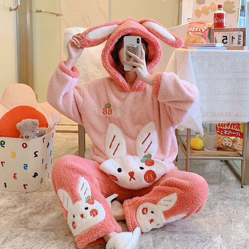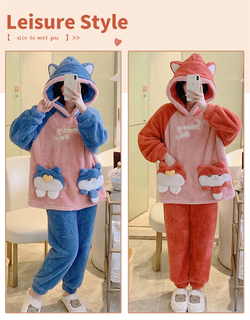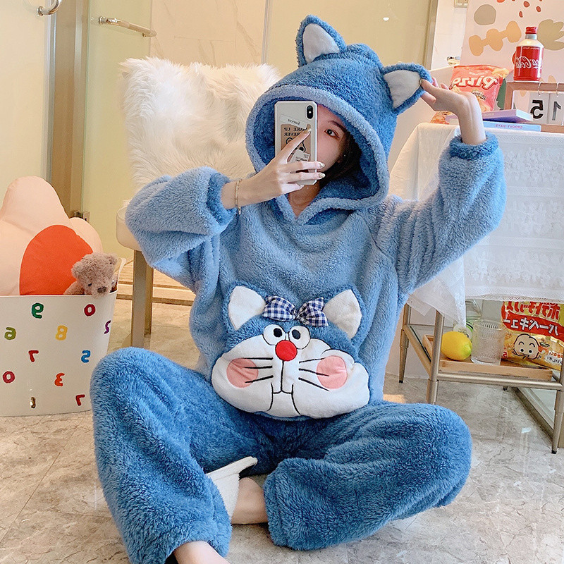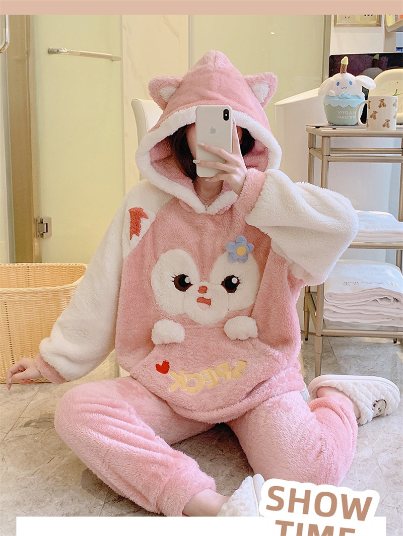 Зимняя коралловая бархатная милая пижама для школьников и студентов с капюшоном, утепленный демисезонный фланелевый комплект