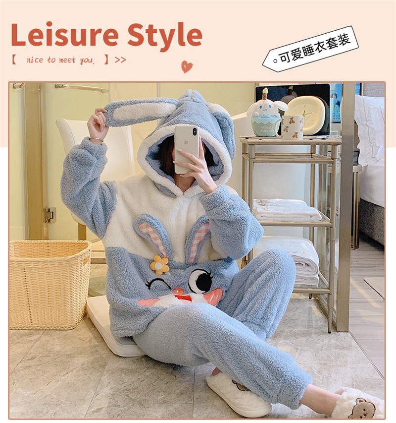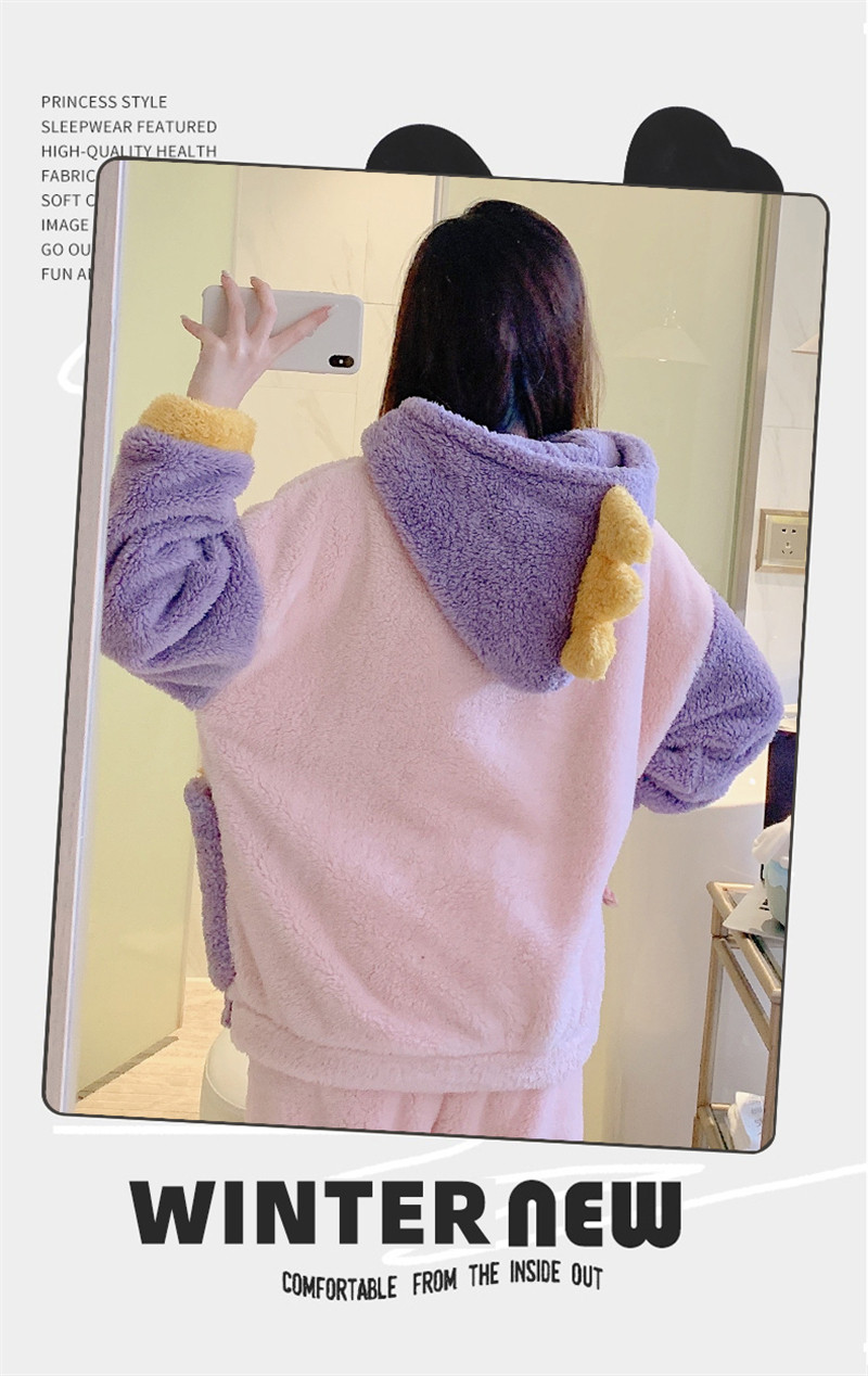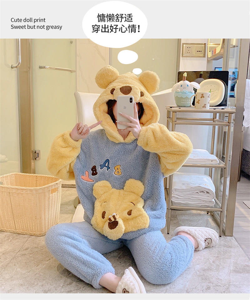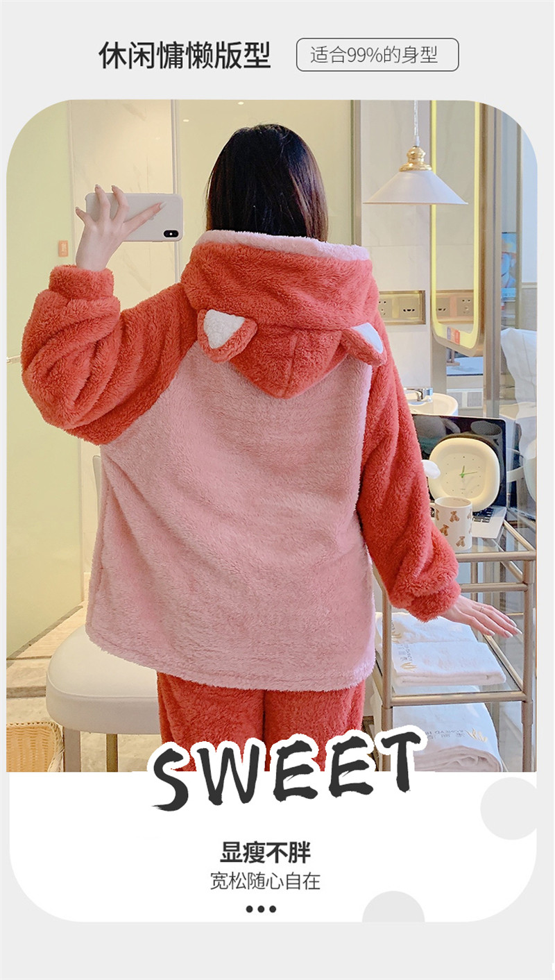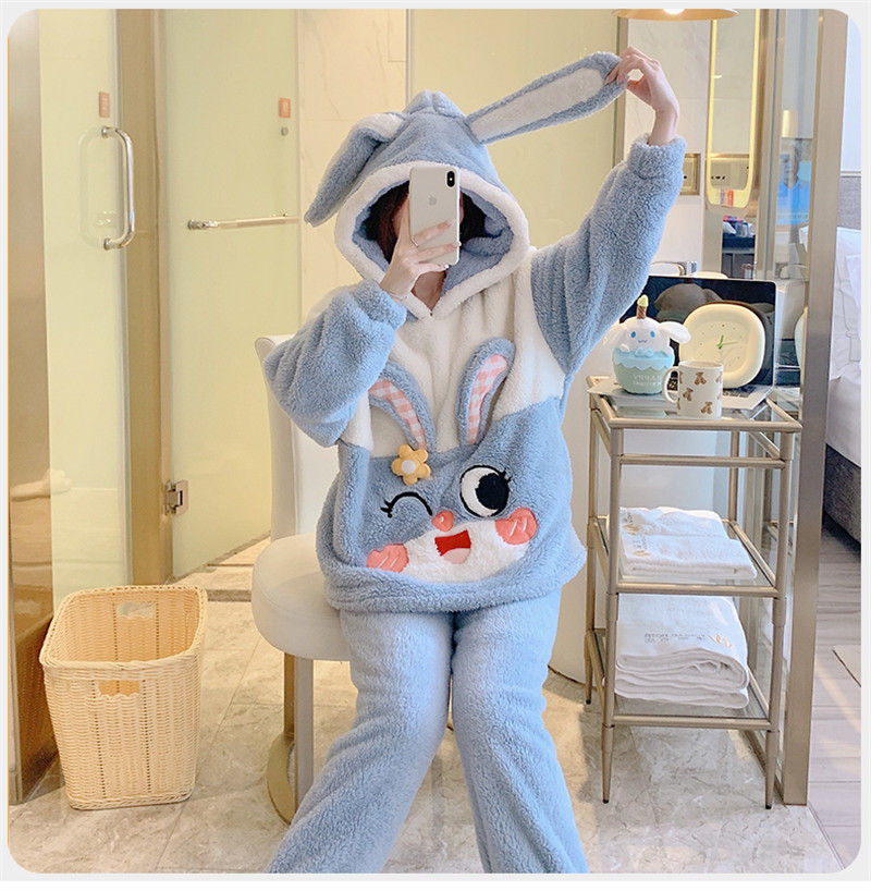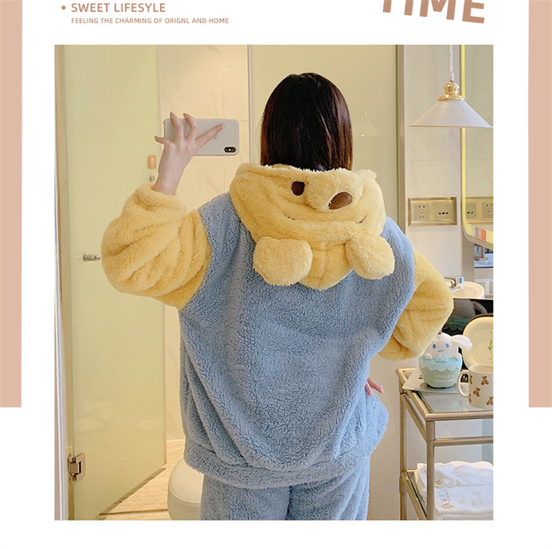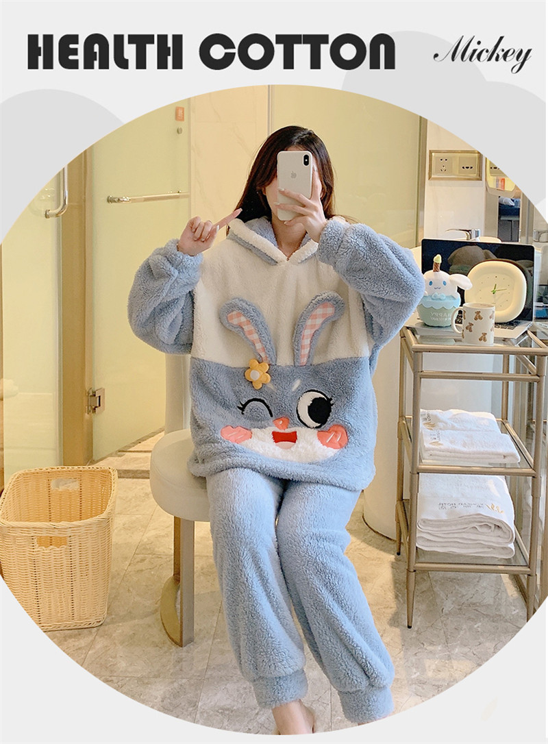 Зимняя коралловая бархатная милая пижама для школьников и студентов с капюшоном, утепленный демисезонный фланелевый комплект