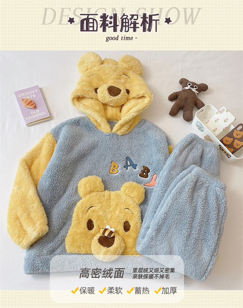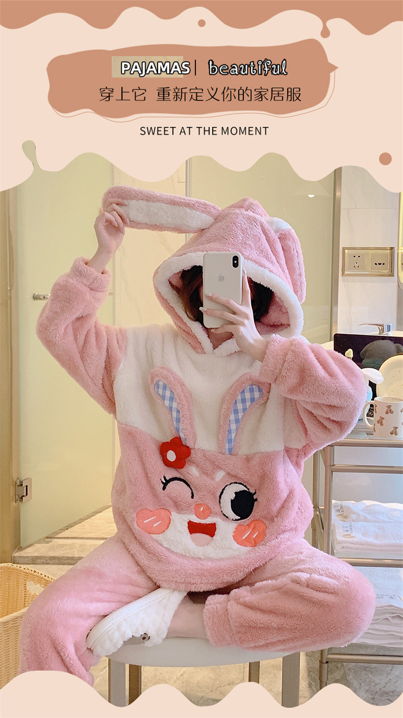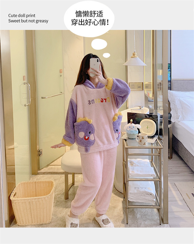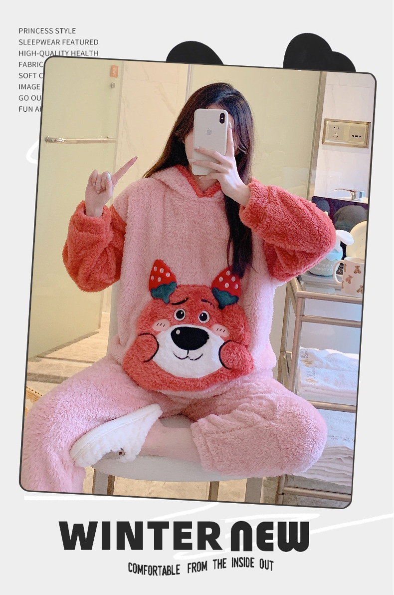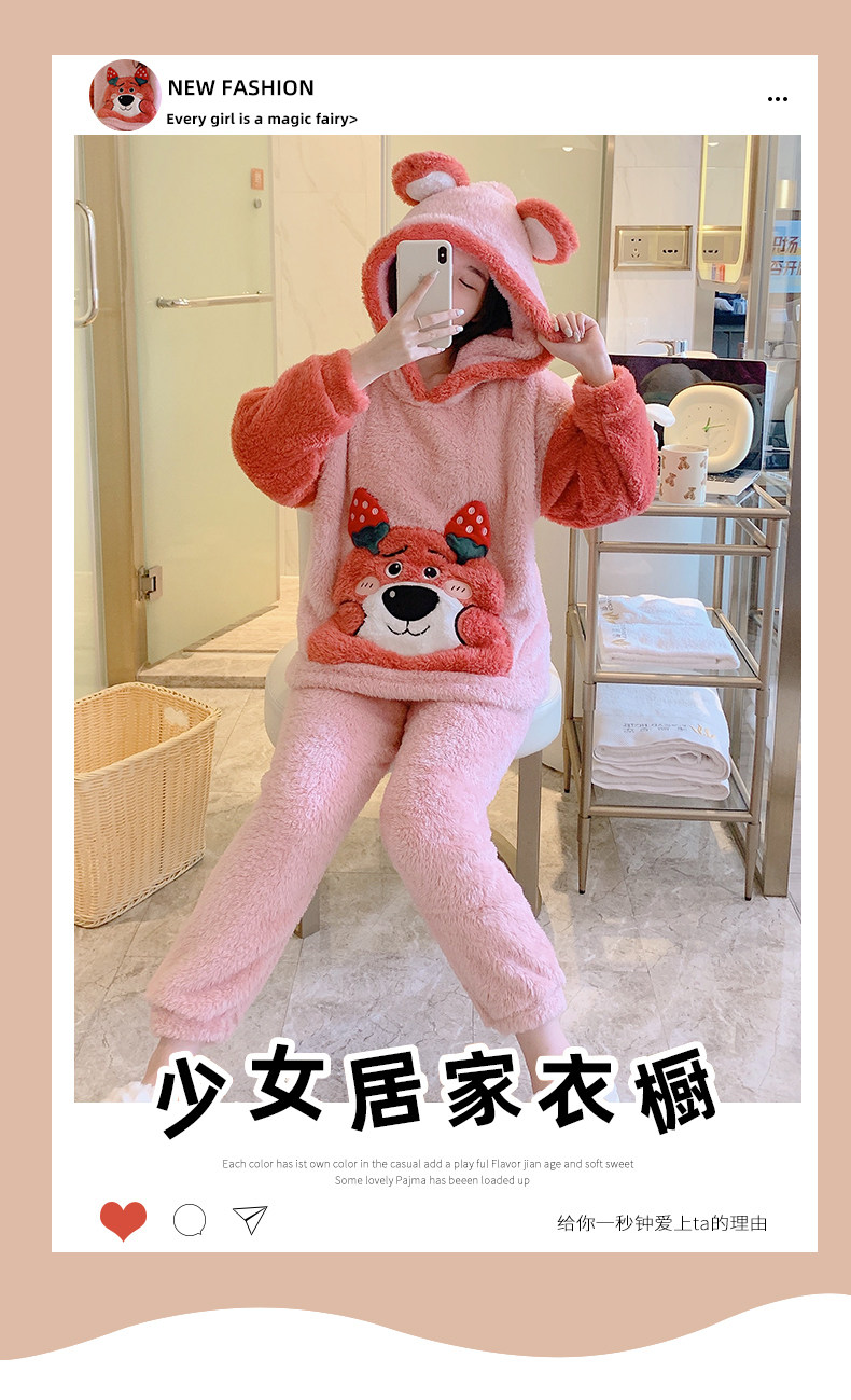 Зимняя коралловая бархатная милая пижама для школьников и студентов с капюшоном, утепленный демисезонный фланелевый комплект