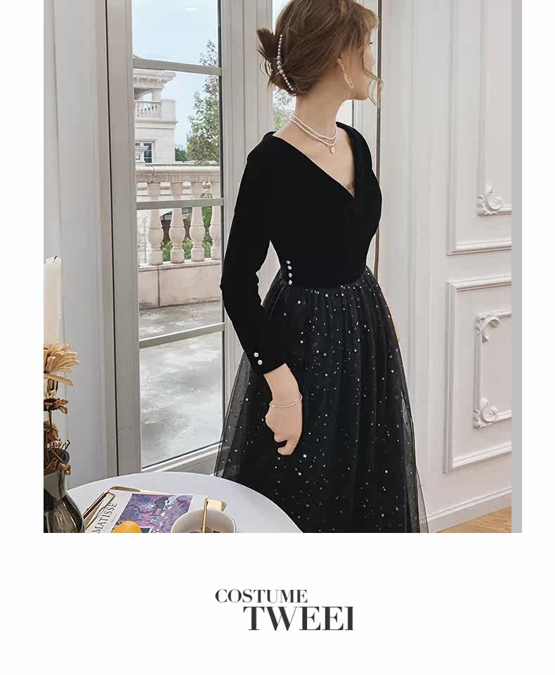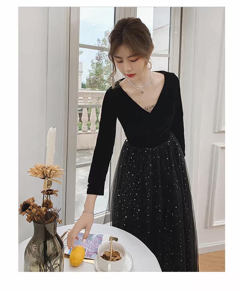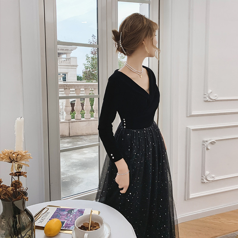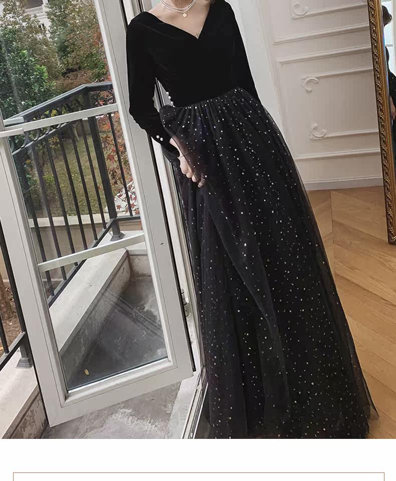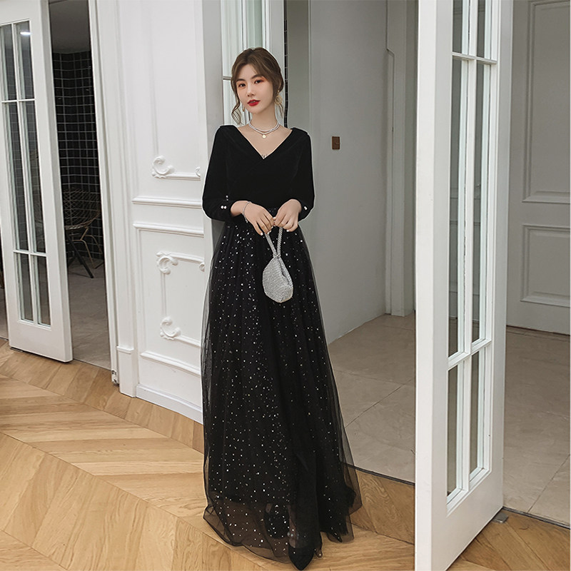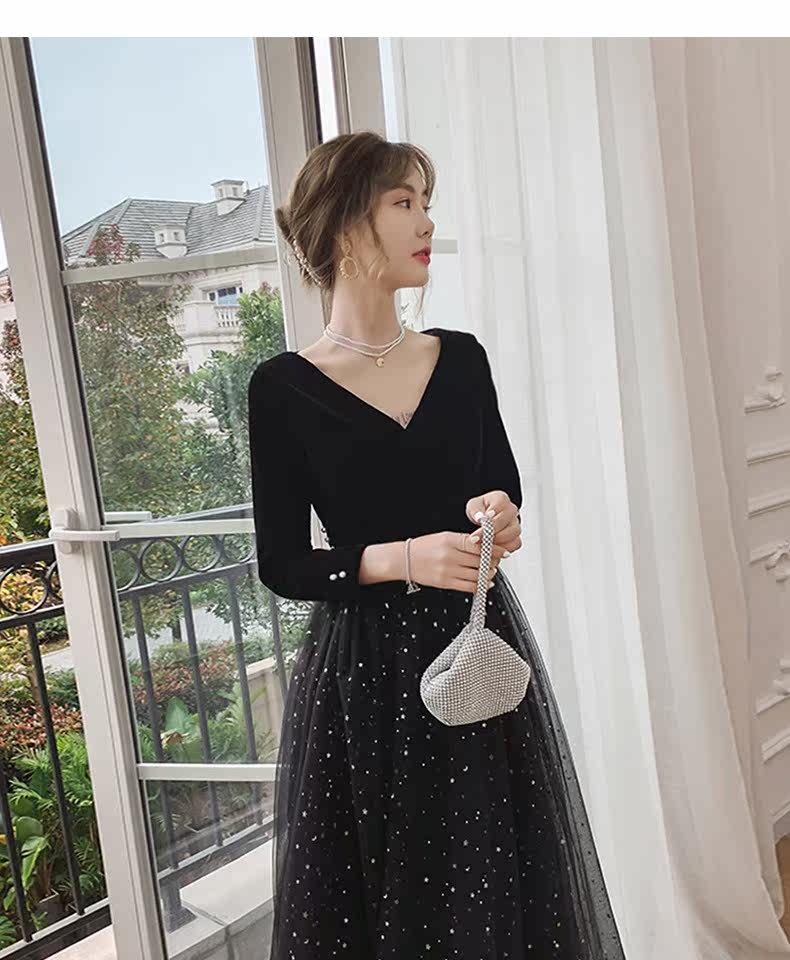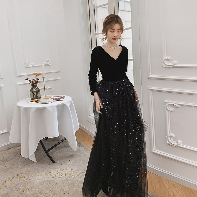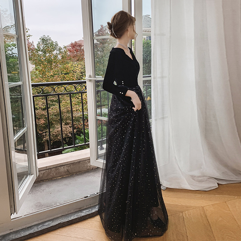 Вечернее платье, бархатный черный элитный элегантный лонгслив, длинное звездное небо, коллекция 2021