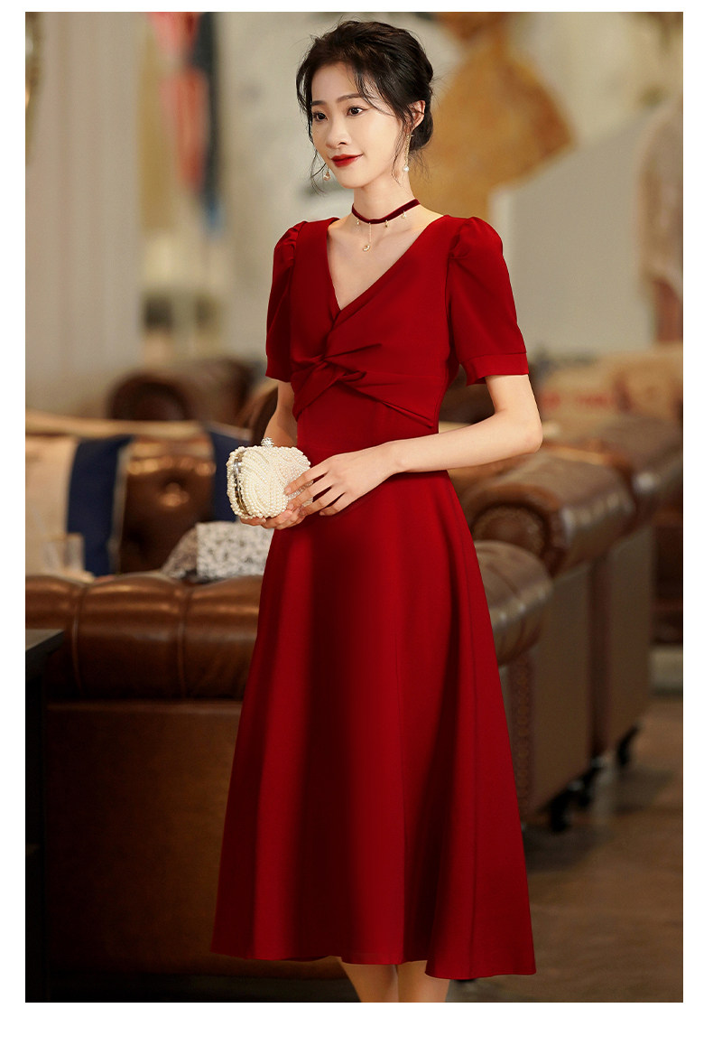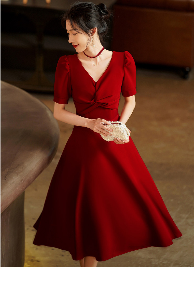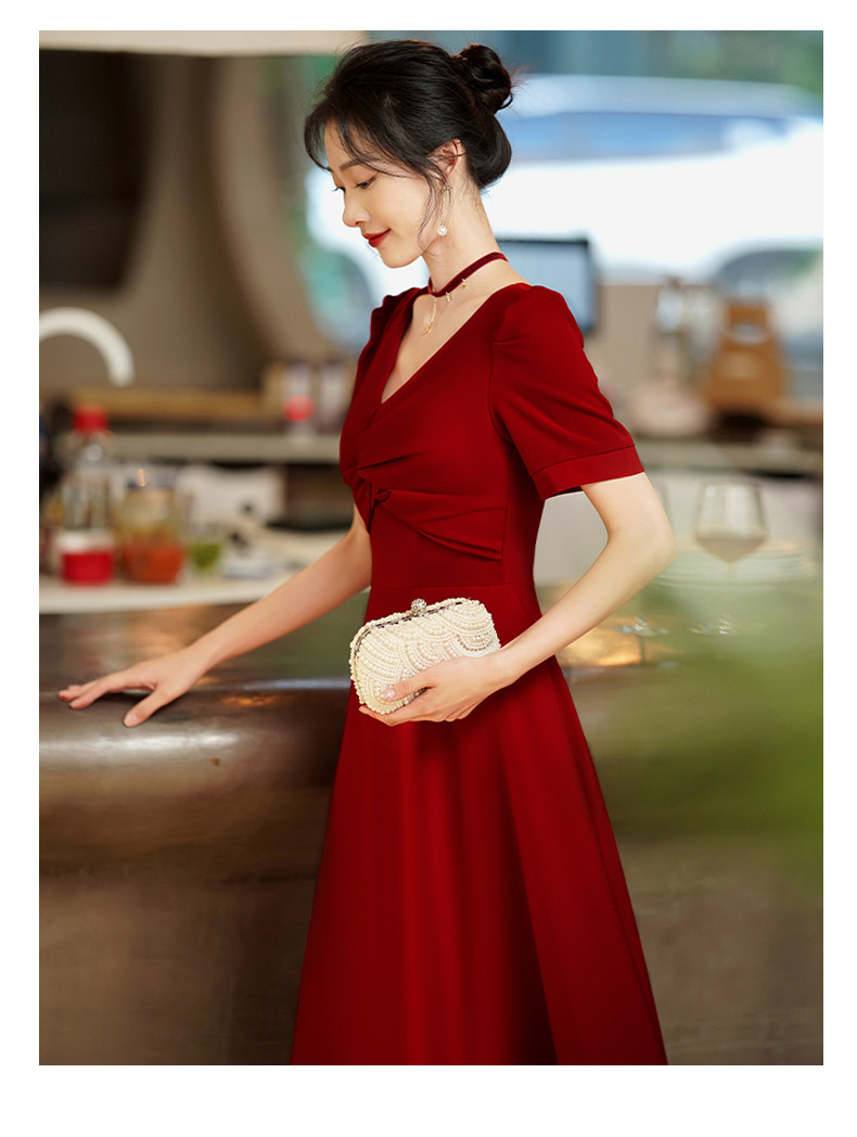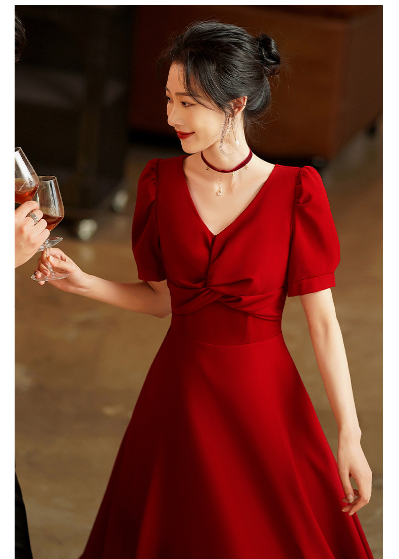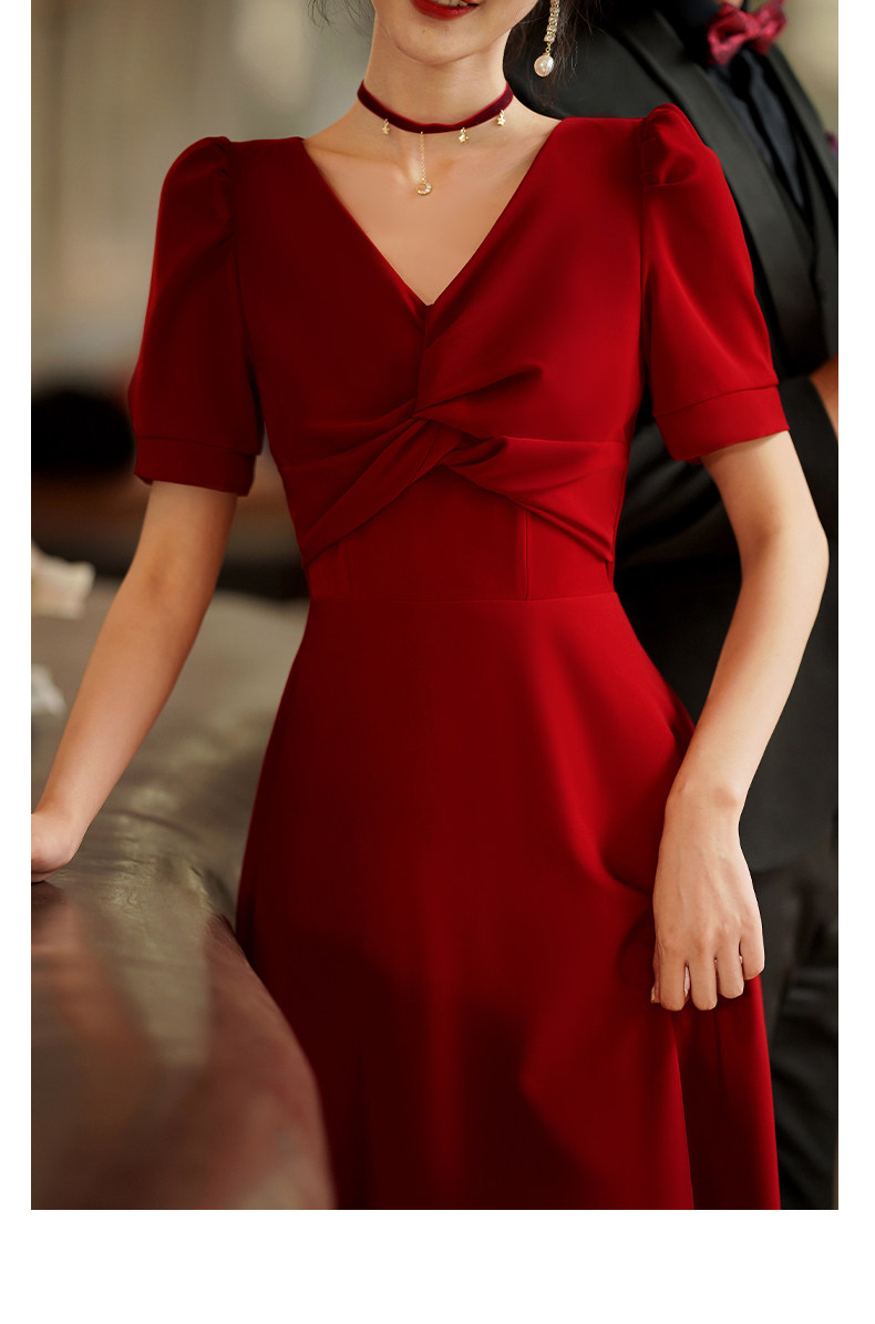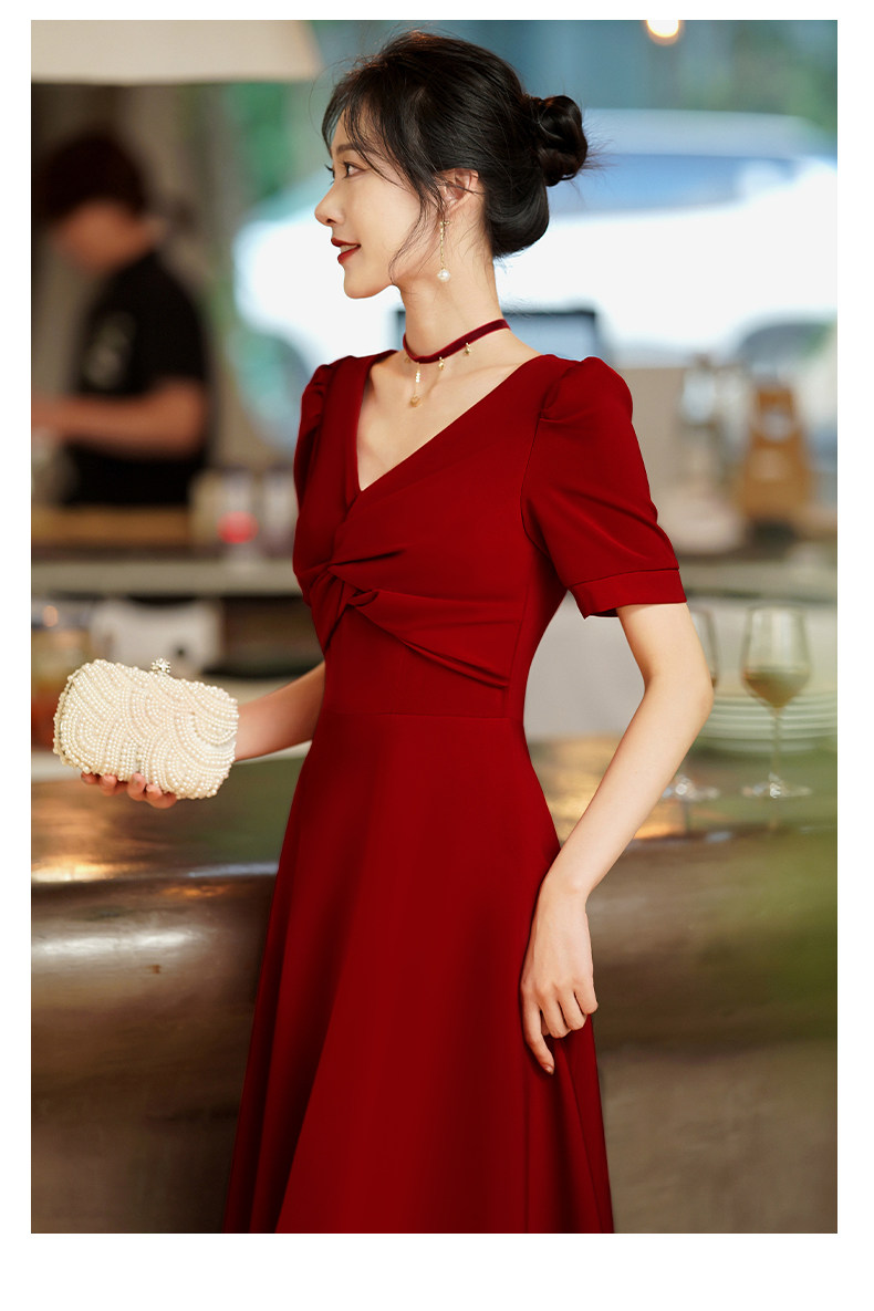 Короткое бордовое вечернее платье, V-образный вырез, яркий броский стиль
