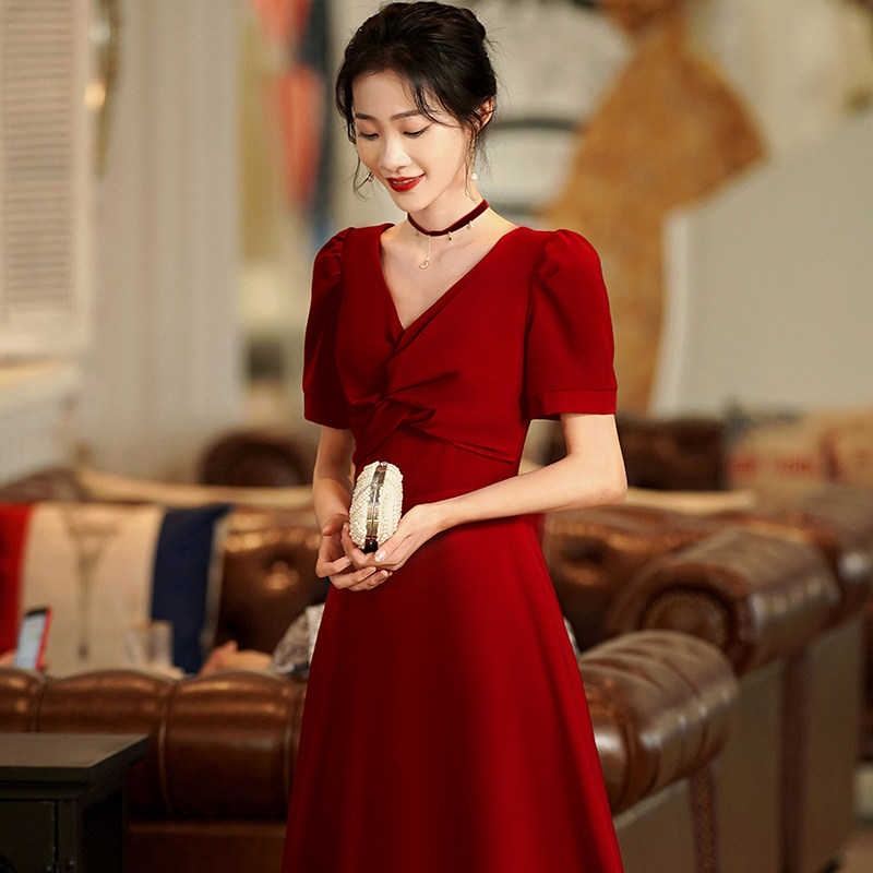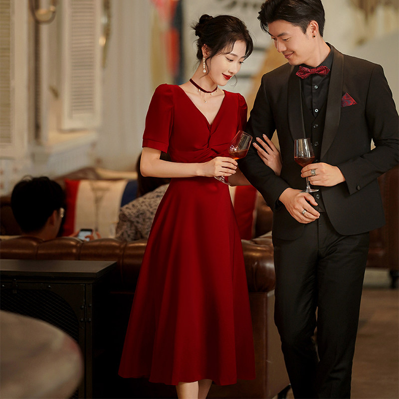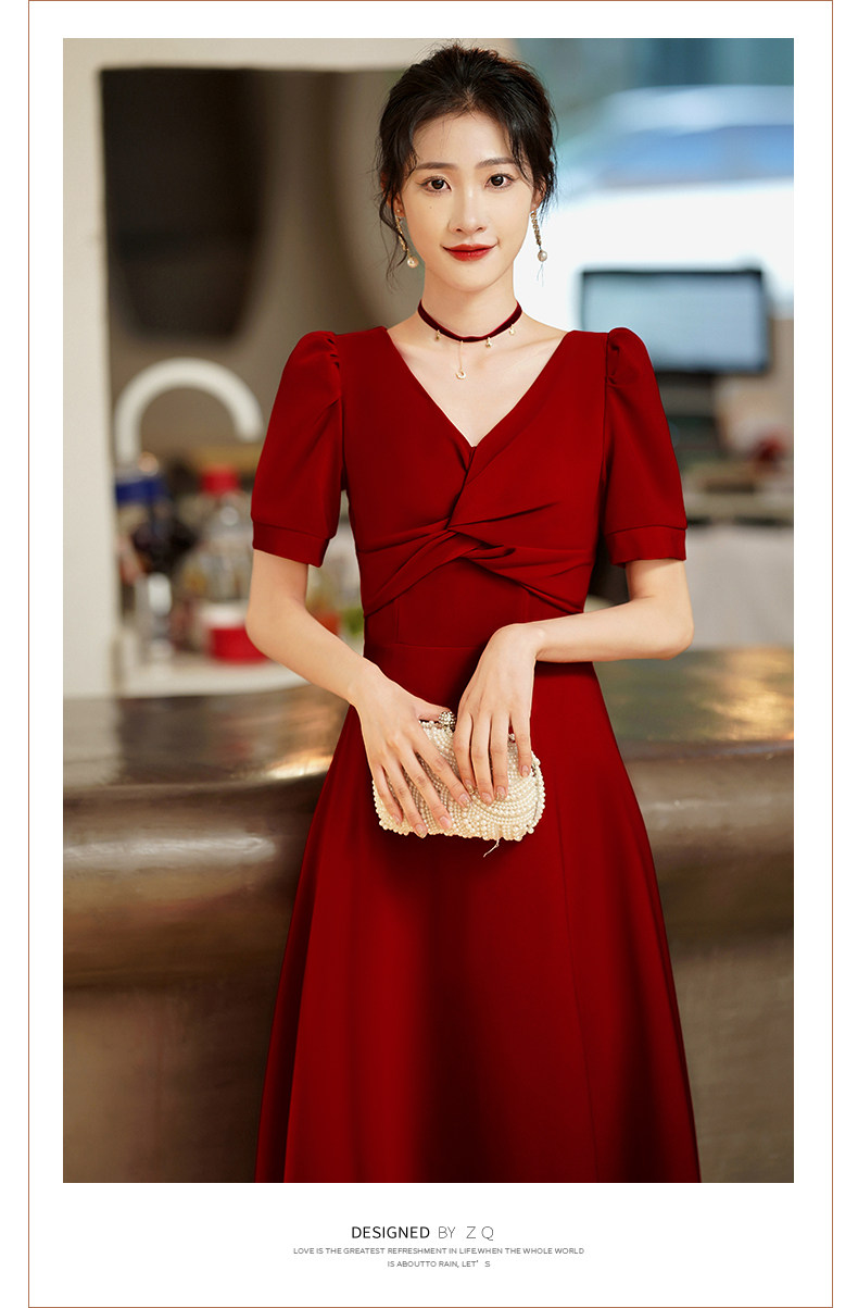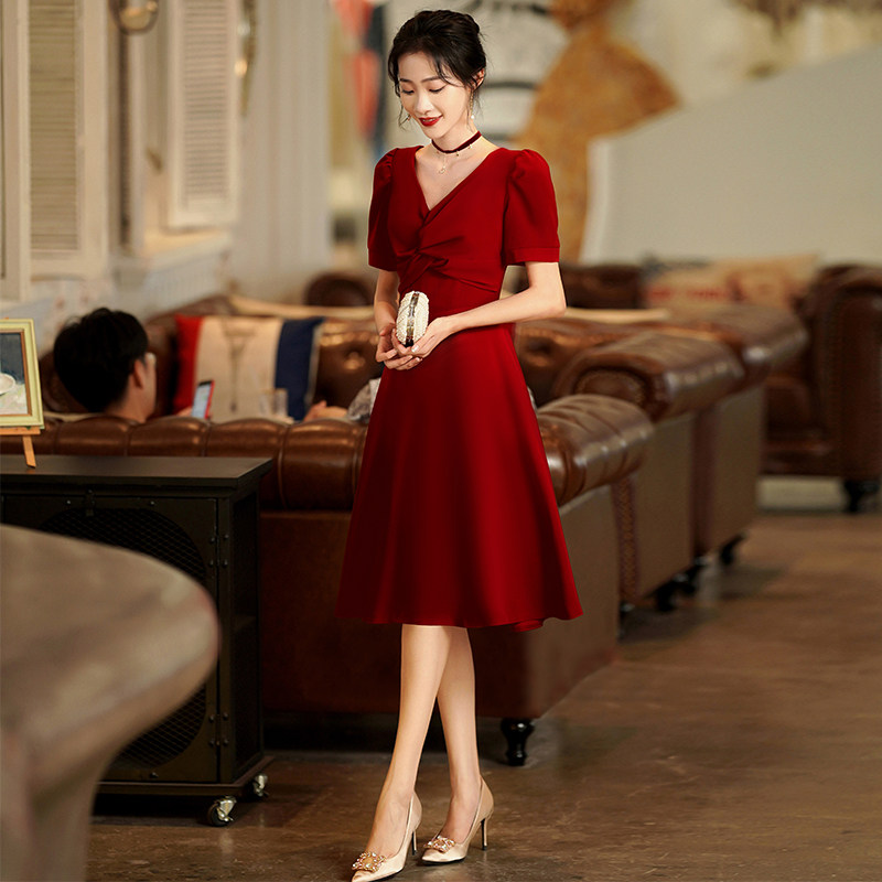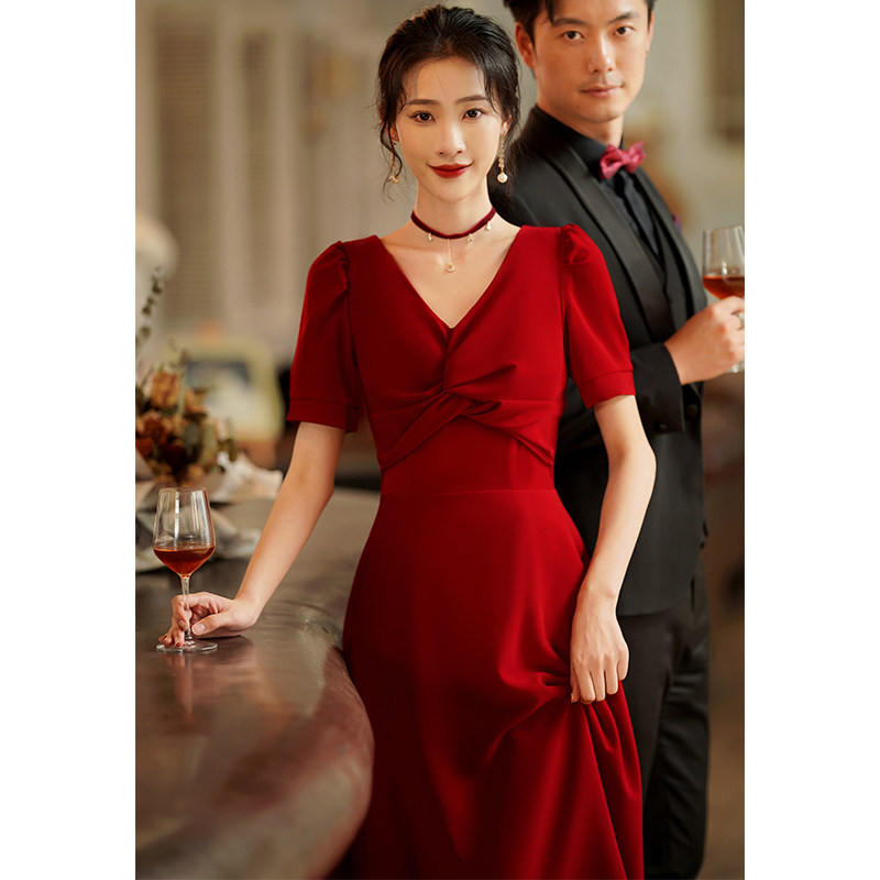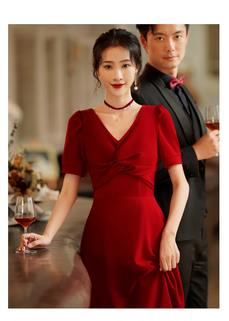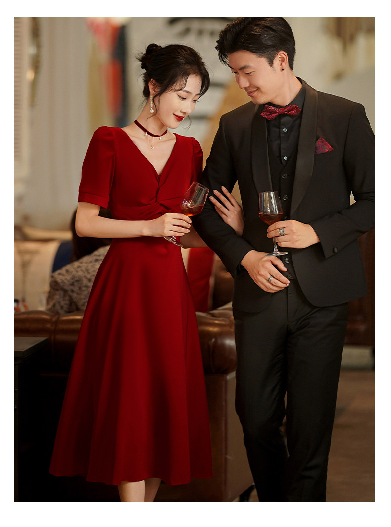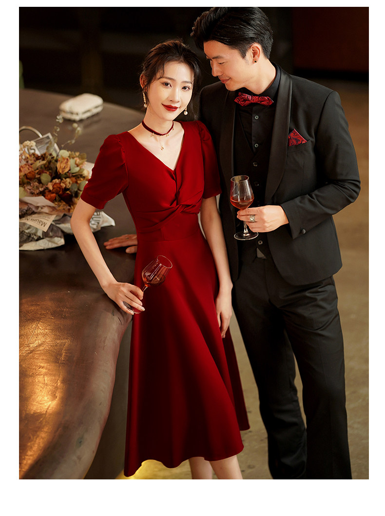 Короткое бордовое вечернее платье, V-образный вырез, яркий броский стиль