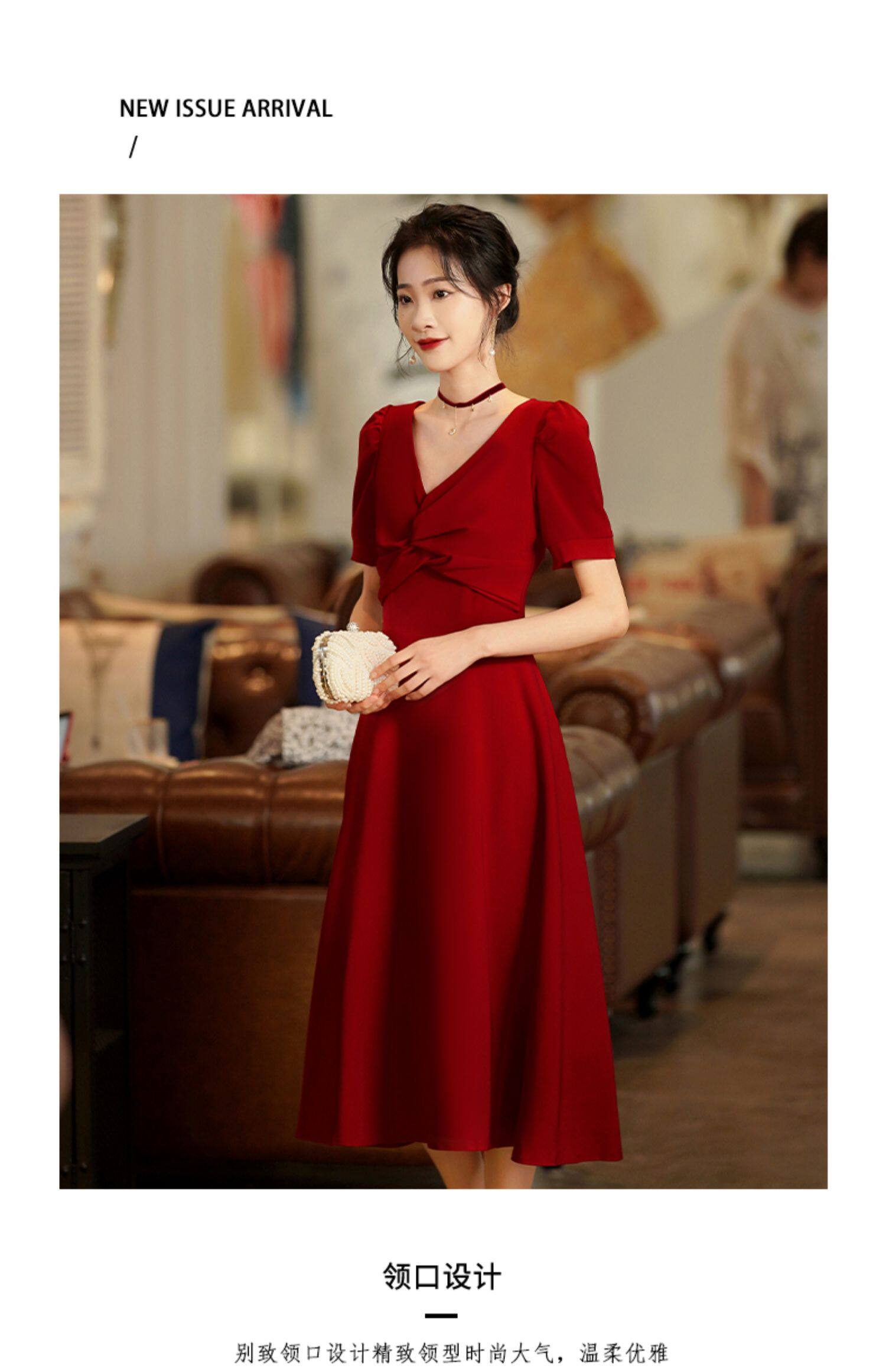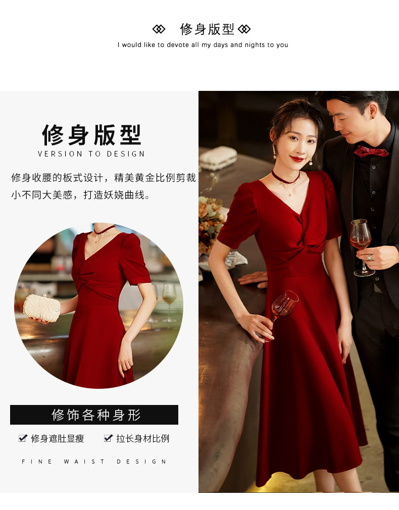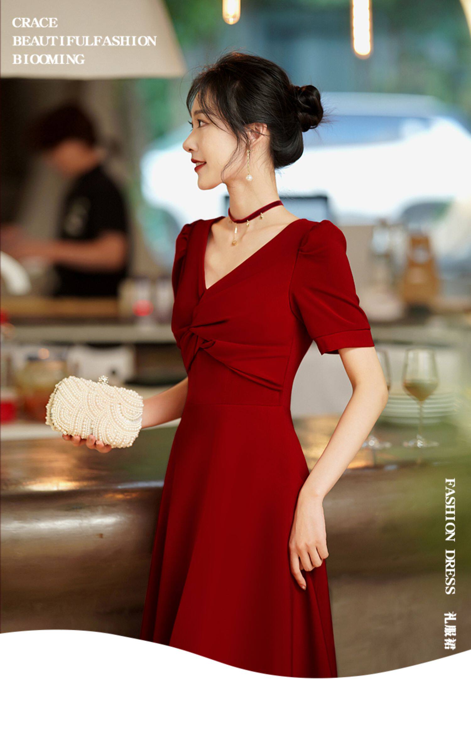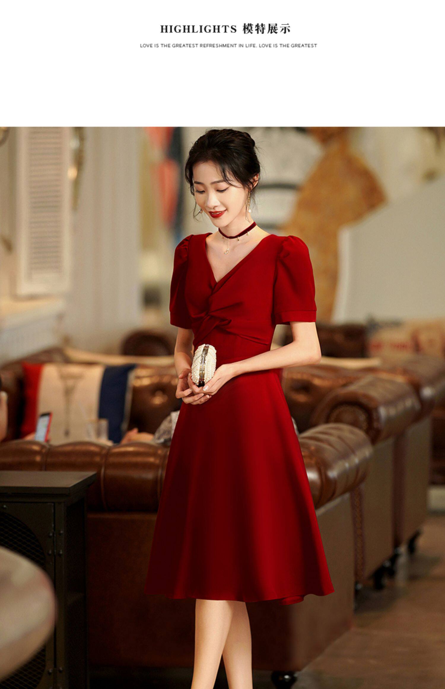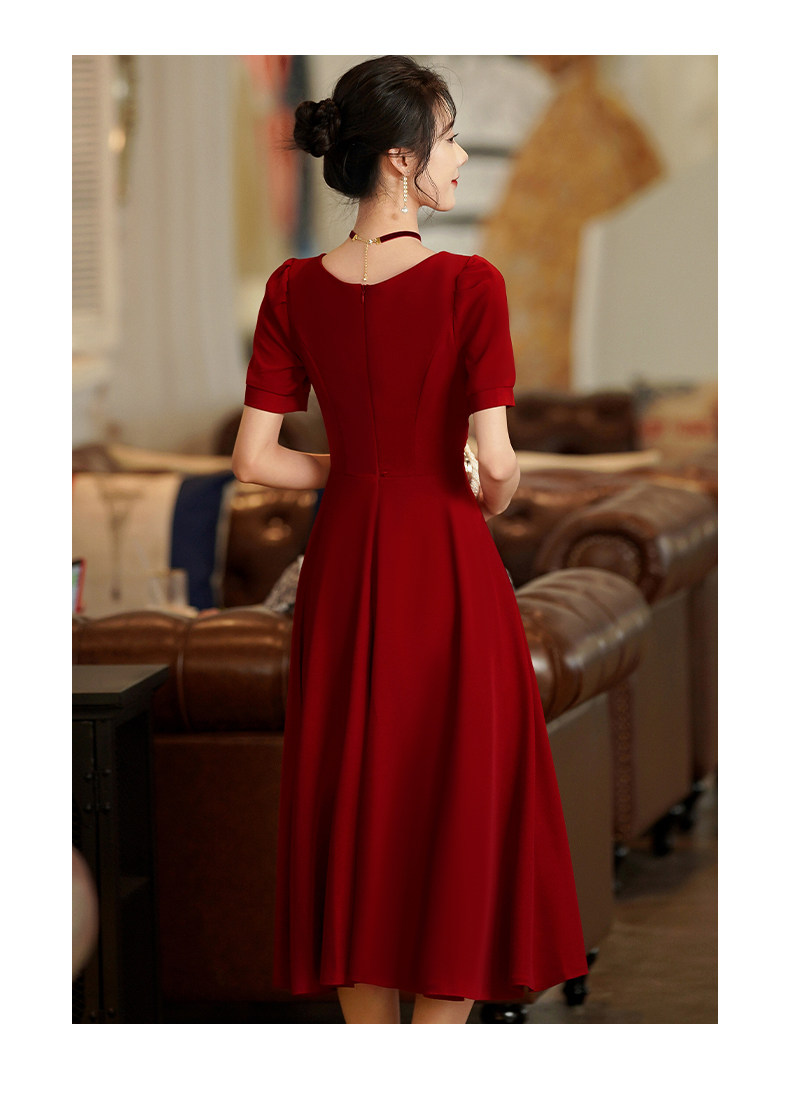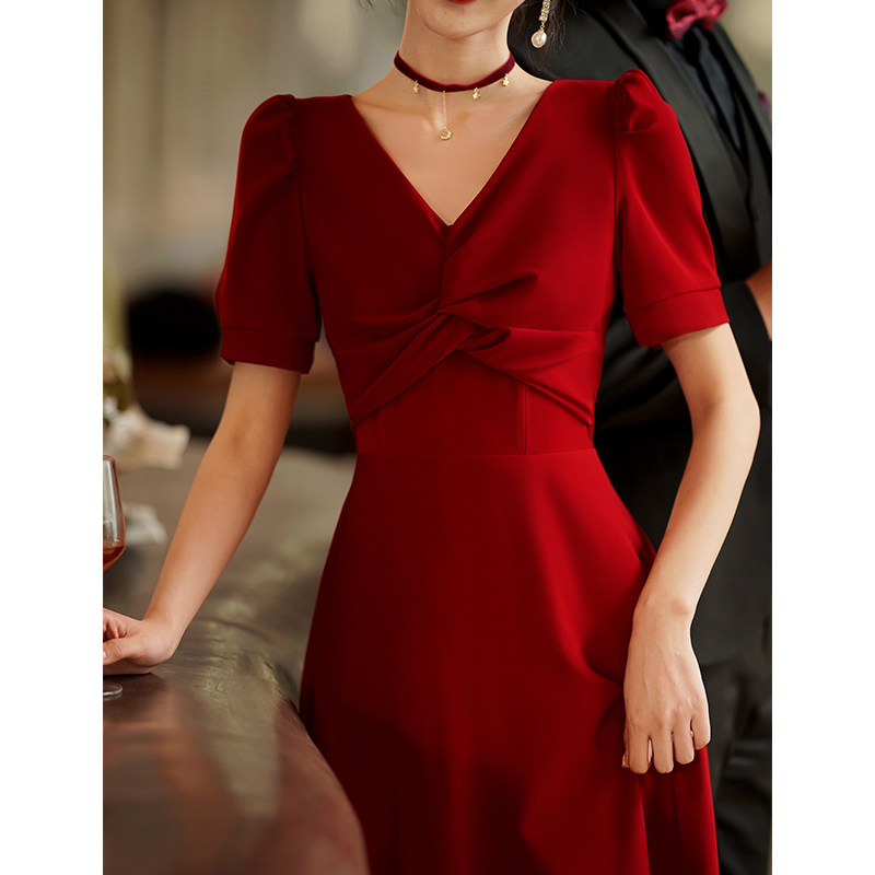 Короткое бордовое вечернее платье, V-образный вырез, яркий броский стиль