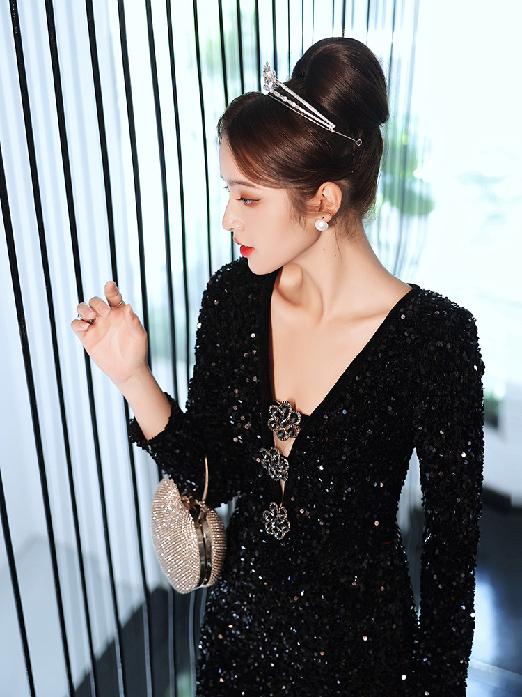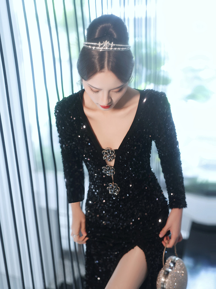 Черное вечернее платье 2025, новое нишевое классическое банкетное элегантное светское ежегодное вечернее платье с блестками