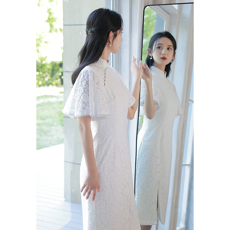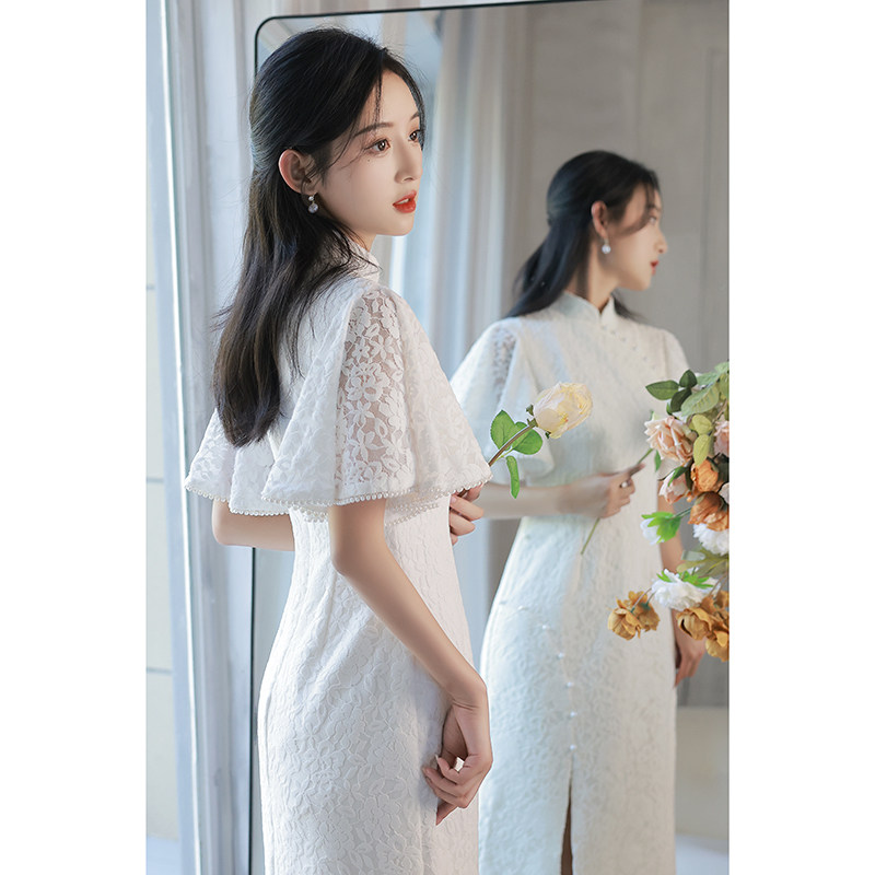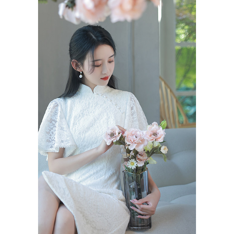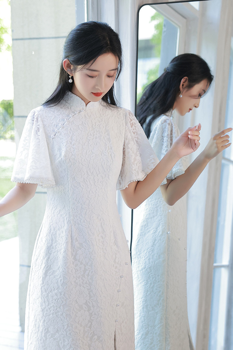 Белое ципао, платье, юбка, яркий броский стиль, по фигуре, китайский стиль