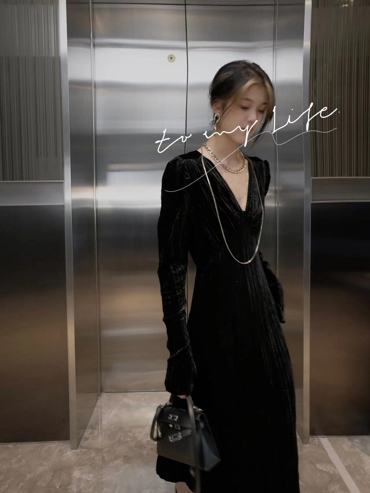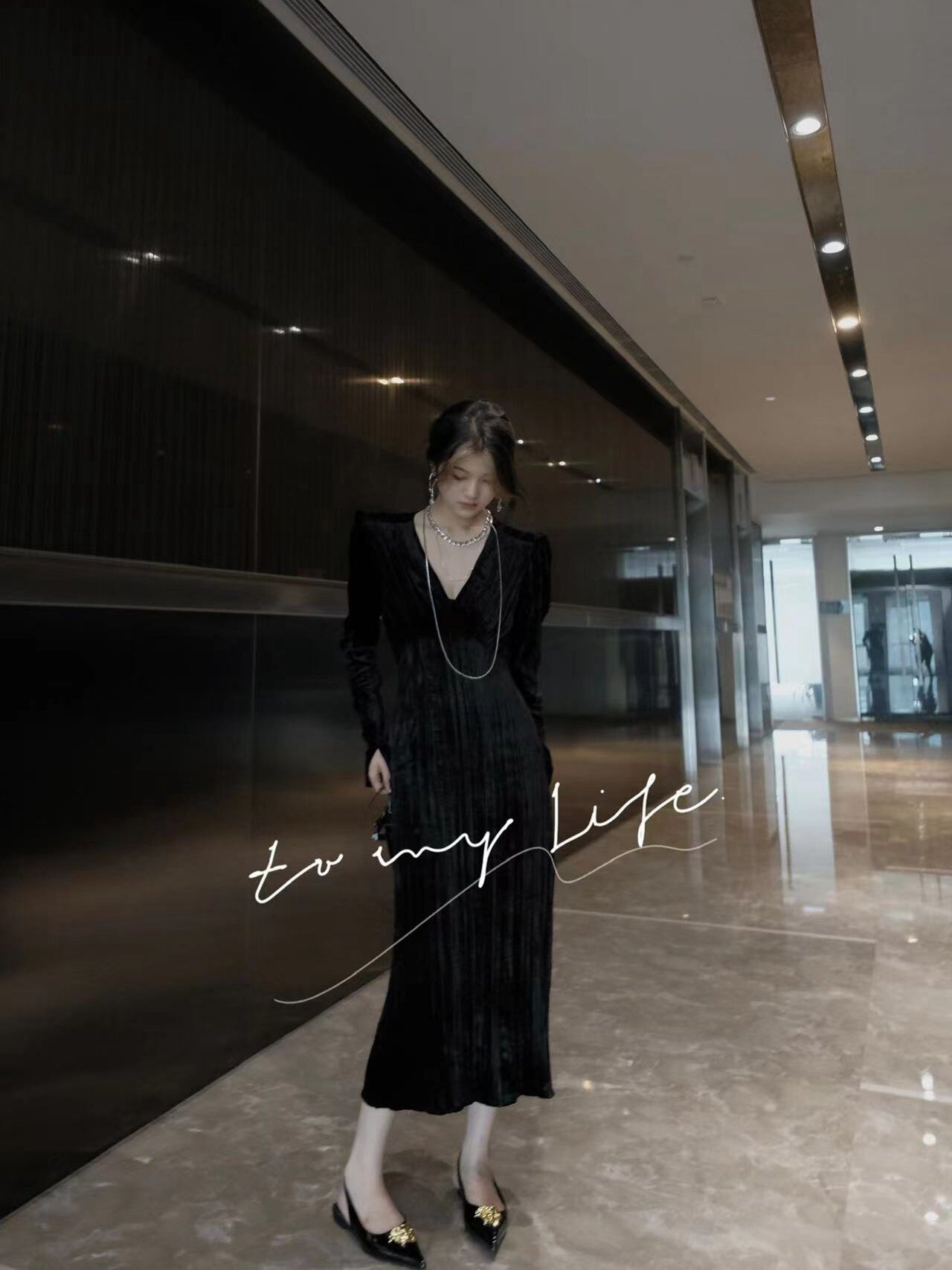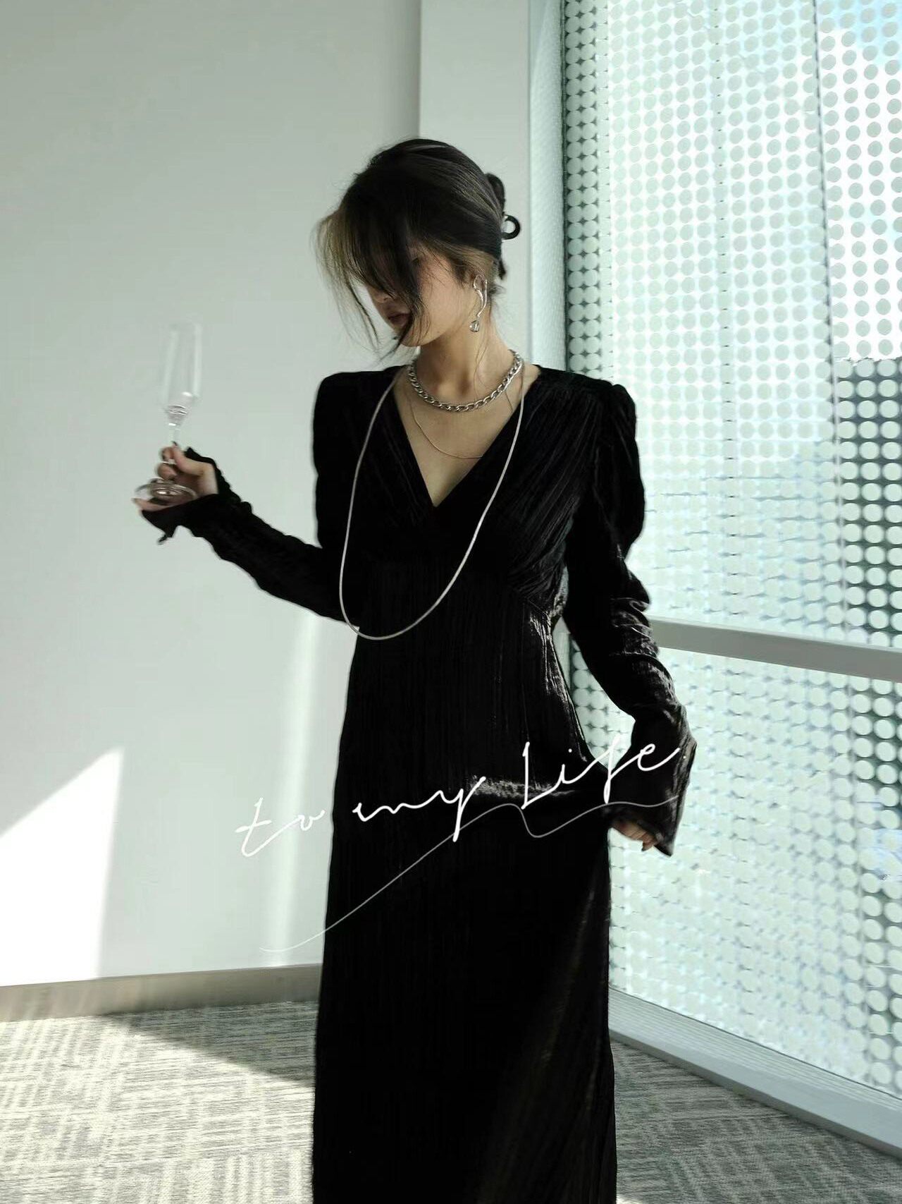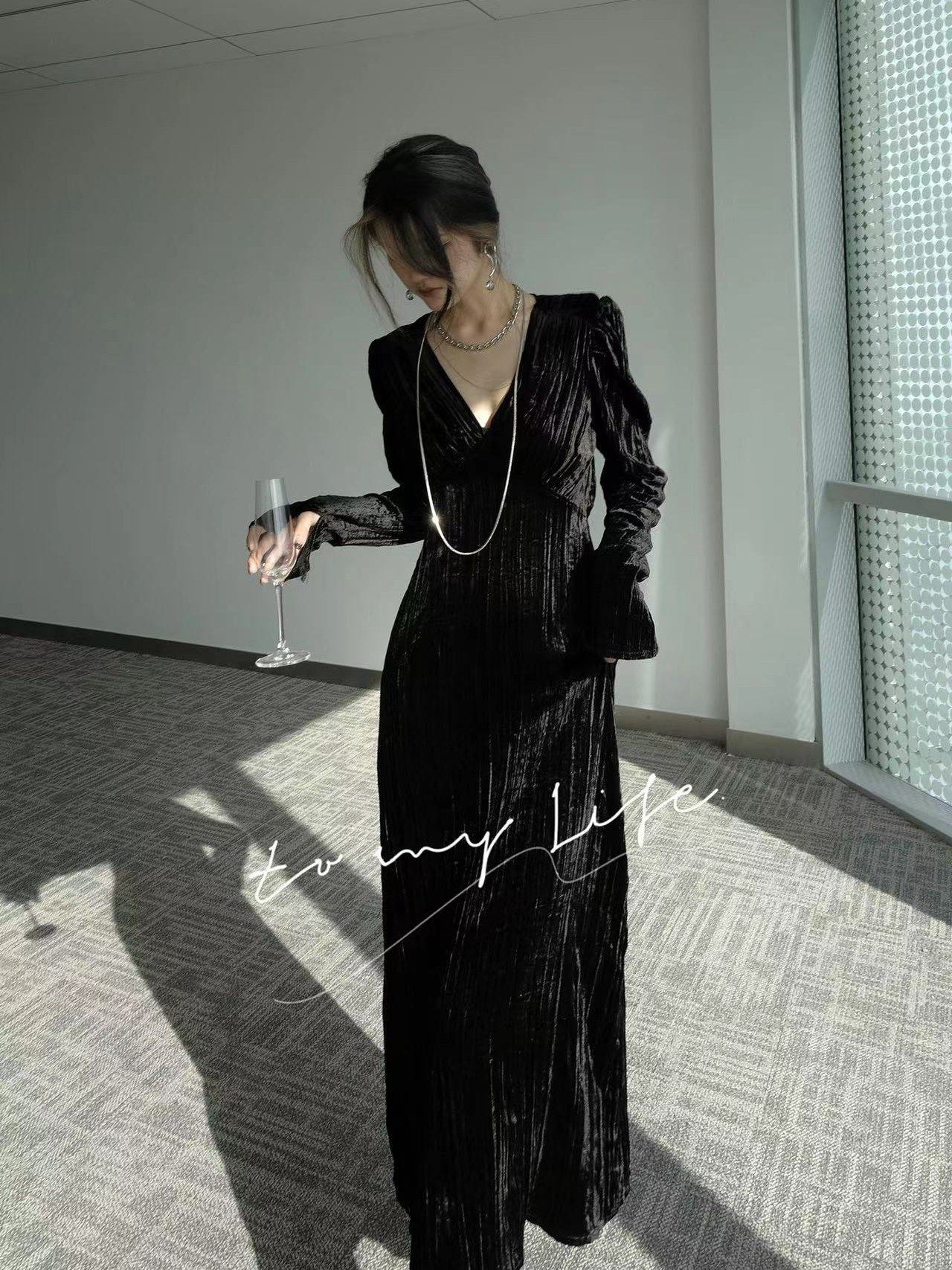 Черное элегантное элитное бархатное осеннее вечернее платье, французский стиль, V-образный вырез