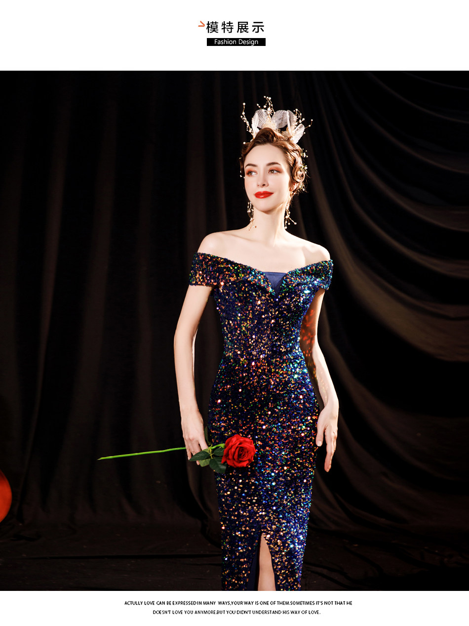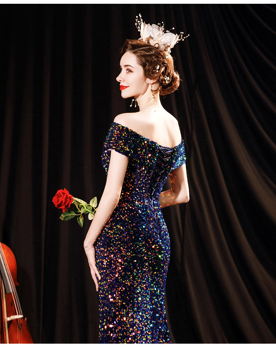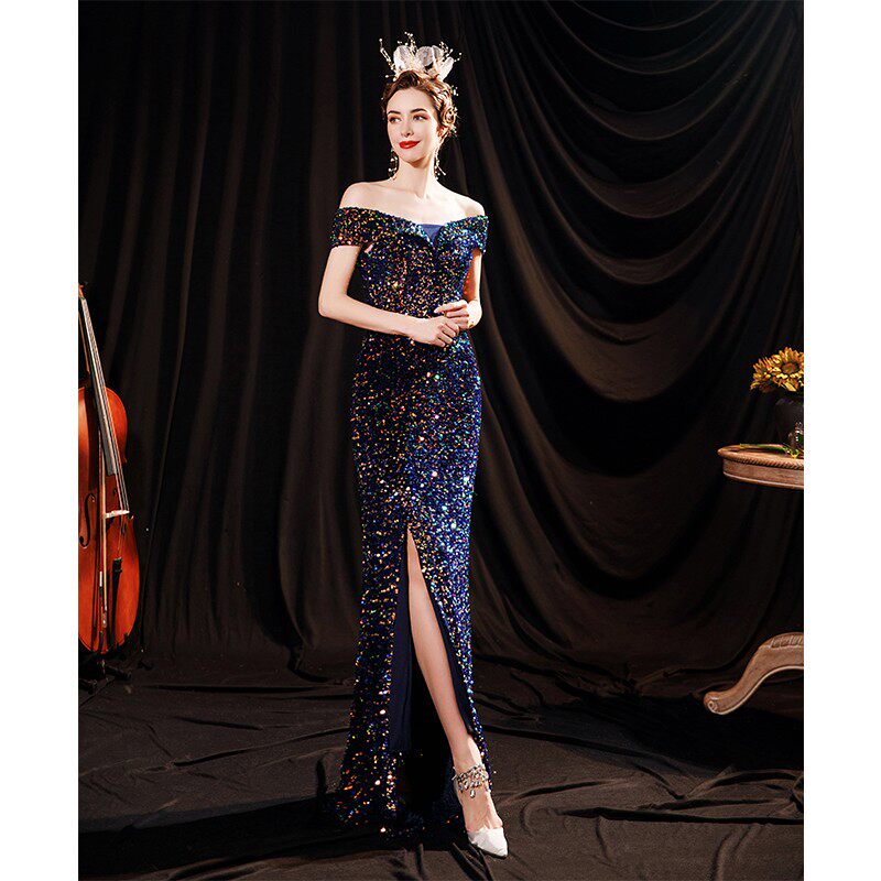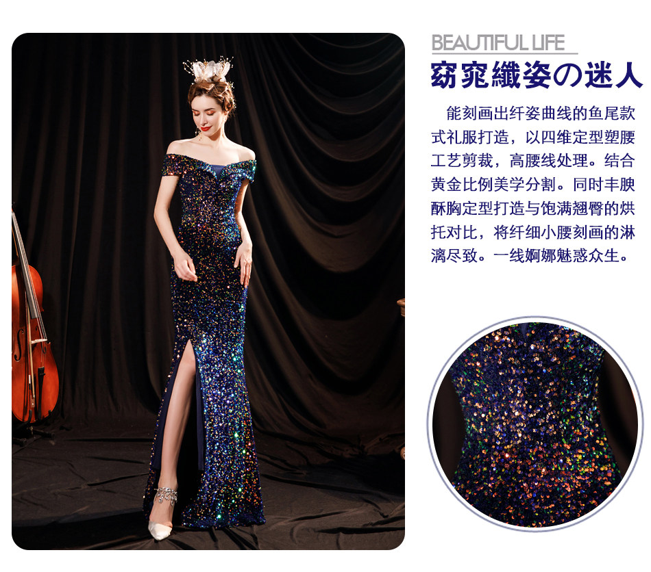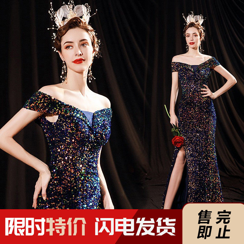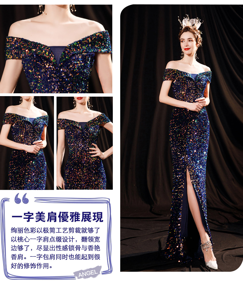 Свадебное платье ангела Блестящее синее звездное банкет Банкет с днем рождения с расщепленным свадебным платьем вечернее платье 17069