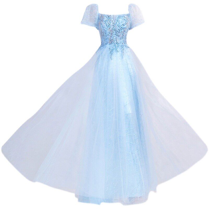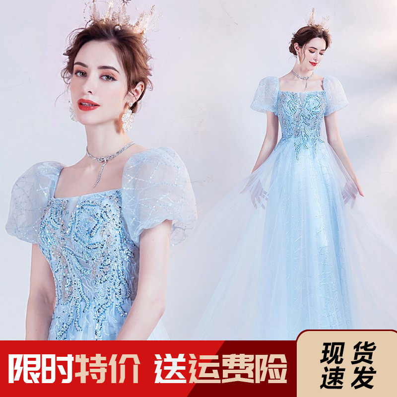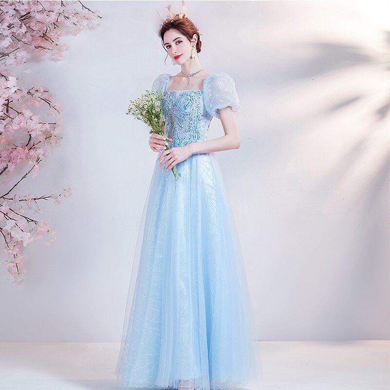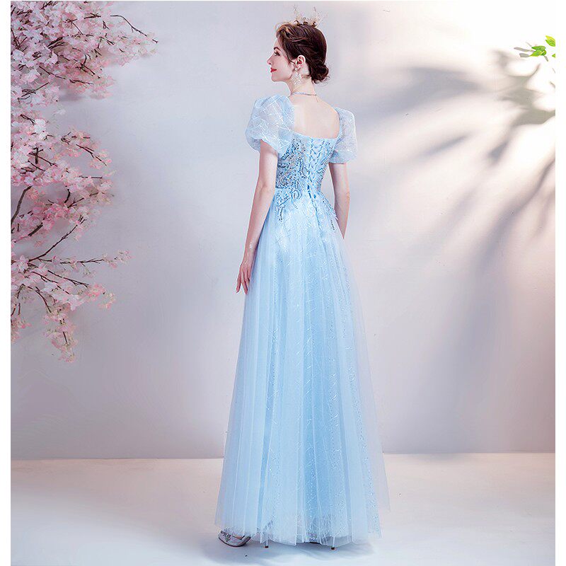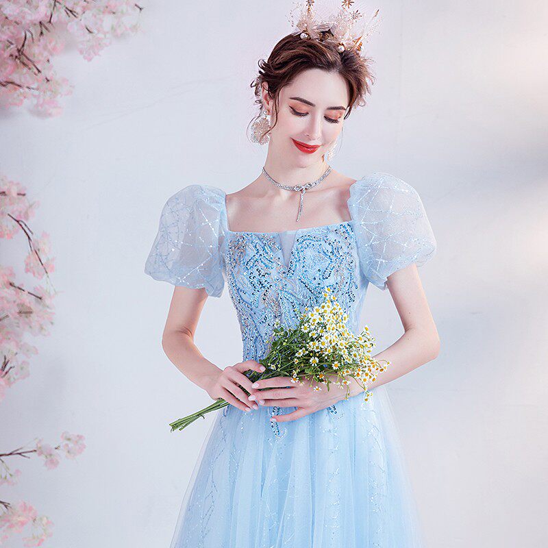 Синее свадебное платье, рукава фонарики, для подиума