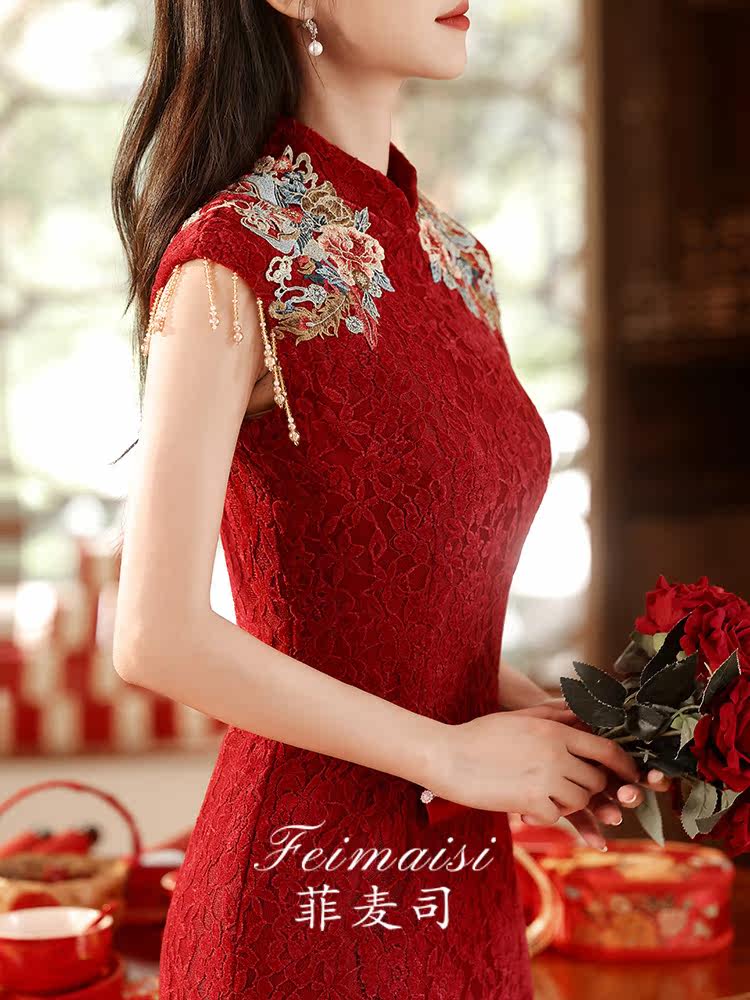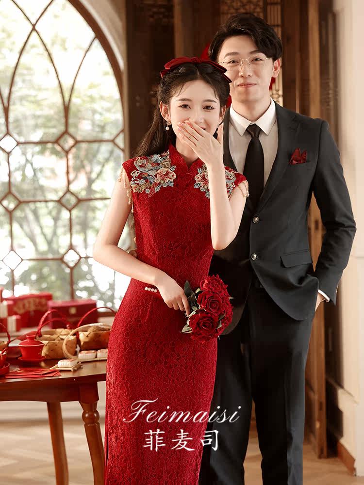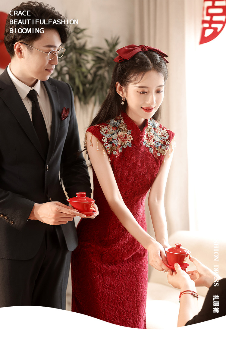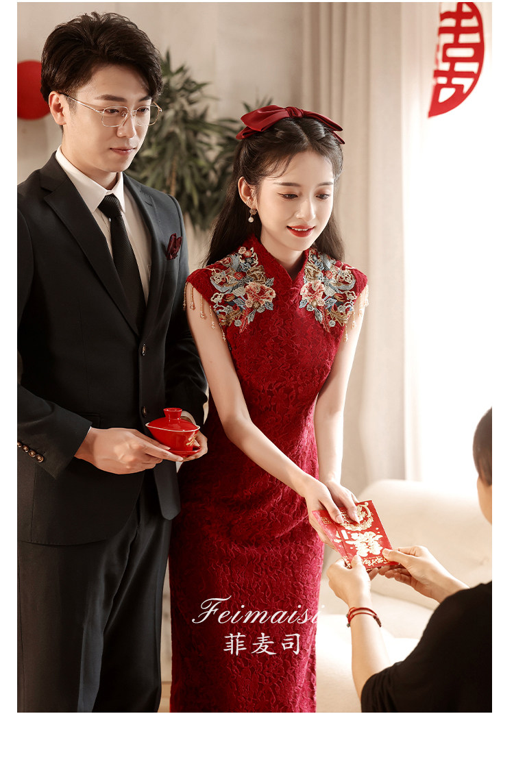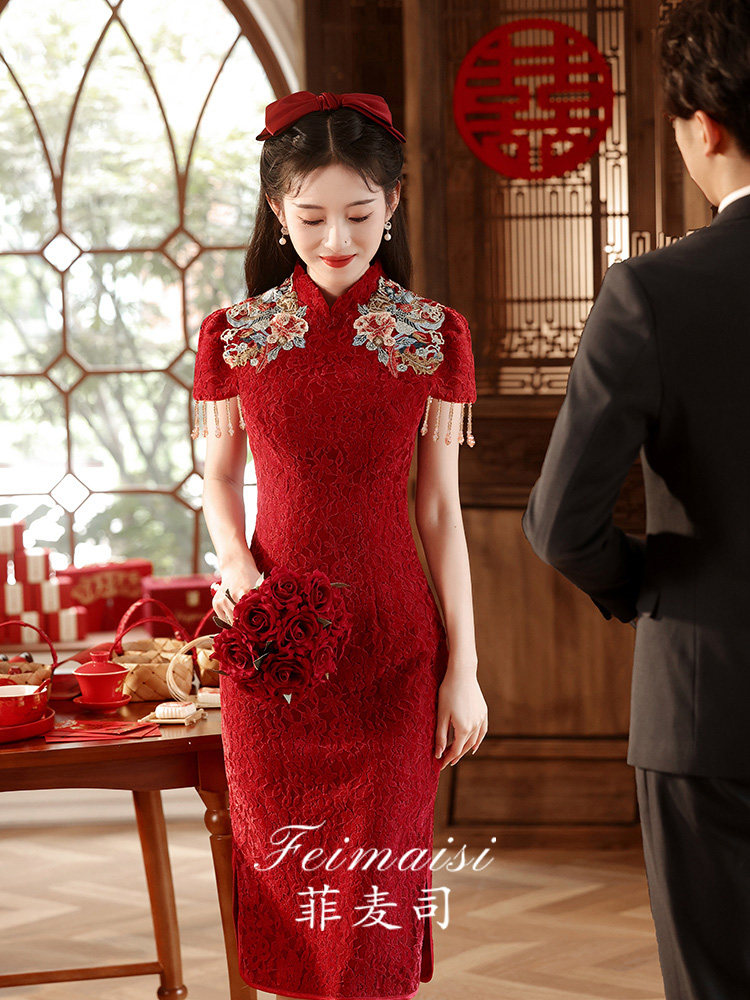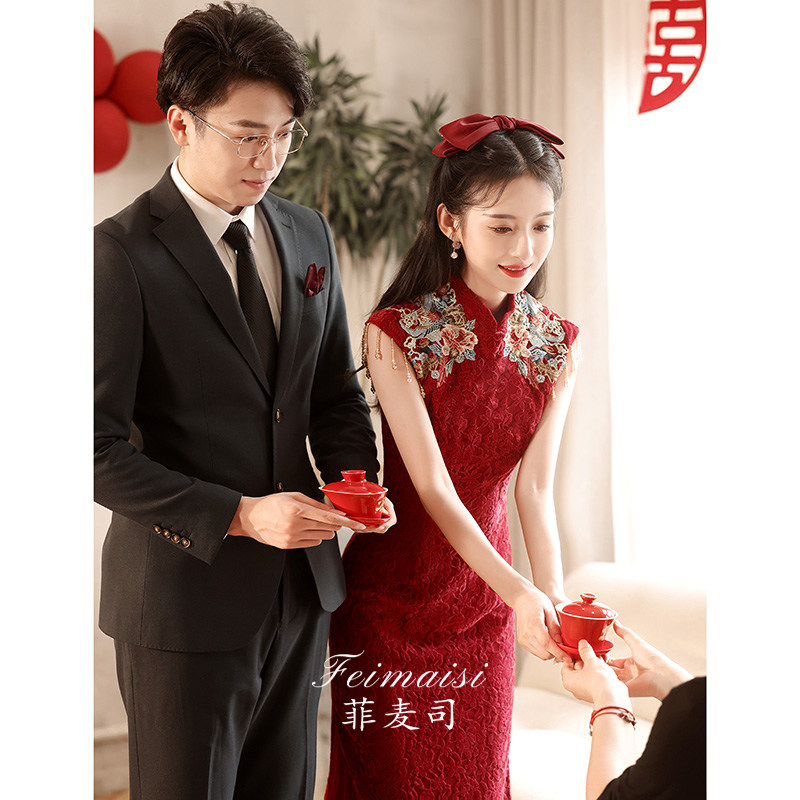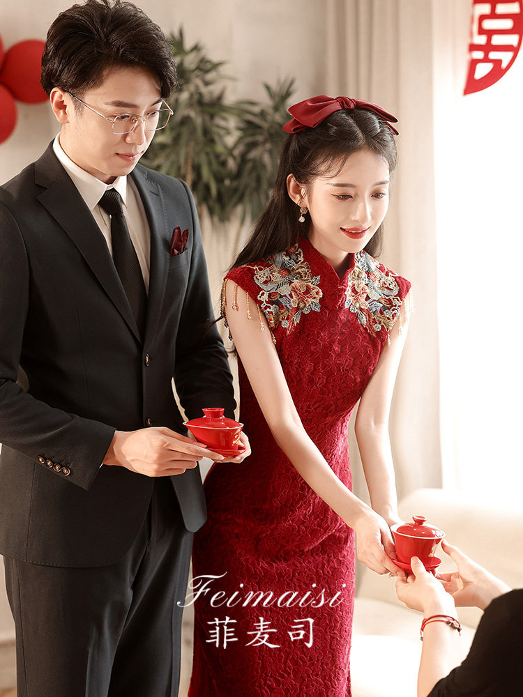 Ципао, бордовое вечернее платье, юбка, свадебное платье, китайский стиль, с вышивкой, подходит для подростков