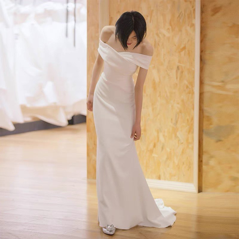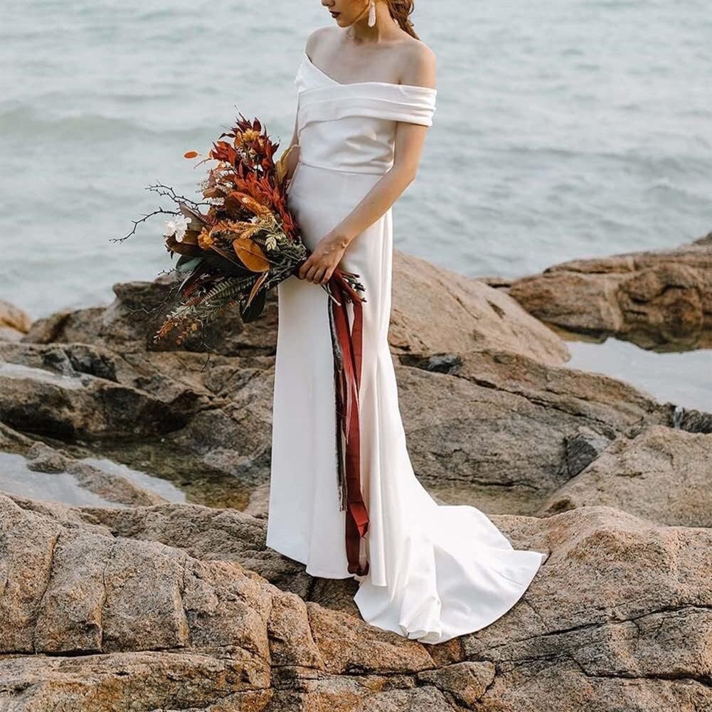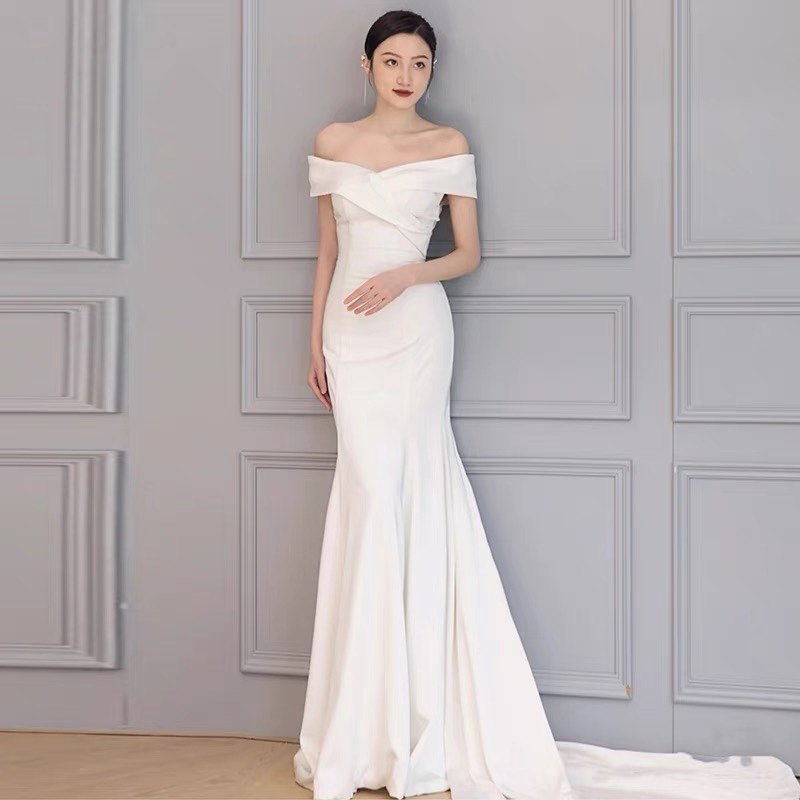 Белое свадебное платье, вечернее платье, открытые плечи, европейский стиль, Aliexpress, облегающий крой, крой «рыбий хвост»