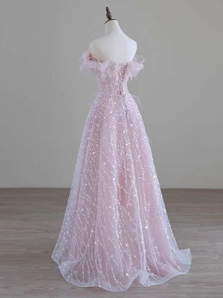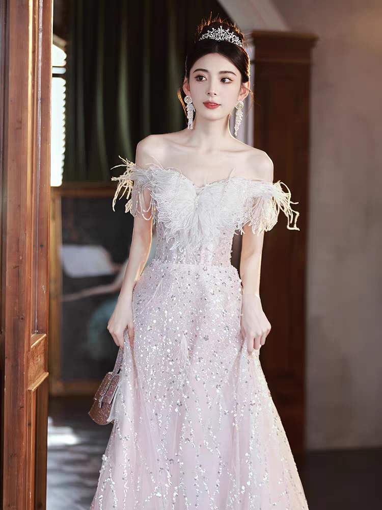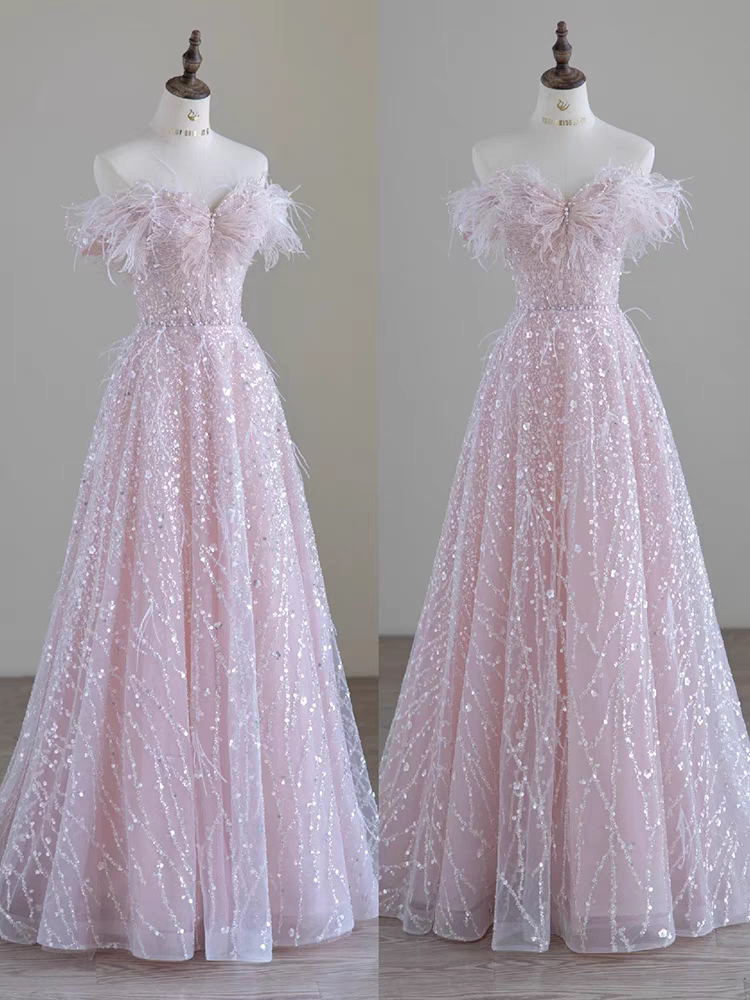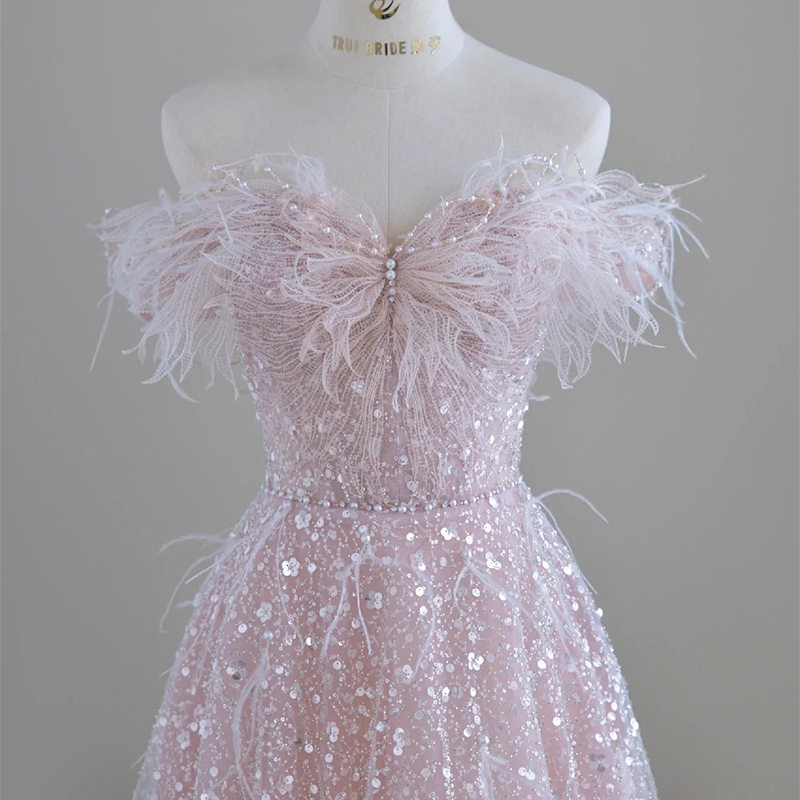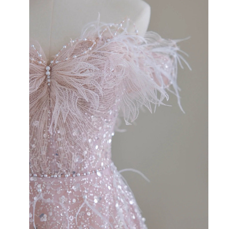 Розовое вечернее платье, наряд маленькой принцессы, набивка пером, изысканный стиль, открытые плечи