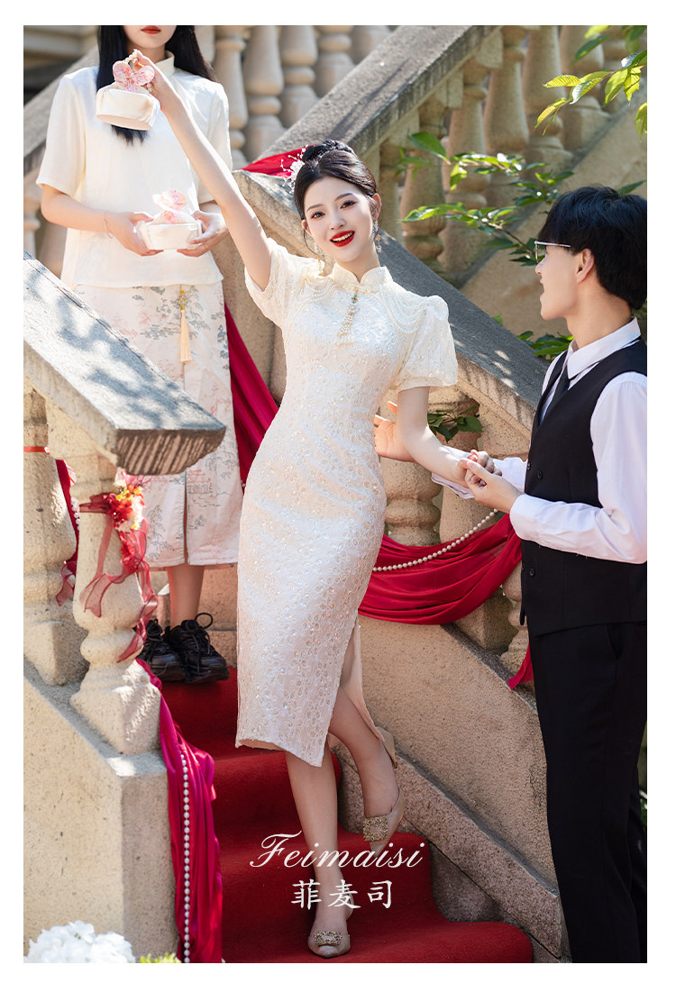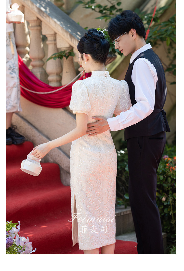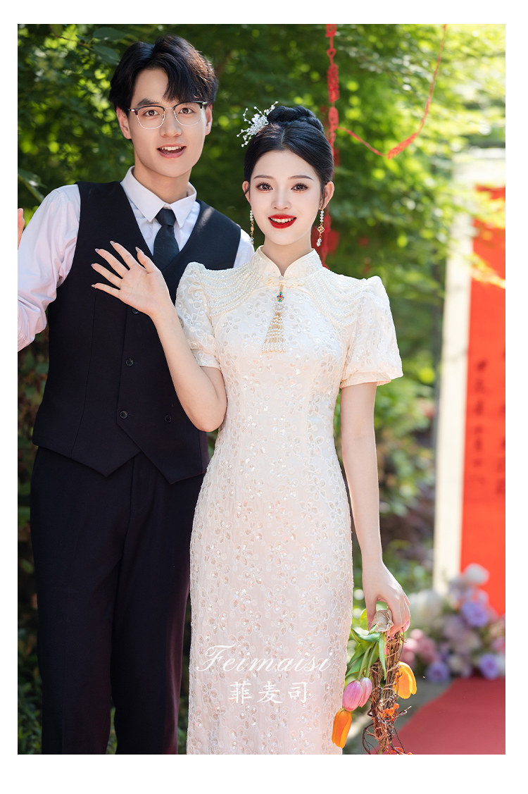 Свадебное платье, вечернее платье, ципао, китайский стиль, цвета шампанского, квадратный вырез