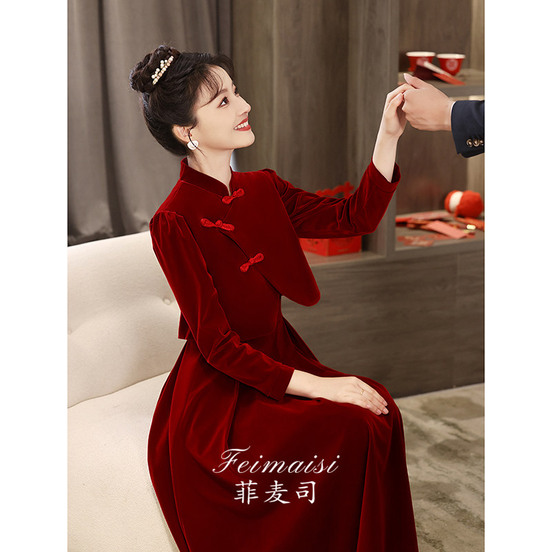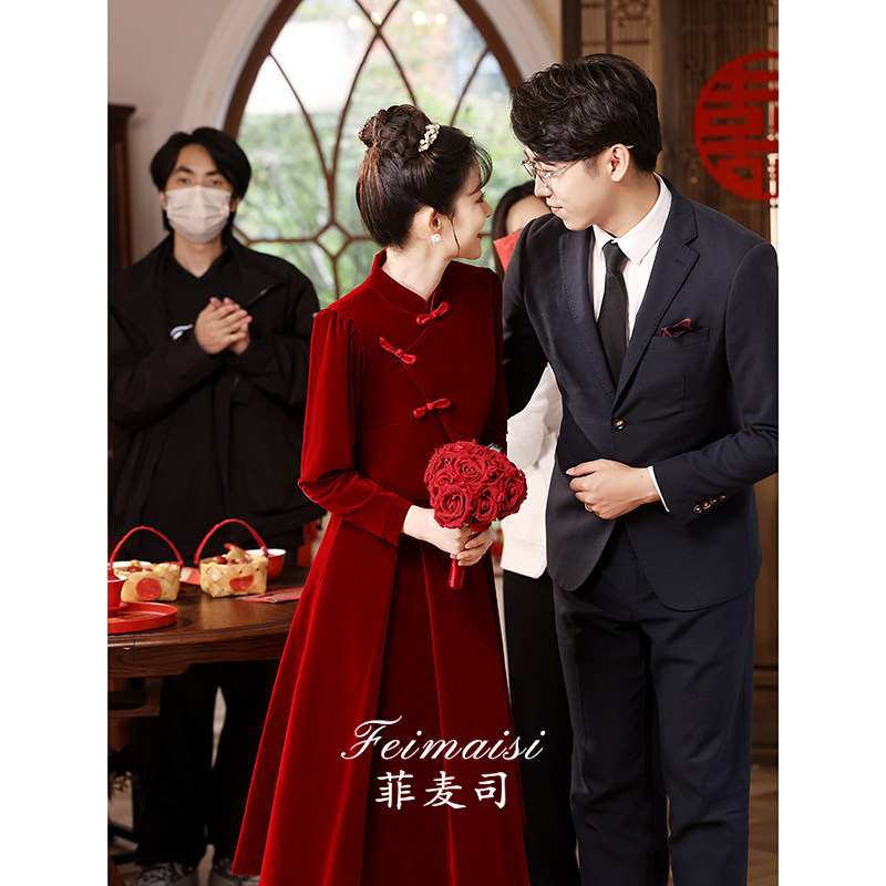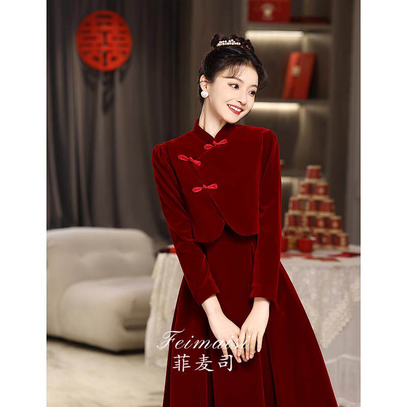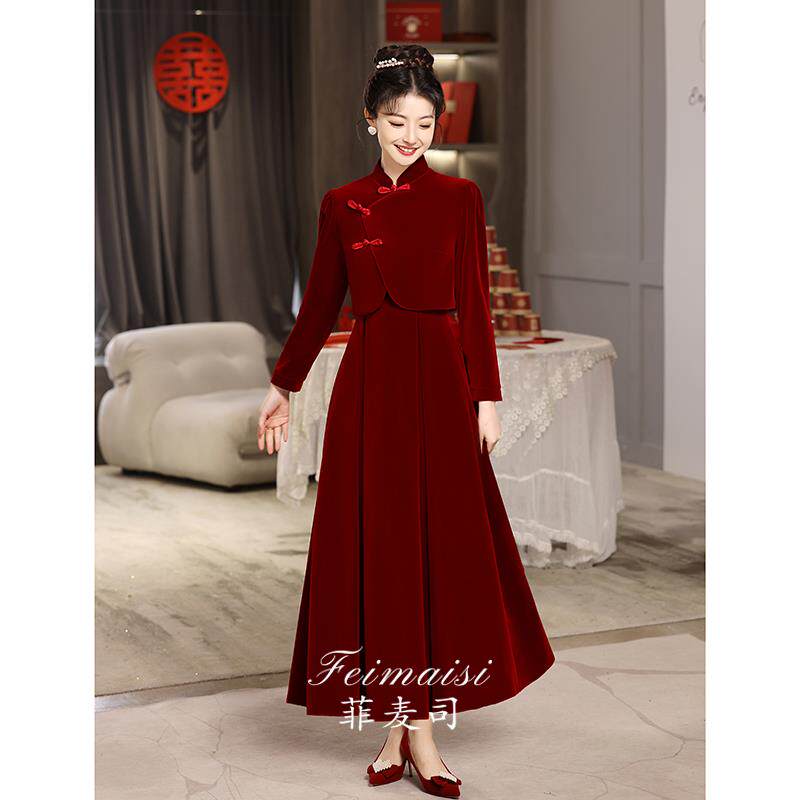 Вечернее платье, комплект, бордовое свадебное платье, бархатный традиционный свадебный наряд Сюхэ, ципао, китайский стиль