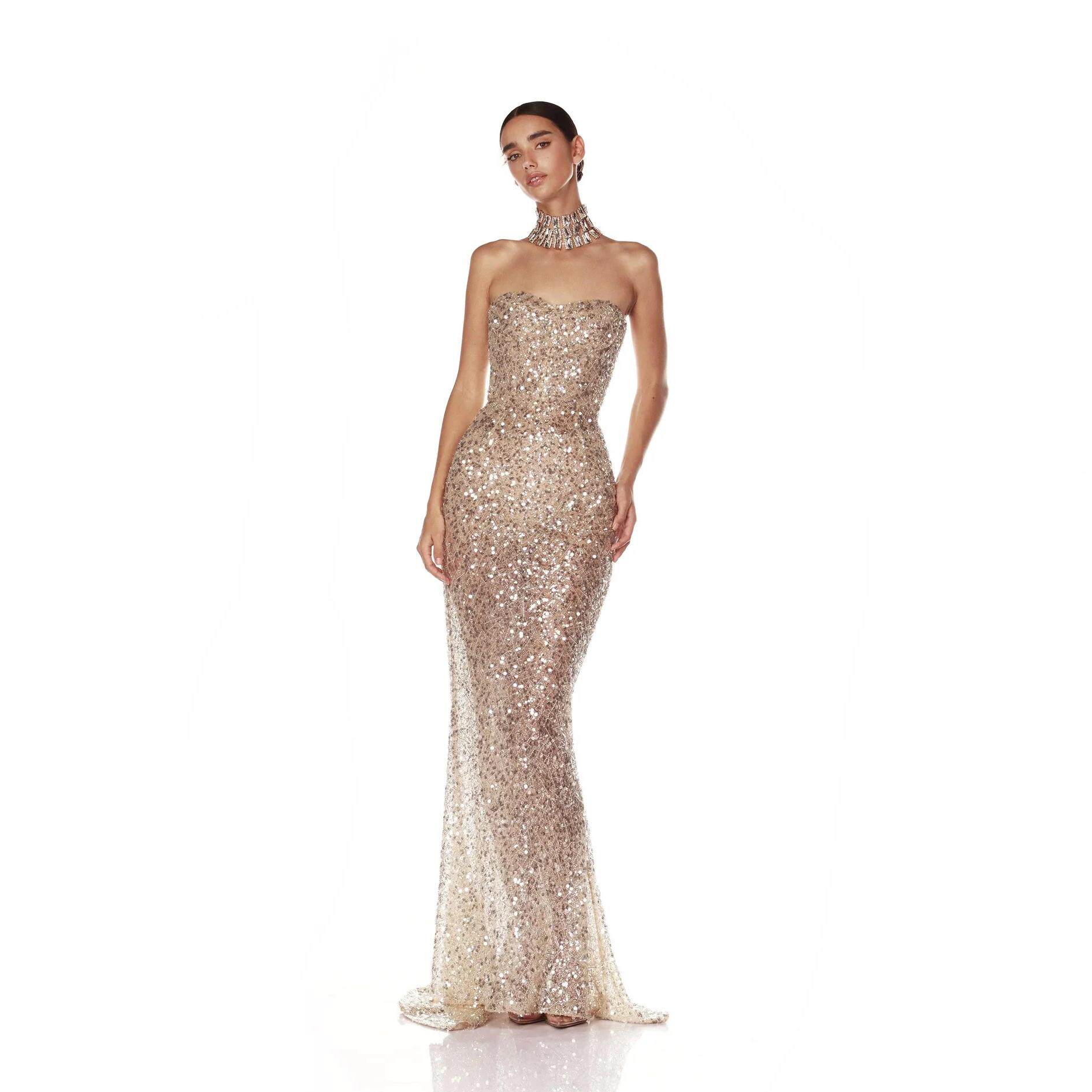 Золотой бюстгальтер-топ, платье, блестящая длинная юбка, изысканный стиль, крой «рыбий хвост»