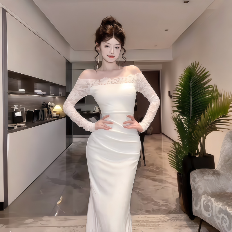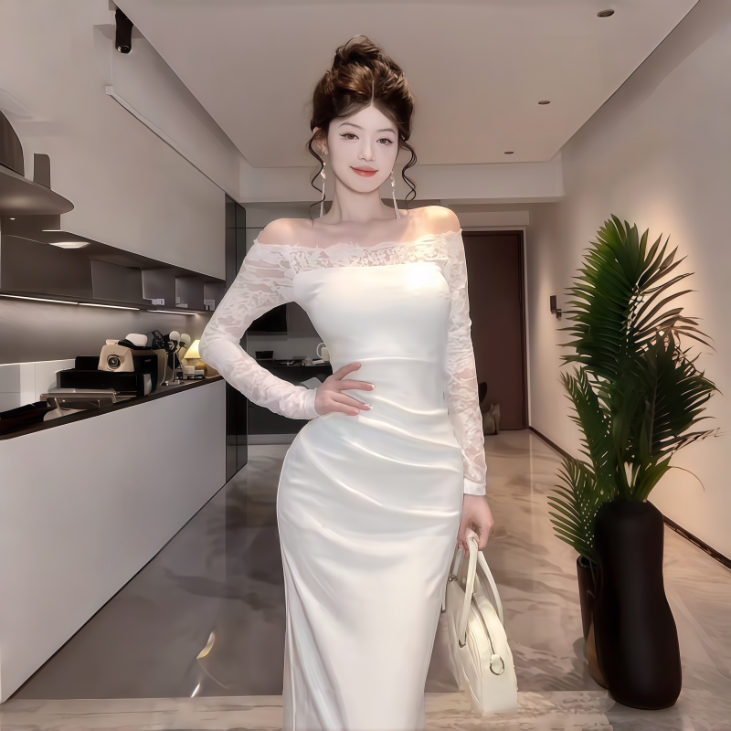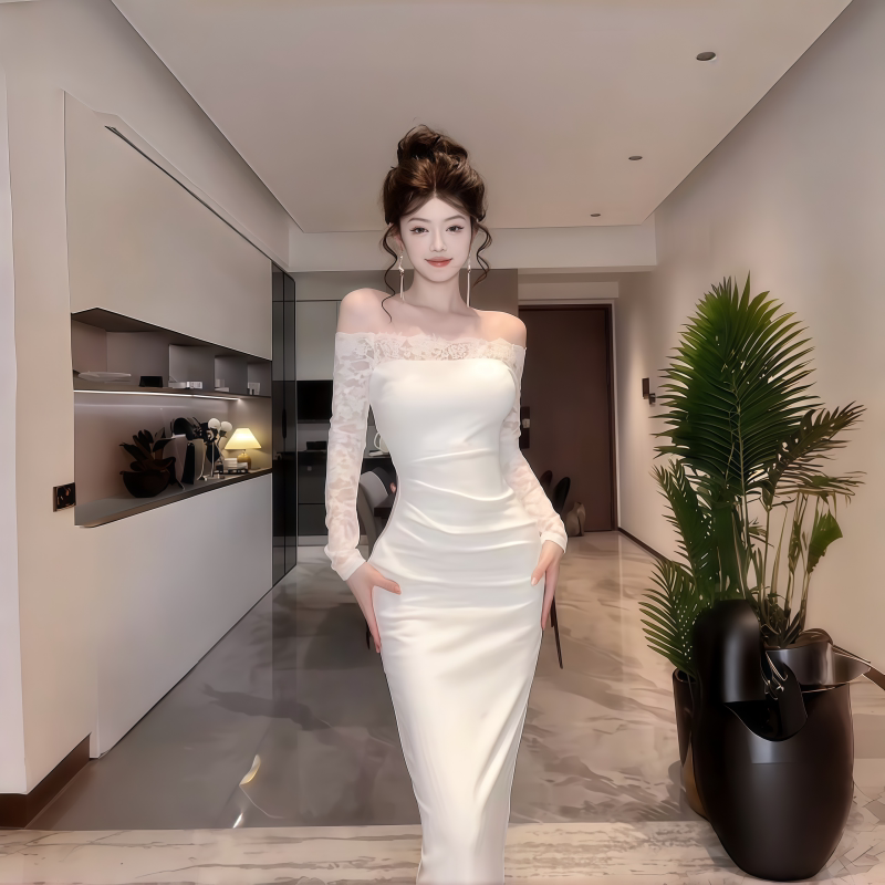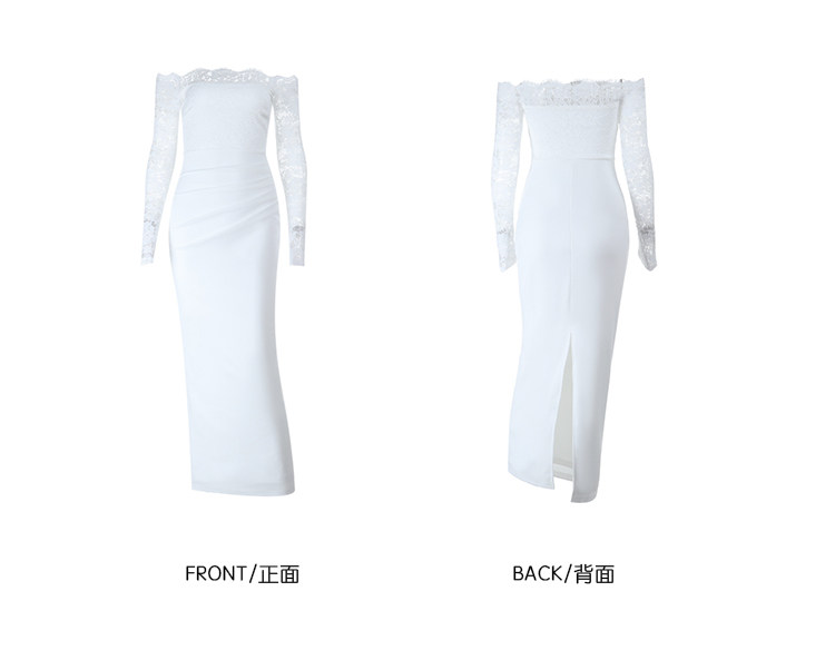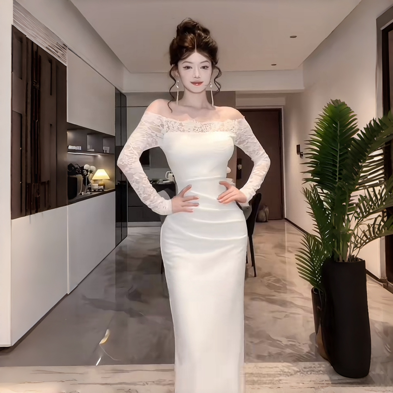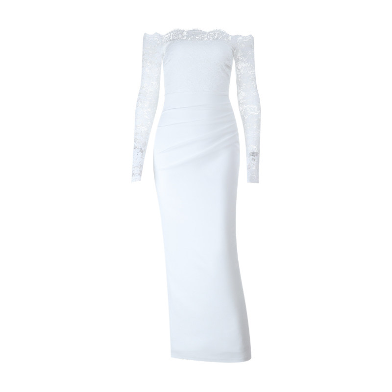 Сексуальный белый кружевной осенний лонгслив, приталенная длинная юбка, открытые плечи