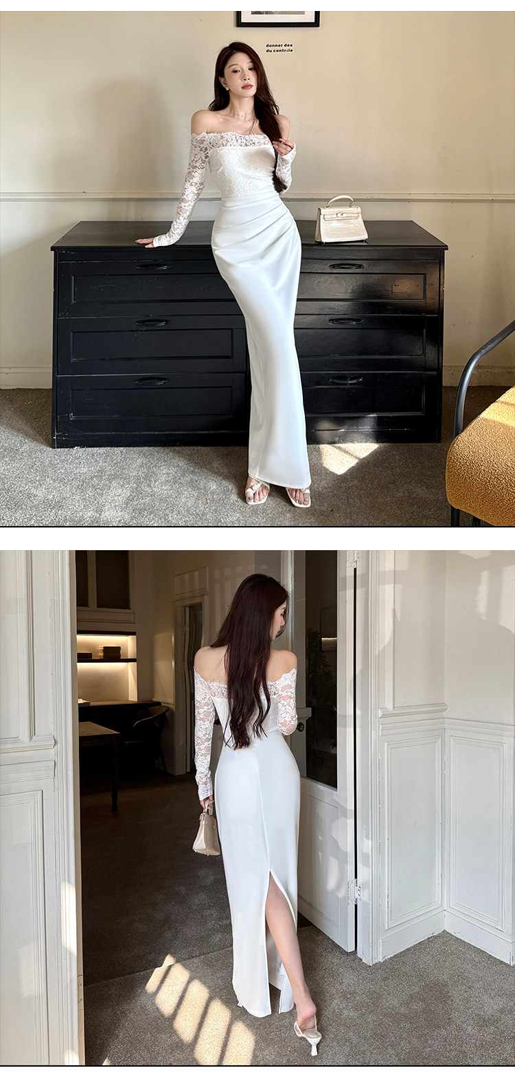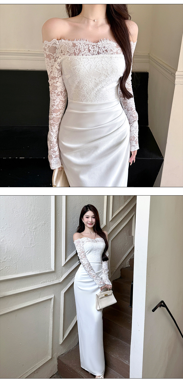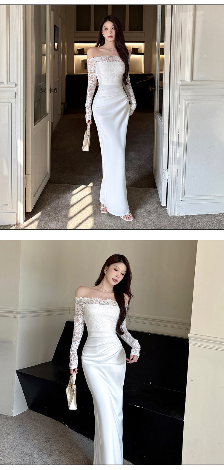 Сексуальный белый кружевной осенний лонгслив, приталенная длинная юбка, открытые плечи